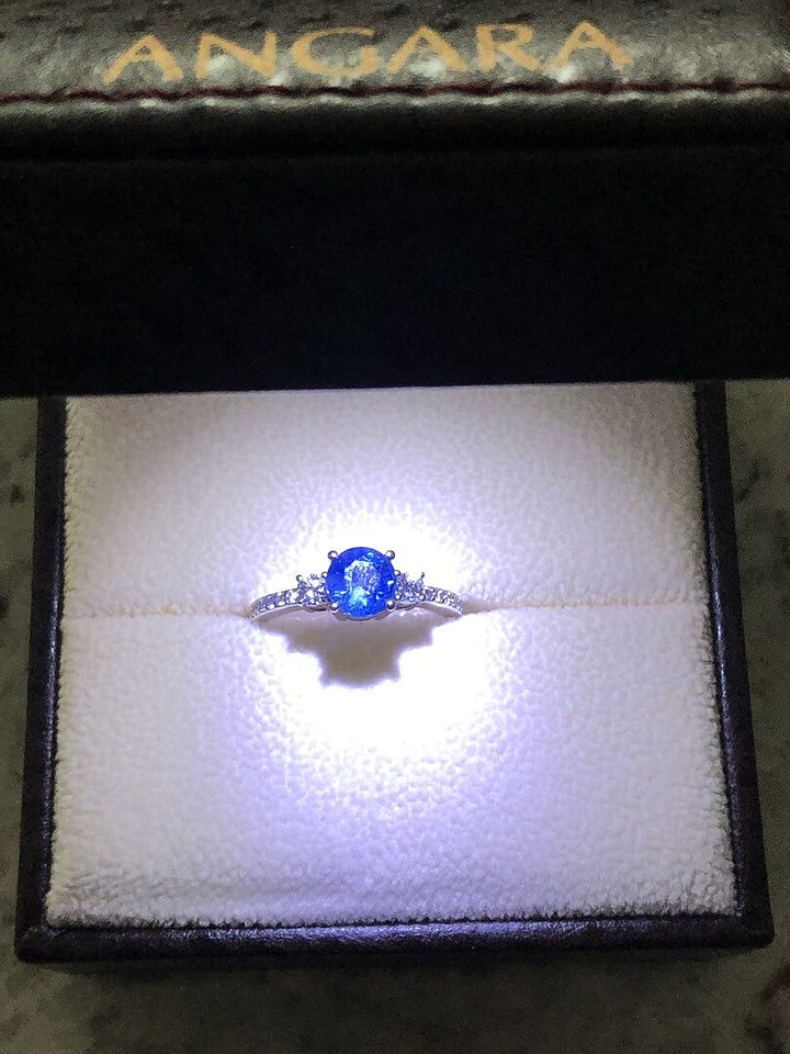 This Classic Three Stone Round Blue Sapphire and Diamond Engagement Ring by Angara combines elegance and tradition. The prong-set round blue sapphire (0.60 ct) commands attention, flanked by two brilliant diamonds, all set in 14k yellow gold. Pavé diamond accents embellish the lustrous shank, adding texture and sparkle. Symbolizing your past, present, and future together, this ring is a refined expression of love and commitment.