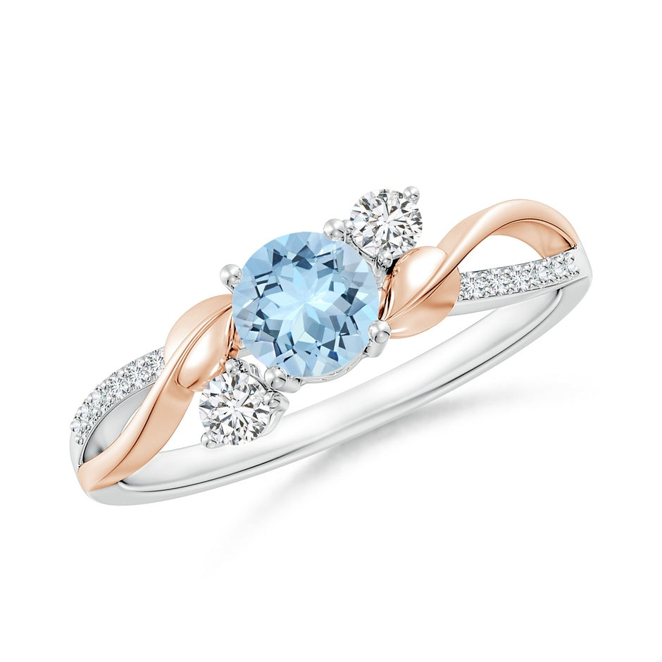 This Aquamarine and Diamond Twisted Vine Engagement Ring by Angara beautifully captures the symbolism of enduring love with a round aquamarine centerpiece framed by brilliant diamonds. The elegant twisted vine shank, partially adorned with diamonds, and delicate leaf motifs on the gallery add organic charm to the 18k white and rose gold band. A romantic choice for celebrating your unique love story with subtle sophistication.