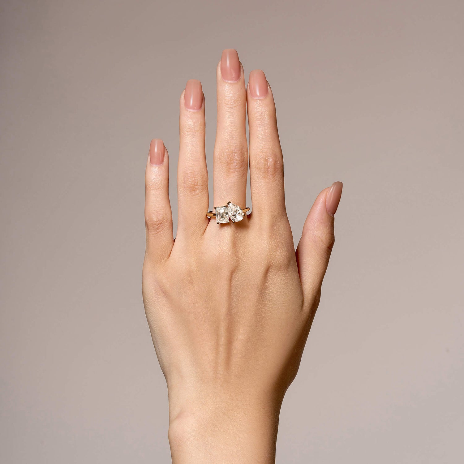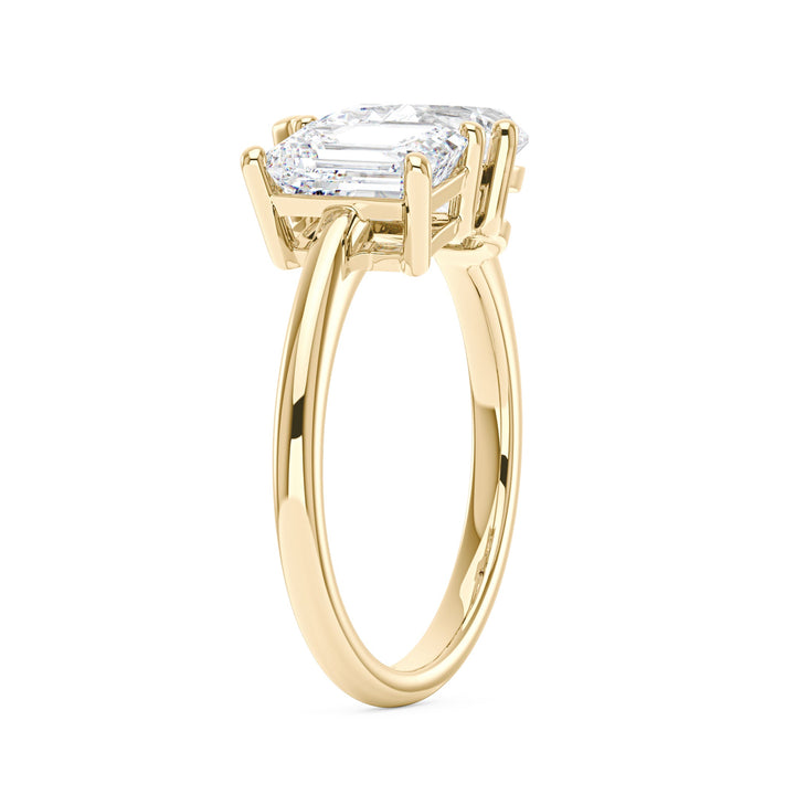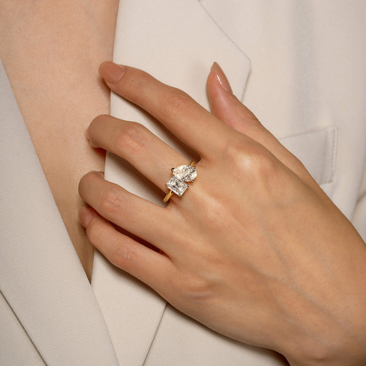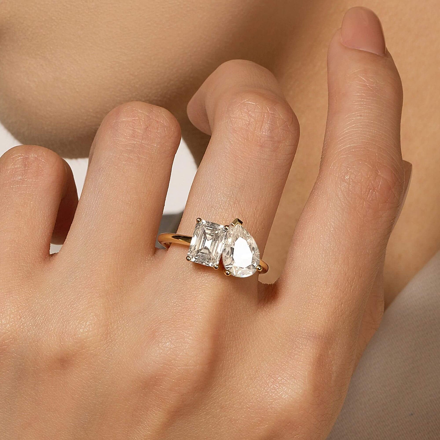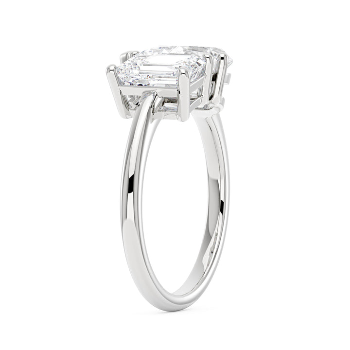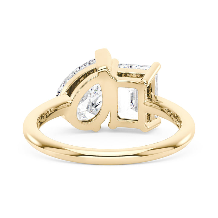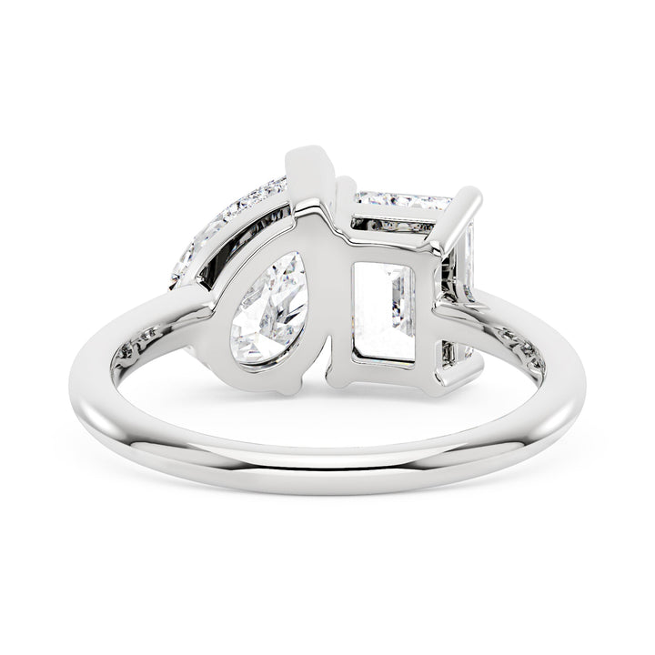 Handcrafted in 18K gold over S925 sterling silver. Stone 1: 2 ct colorless emerald-cut moissanite (6 mm x 8 mm), VVS1 clarity, E-F grade. Stone 2: 2 ct colorless pear-cut moissanite (7 mm x 10 mm), VVS1 clarity, E-F grade. Shank width: 1.8 mm; depth: 1.8 mm; base depth: 1.5 mm. Metal color: 18K white gold vermeil. Ring sizes 3–15 US.