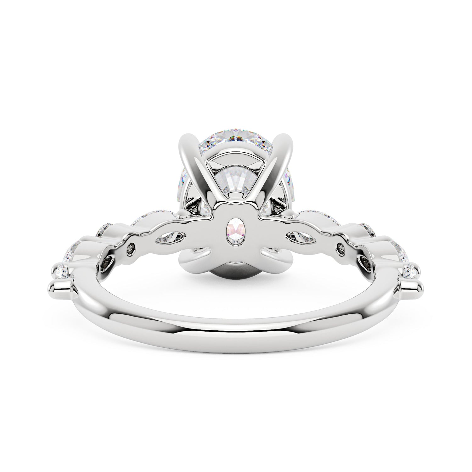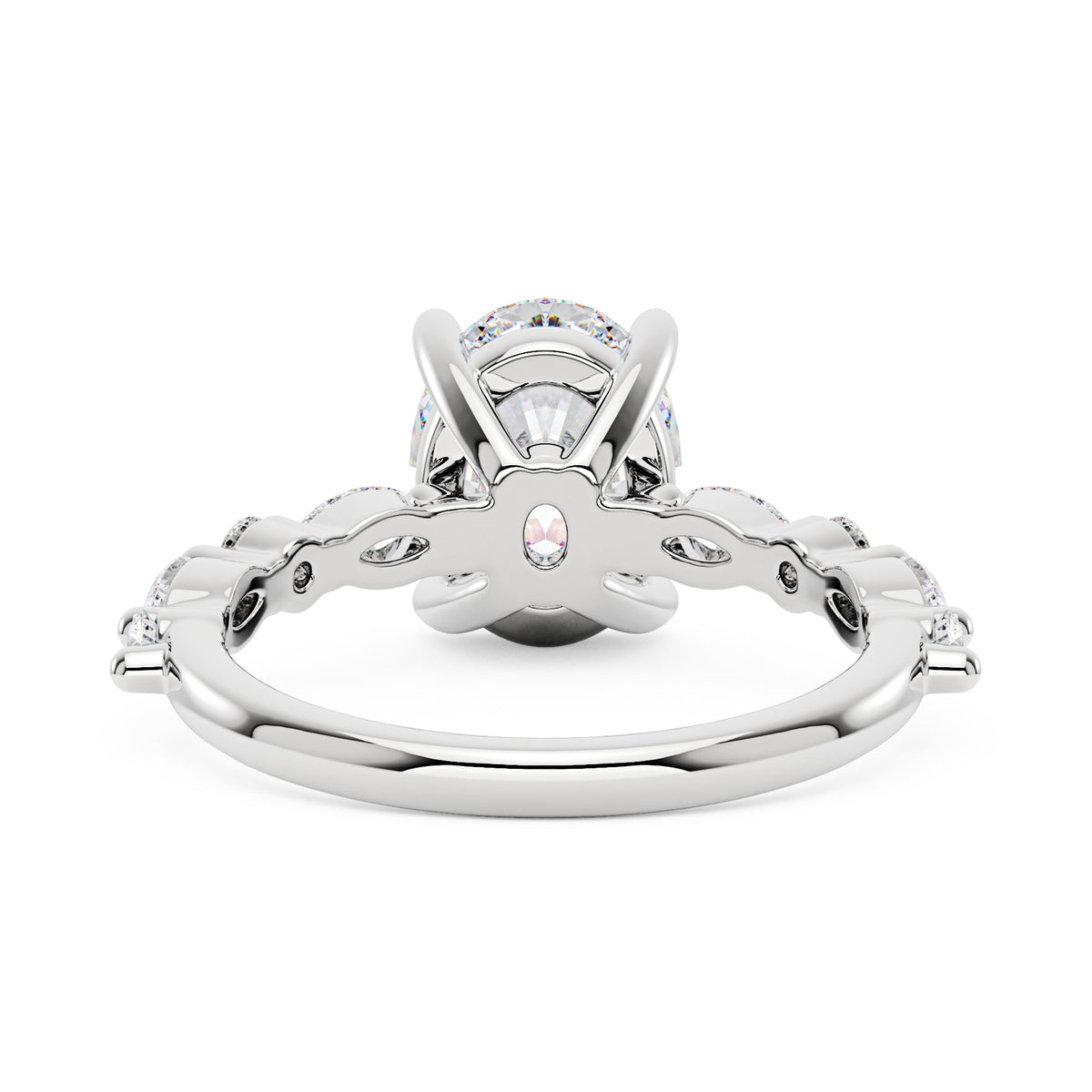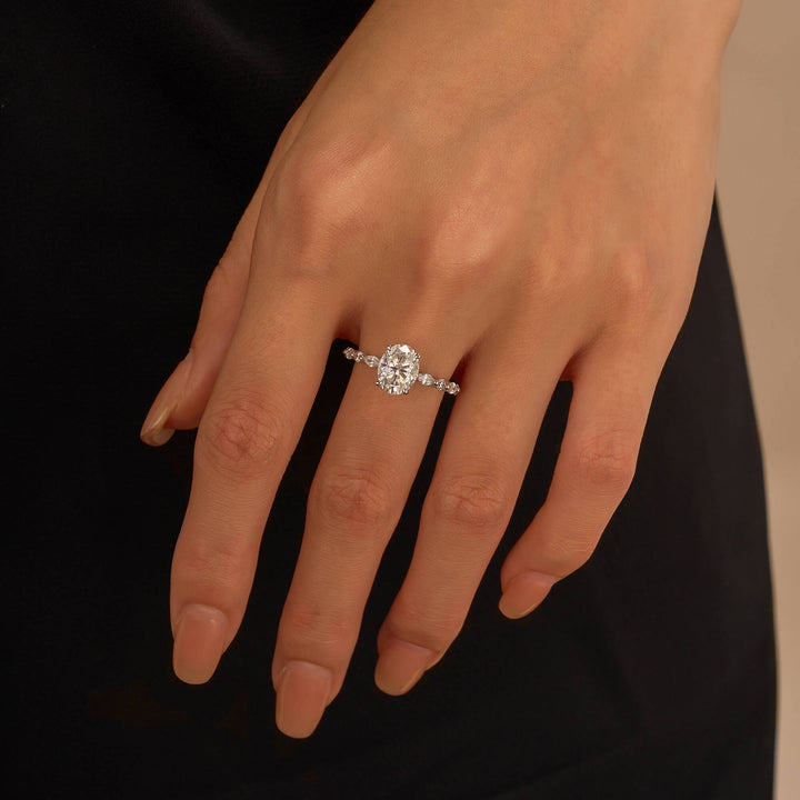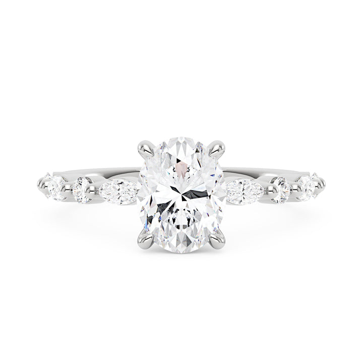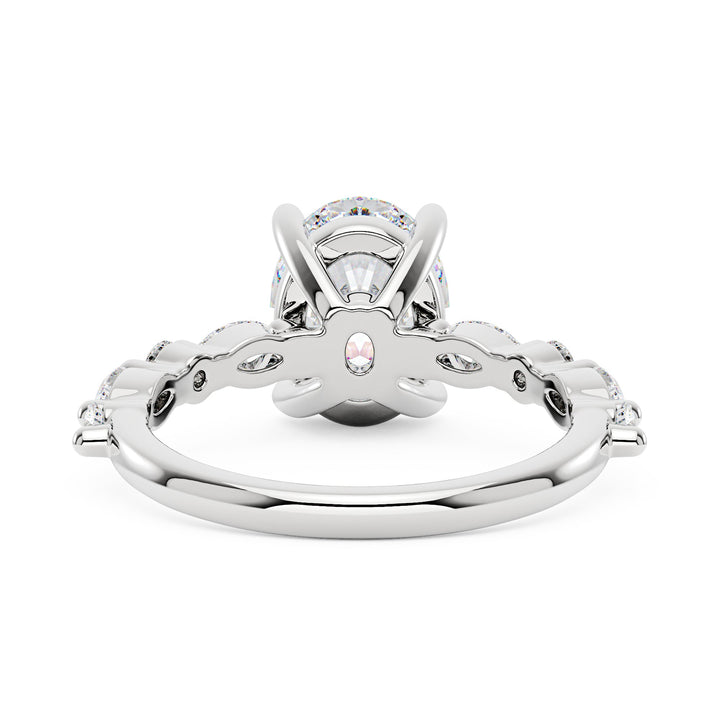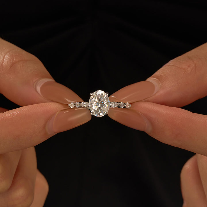 Handcrafted in 18K gold over S925 sterling silver. Center stone: 2 ct colorless oval moissanite (7 mm x 9 mm), VVS1 clarity, E-F grade. Side stones: 8 moissanites (marquise and round), colorless, E-F grade. Shank width: 2 mm; base width: 1.8 mm; depth: 2.1 mm; base depth: 1.7 mm. Metal color: 18K white gold vermeil. Ring sizes 3–15 US.