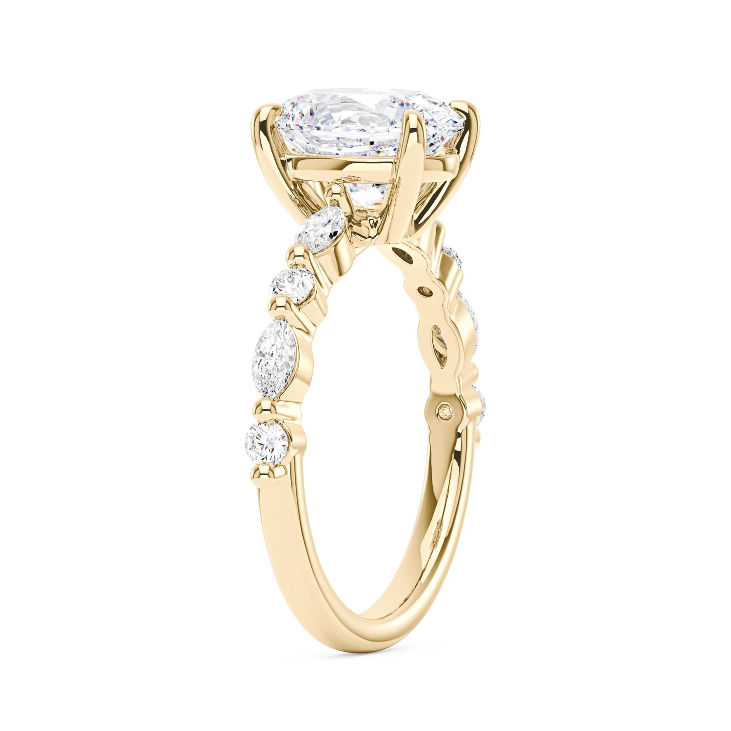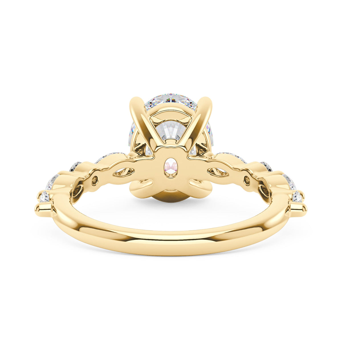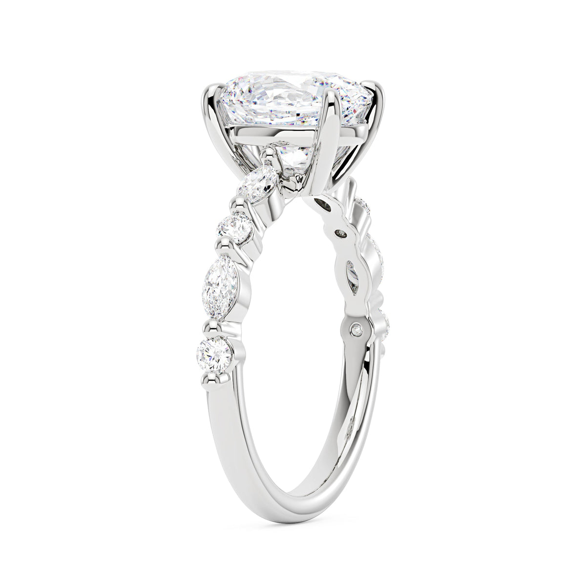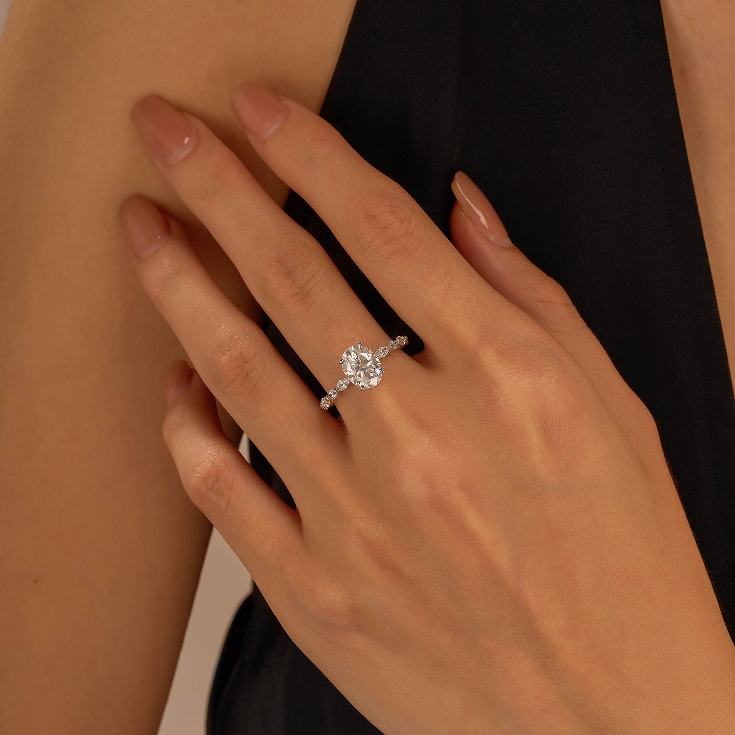 Handcrafted in 18K gold over S925 sterling silver. Center stone: 2 ct colorless oval moissanite (7 mm x 9 mm), VVS1 clarity, E-F grade. Side stones: 8 moissanites (marquise and round), colorless, E-F grade. Shank width: 2 mm; base width: 1.8 mm; depth: 2.1 mm; base depth: 1.7 mm. Metal color: 18K white gold vermeil. Ring sizes 3–15 US.