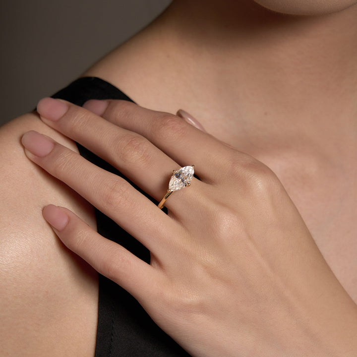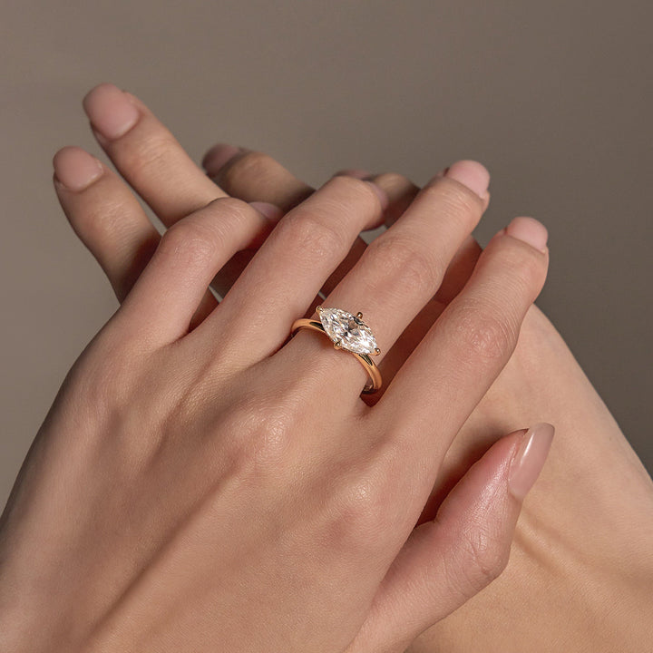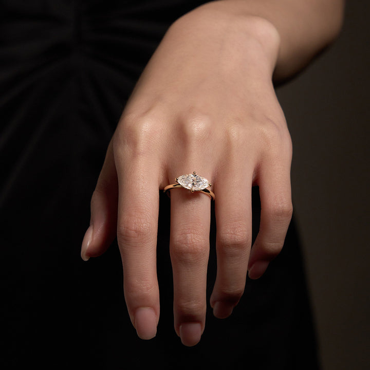 This 3 Carat Marquise Moissanite East West Solitaire Ring by EPI Jewelry reimagines a classic solitaire with a bold, east-west orientation. The horizontal marquise-cut stone elongates the finger and adds a distinct modern flair, offering a sleek statement of love that’s both minimalist and refined.