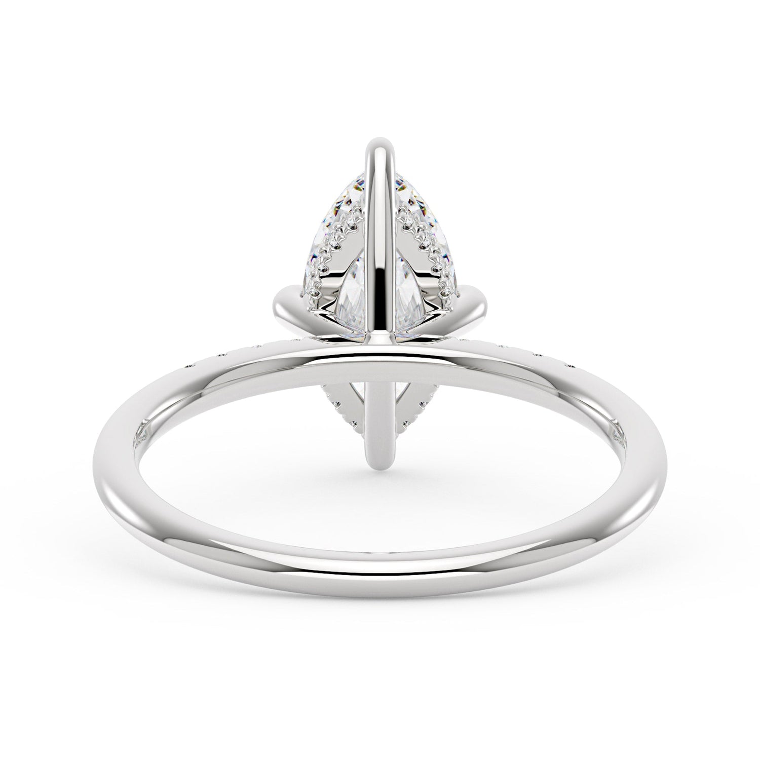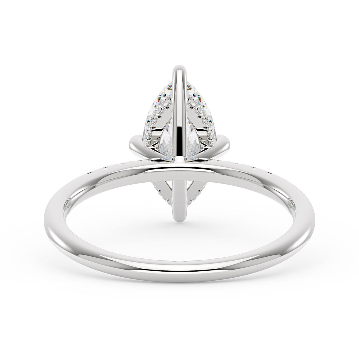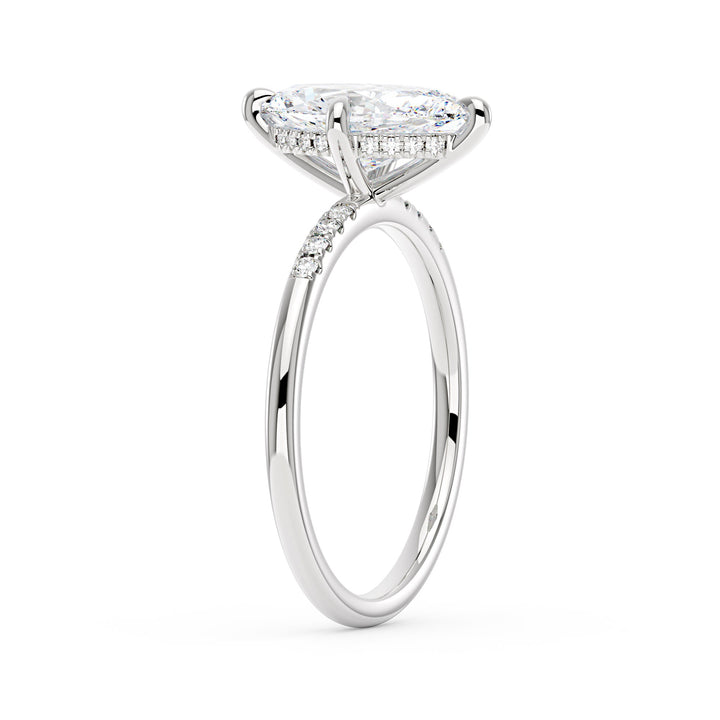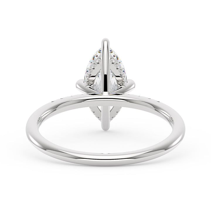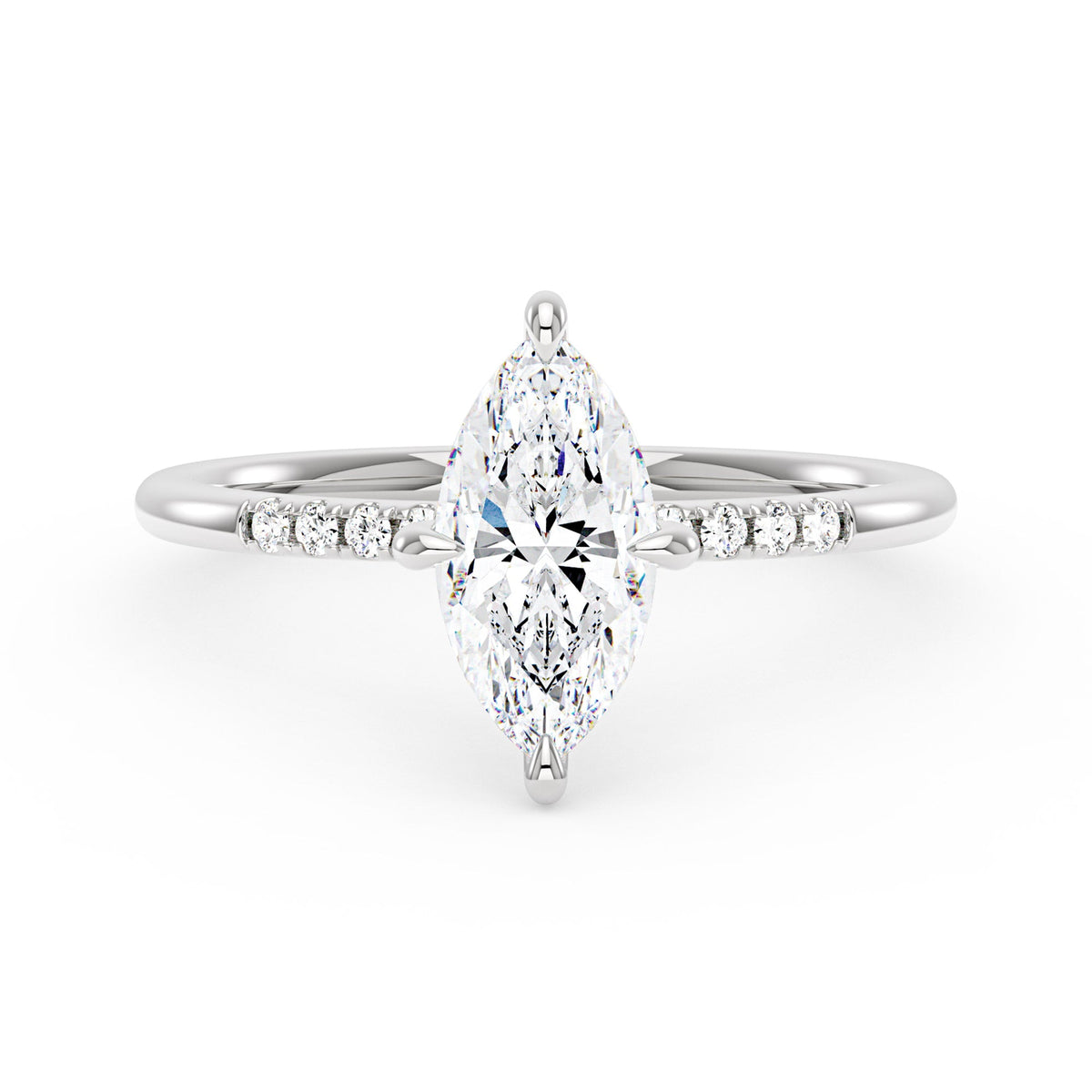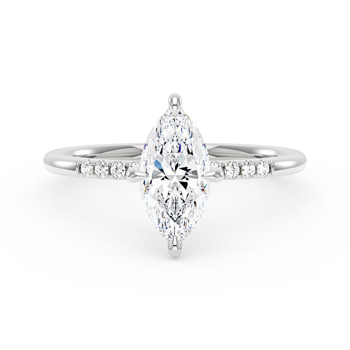 Handcrafted in 18K gold over S925 sterling silver. Center stone: 2 ct colorless marquise moissanite (6 mm x 12 mm), VVS1 clarity, E-F grade. Pavé accents: 8 round colorless moissanites (1.4 mm), total 0.1 ct. Shank width/base width: 1.8 mm; shank/base depth: 1.8 mm/1.4 mm. Metal color: 18K white gold vermeil. Sizes 3–15 US.