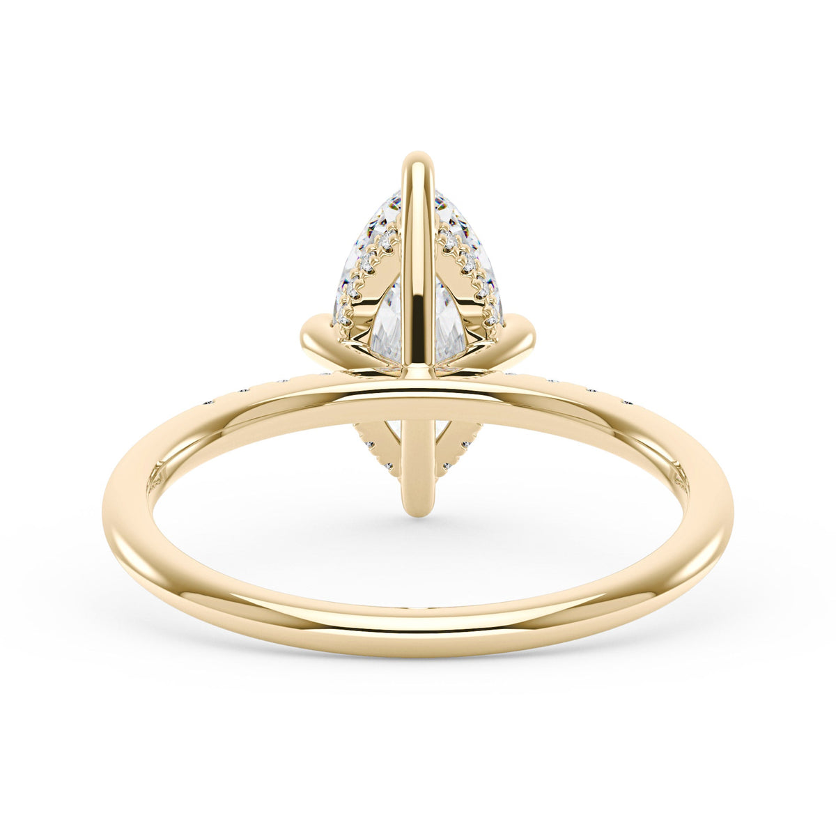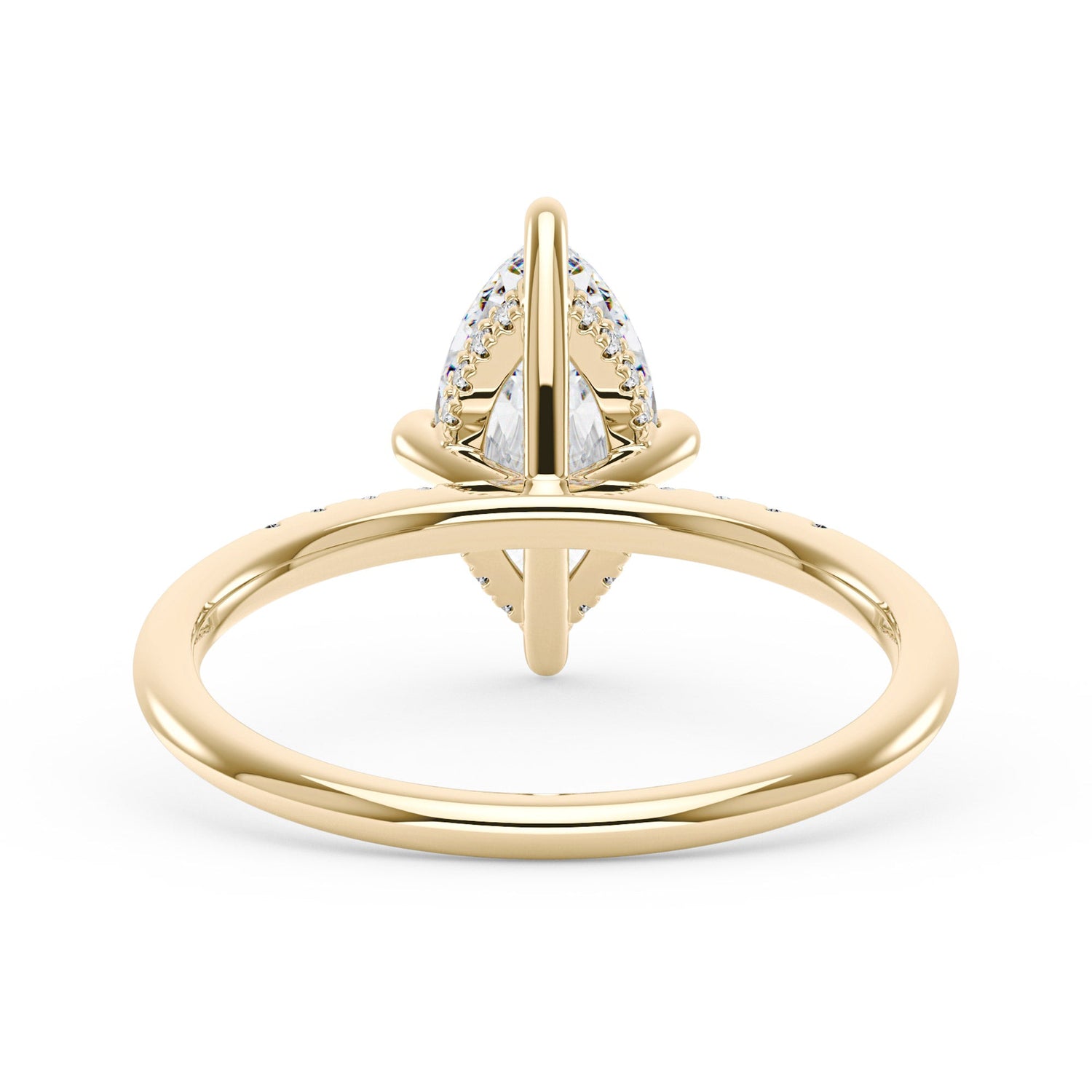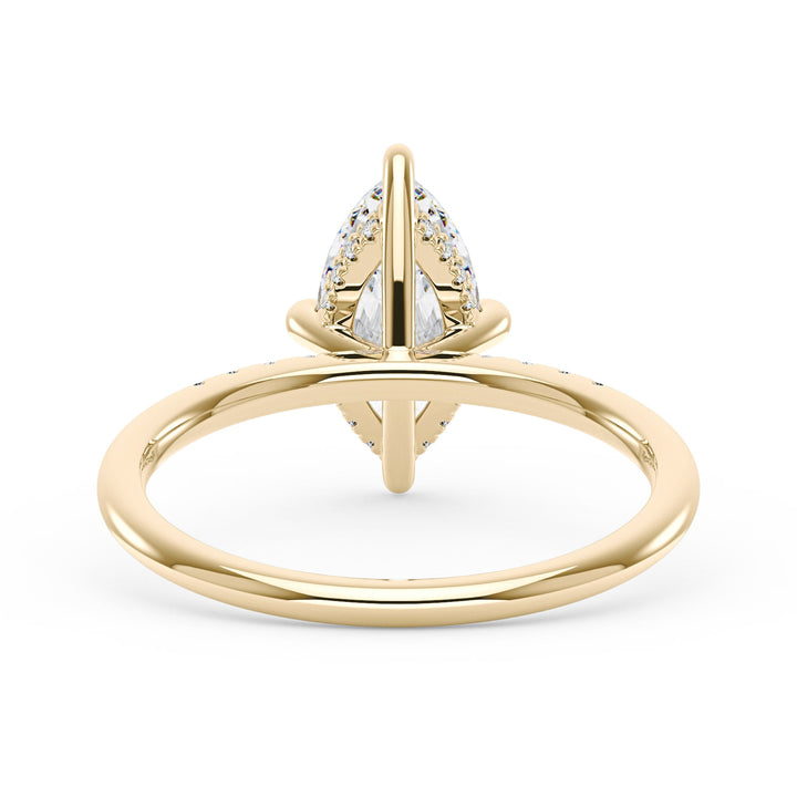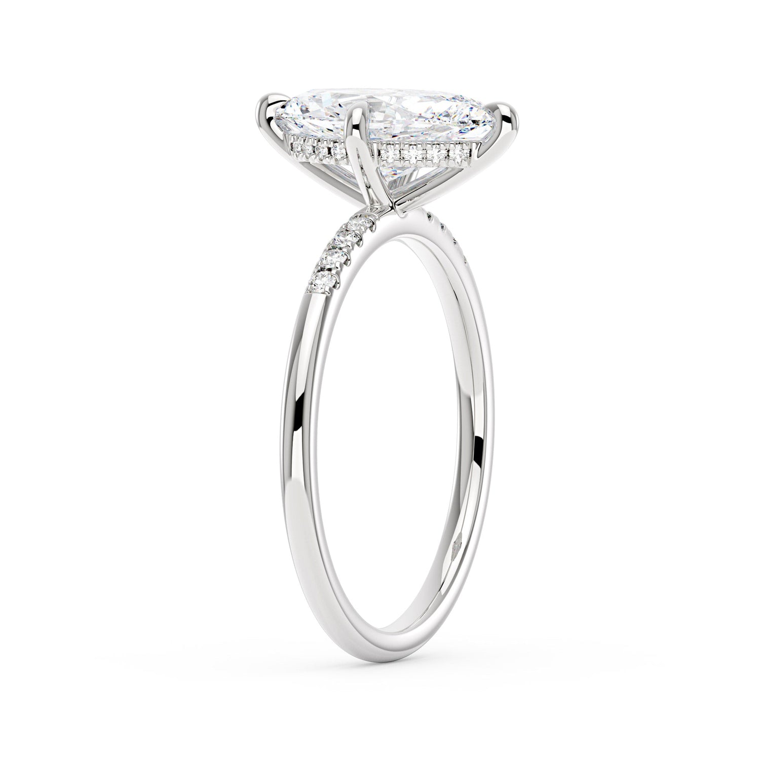 Handcrafted in 18K gold over S925 sterling silver. Center stone: 2 ct colorless marquise moissanite (6 mm x 12 mm), VVS1 clarity, E-F grade. Pavé accents: 8 round colorless moissanites (1.4 mm), total 0.1 ct. Shank width/base width: 1.8 mm; shank/base depth: 1.8 mm/1.4 mm. Metal color: 18K white gold vermeil. Sizes 3–15 US.