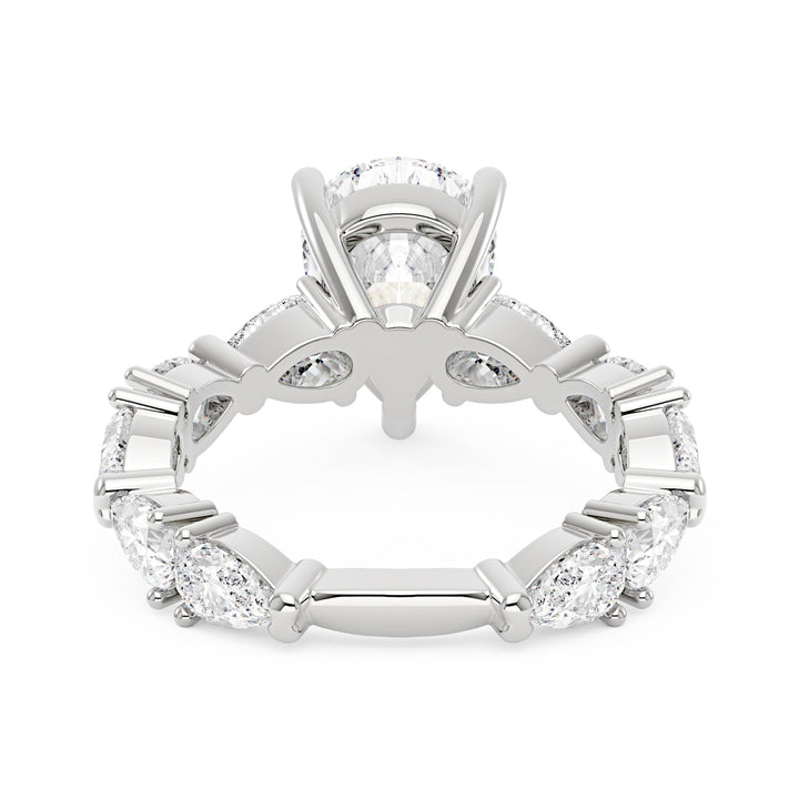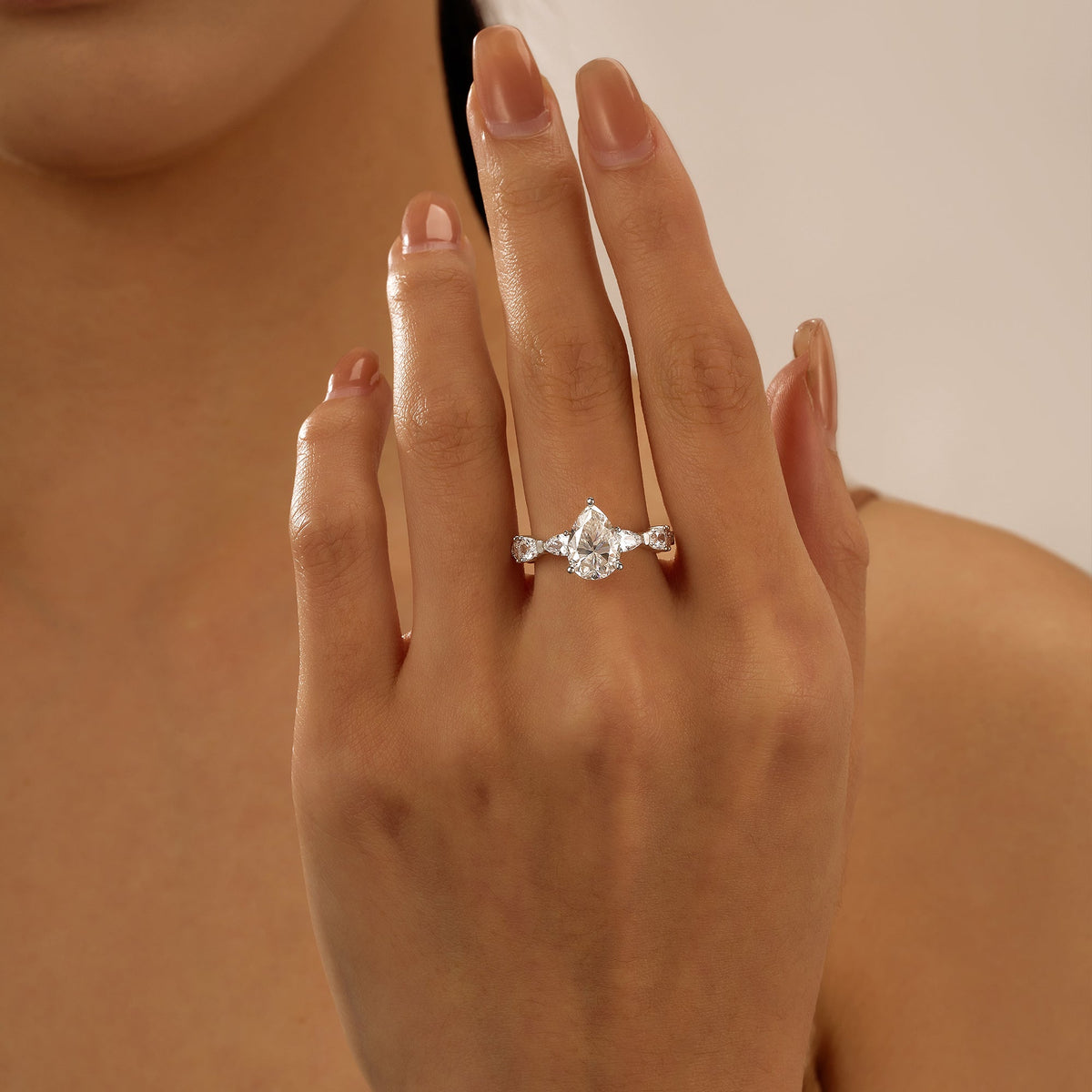 Handcrafted in 18K gold over S925 sterling silver. Center stone: 2 ct colorless pear moissanite (7 mm x 10 mm), VVS1 clarity, E-F grade. Accent stones: pear-shaped moissanites (3 mm x 5 mm). Shank width: 3.9 mm; depth: 2.4 mm; base depth: 1.7 mm. Metal color: 18K white gold vermeil. Sizes 3–15 US.