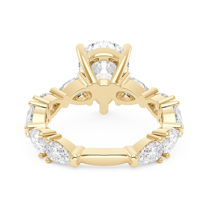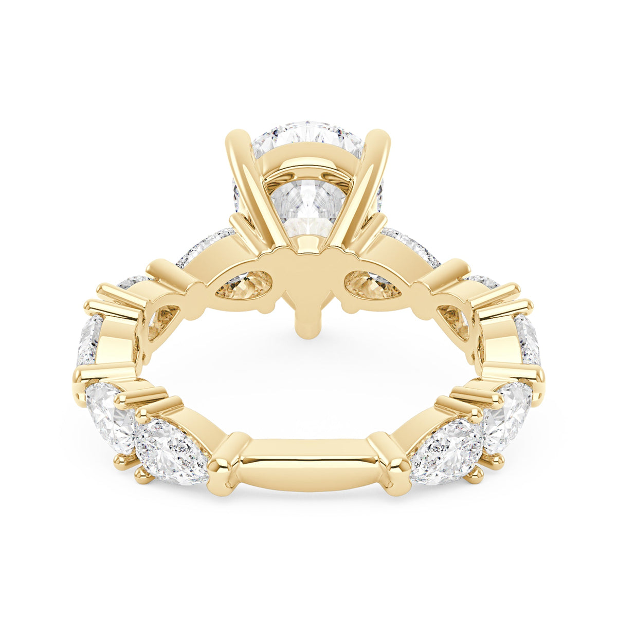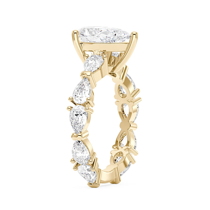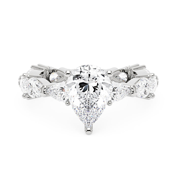 This 2 Carat Nature Inspired Pear Cut Moissanite Ring with Full Accent Stones by EPI Jewelry captivates with a radiant pear-shaped moissanite centerpiece set in a five-prong setting. The lustrous band sparkles with multiple pear-shaped moissanite accents, creating a harmonious flow that celebrates natural elegance and timeless craftsmanship.
