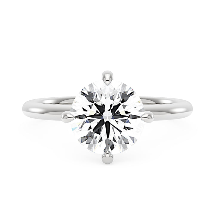 Handcrafted in 18K gold over S925 sterling silver. Center stone: 4 ct colorless round brilliant moissanite (10 mm x 10 mm), VVS1 clarity, E-F grade. Shank width: 2.1 mm; depth: 1.8 mm; base depth: 1.6 mm. Metal color: 18K white gold vermeil. Sizes 3–15 US.
