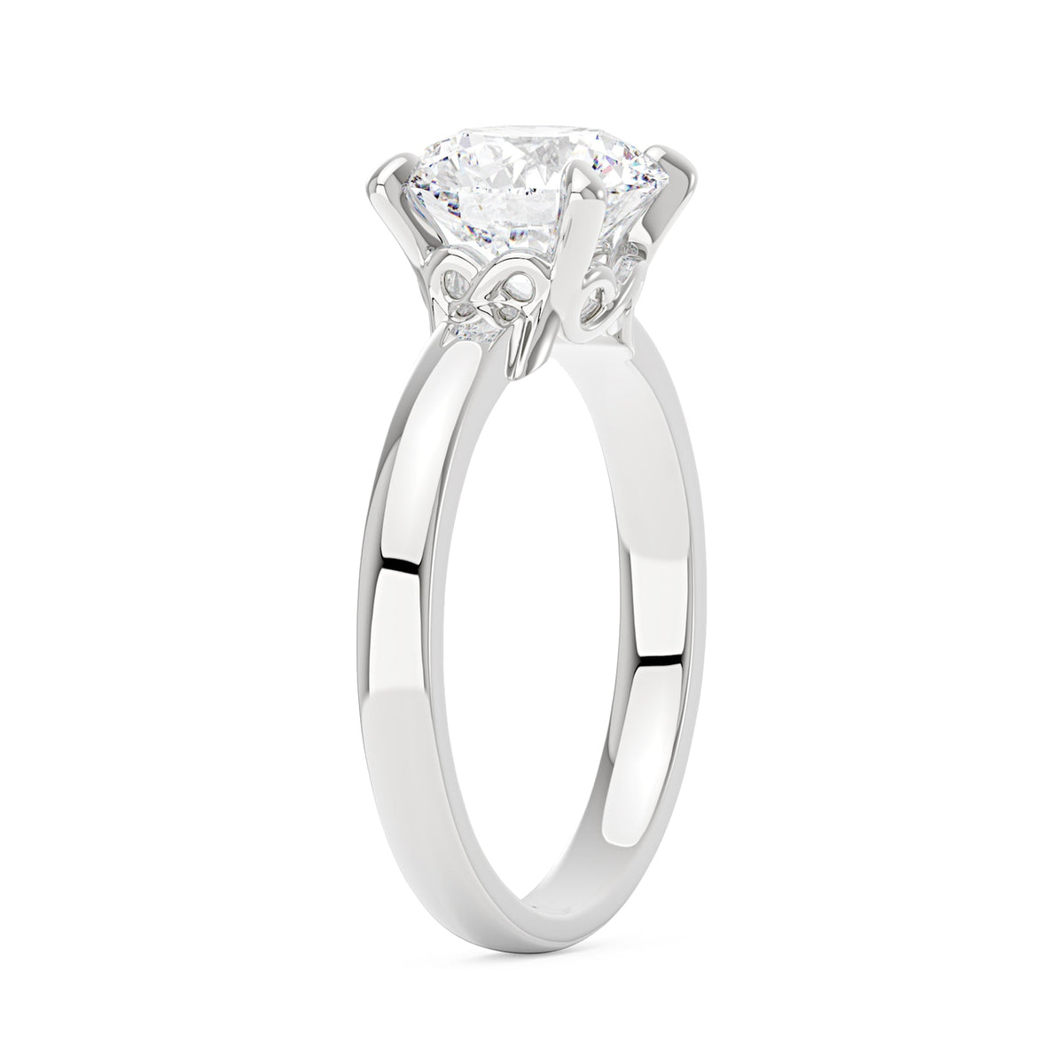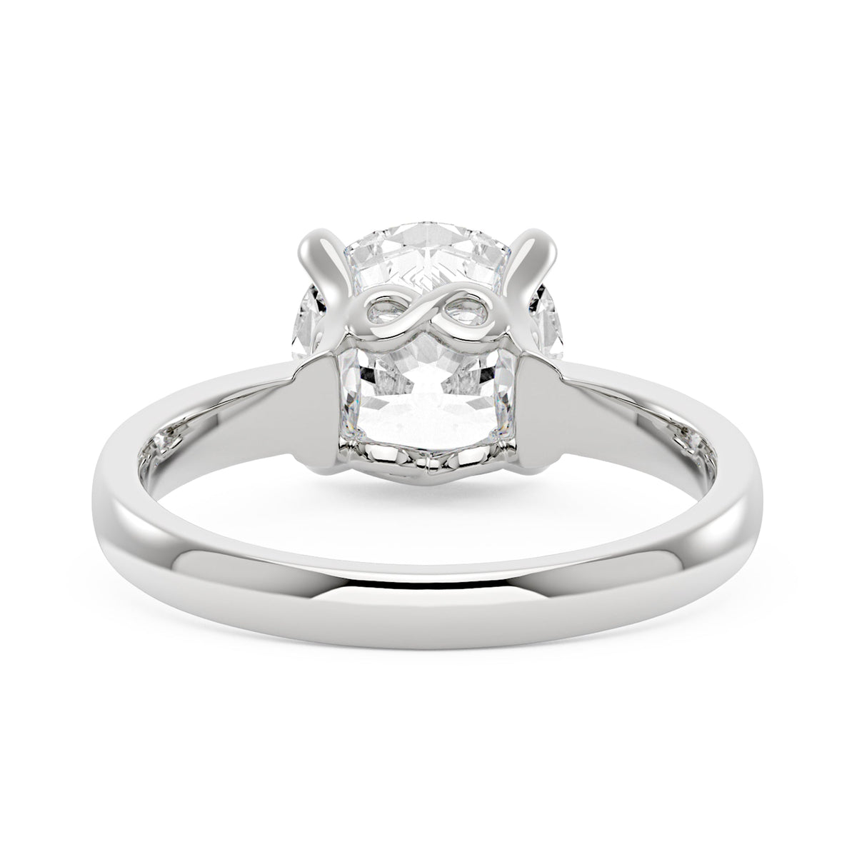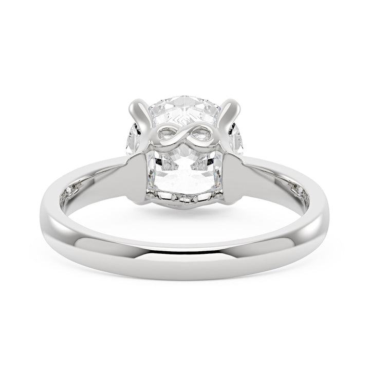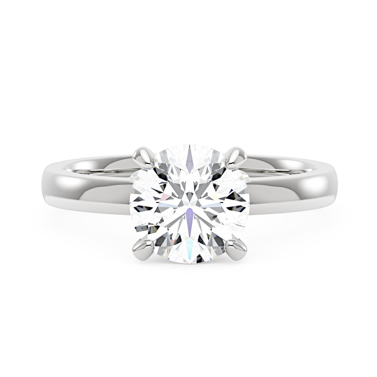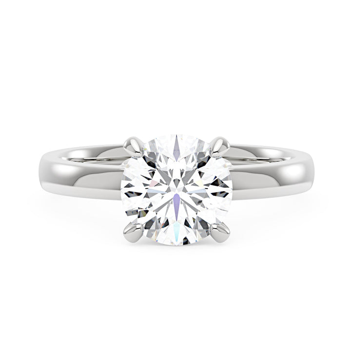 Handcrafted in 18K White Gold Vermeil on S925 Sterling Silver. Features a 2 ct round-cut moissanite measuring 8 mm. Shank dimensions: width 2.2 mm, depth varies from 1.2 mm to 1.4 mm.