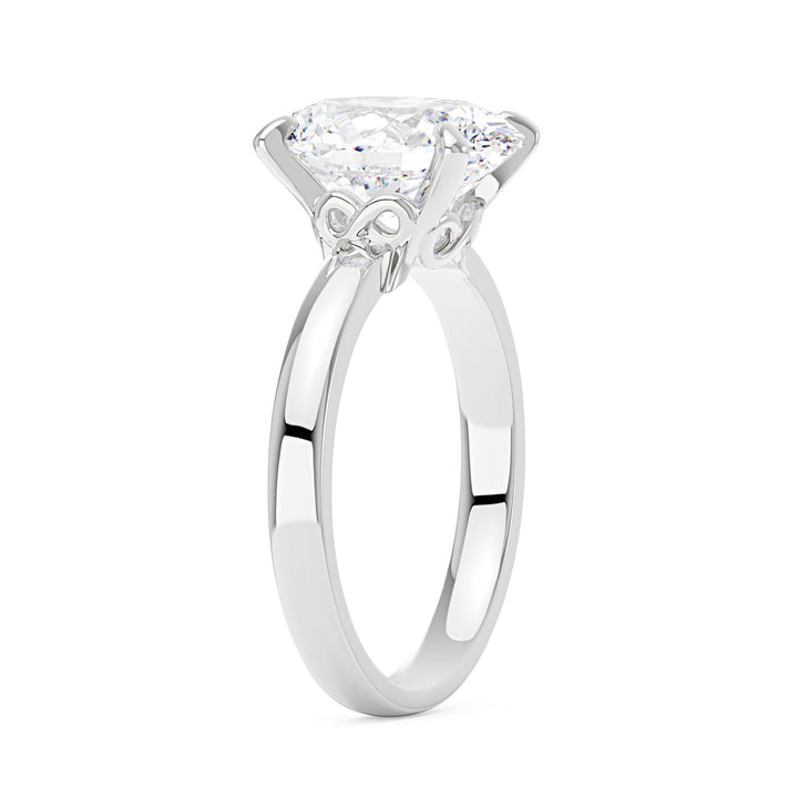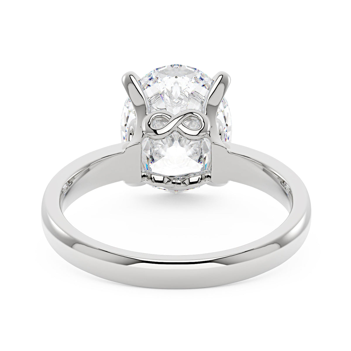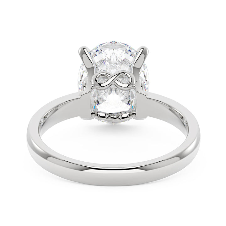 Handcrafted in 18K White Gold Vermeil on S925 Sterling Silver. Oval-cut moissanite weighs 3 ct, measuring 8 mm x 10 mm. Shank dimensions: width 2.2 mm, depth ranges from 1.2 mm to 1.4 mm.