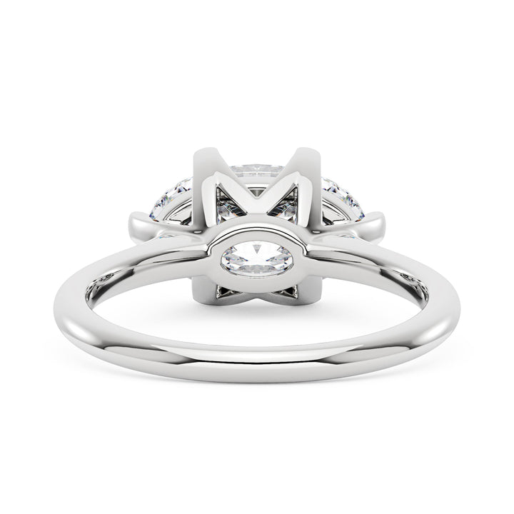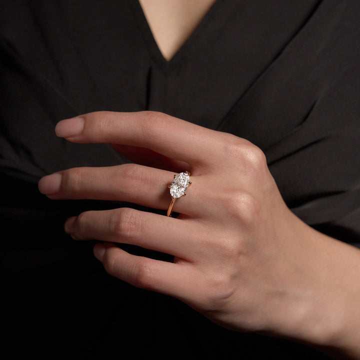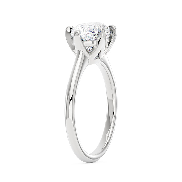 Handcrafted in 18K White Gold Vermeil over S925 Sterling Silver. Features a 4 ct elongated oval moissanite (7 x 12 mm). Shank width 1.9 mm, depth 1.8 mm, base depth 1.5 mm.