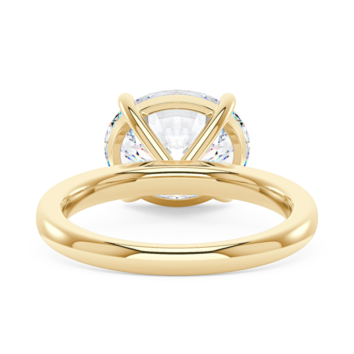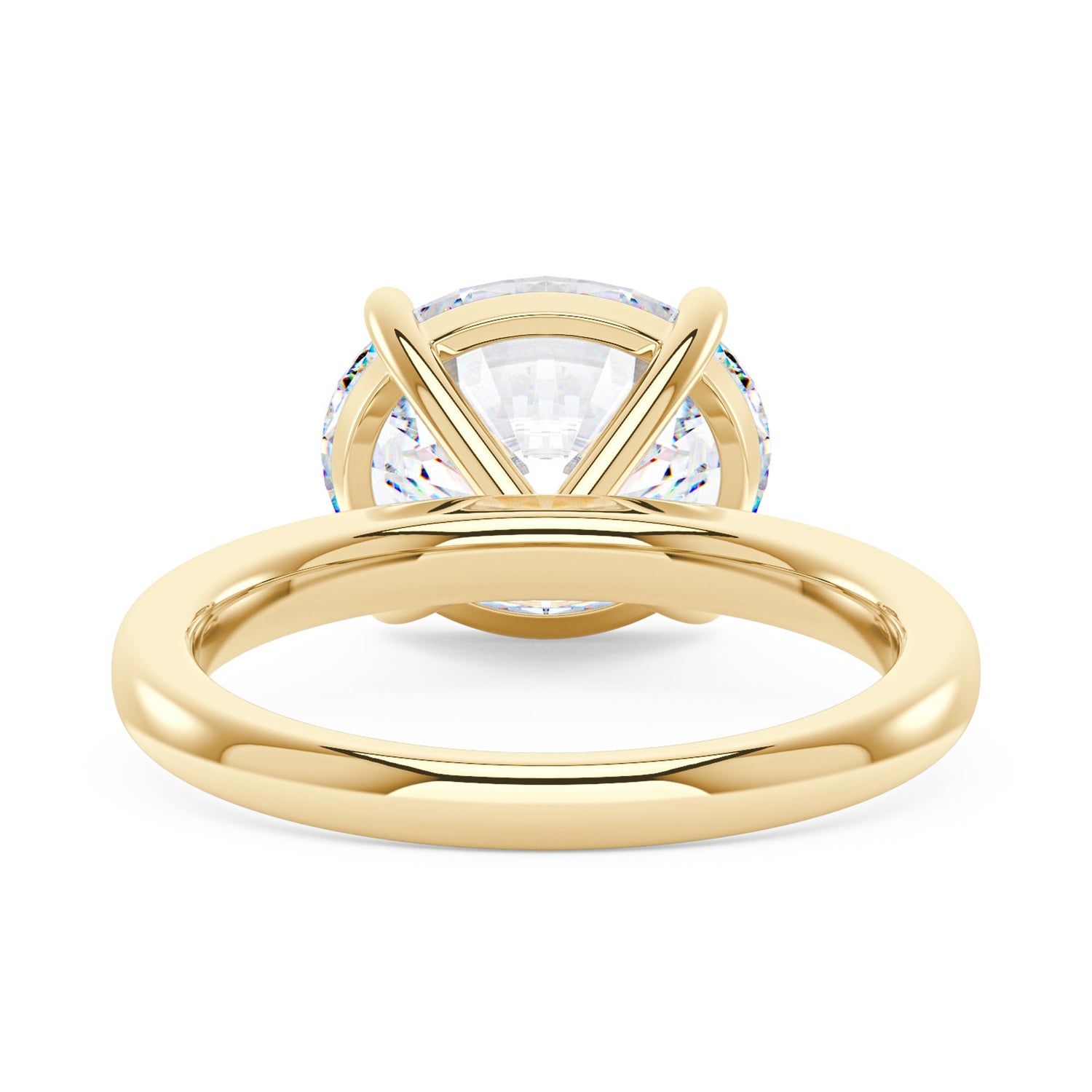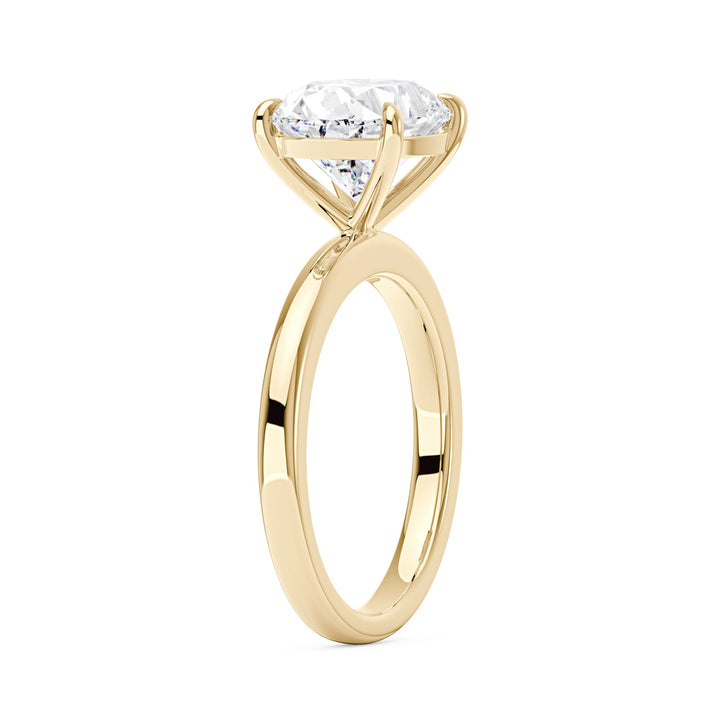 Handcrafted in 18K gold vermeil on S925 sterling silver. Center stone: 4 ct oval moissanite (8.5 mm x 10.5 mm), colorless, VVS1 clarity, E-F grade. Band dimensions: 2 mm shank width, 1.8 mm shank depth, 1.4 mm shank base depth. Sizes 3-15 US.