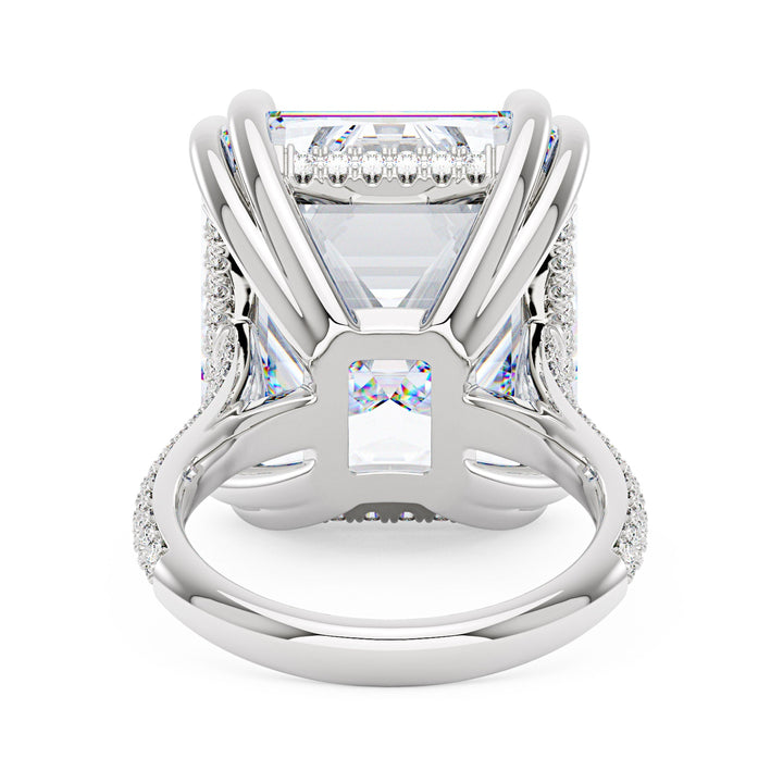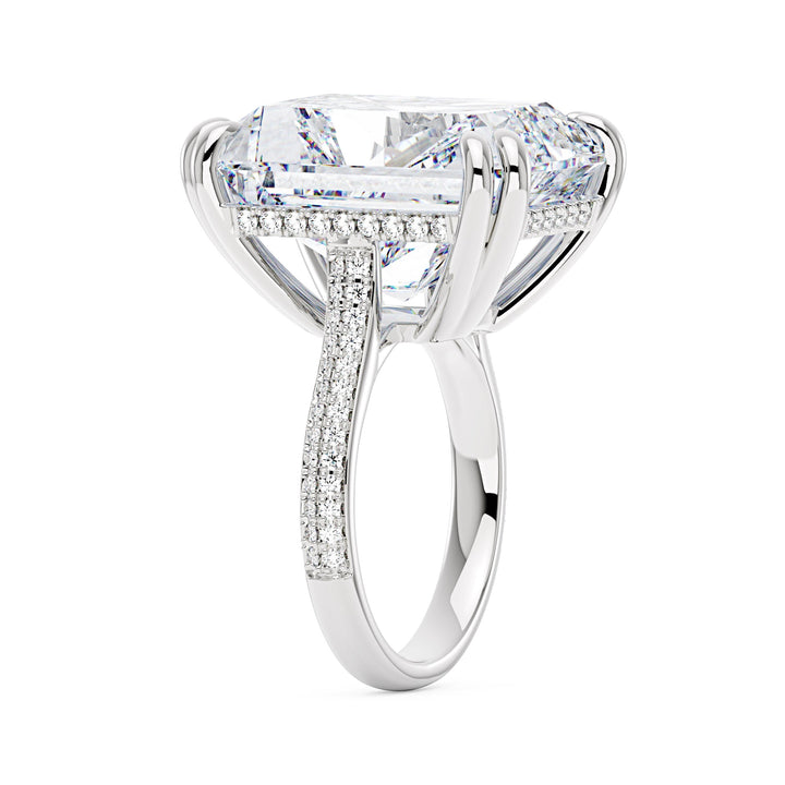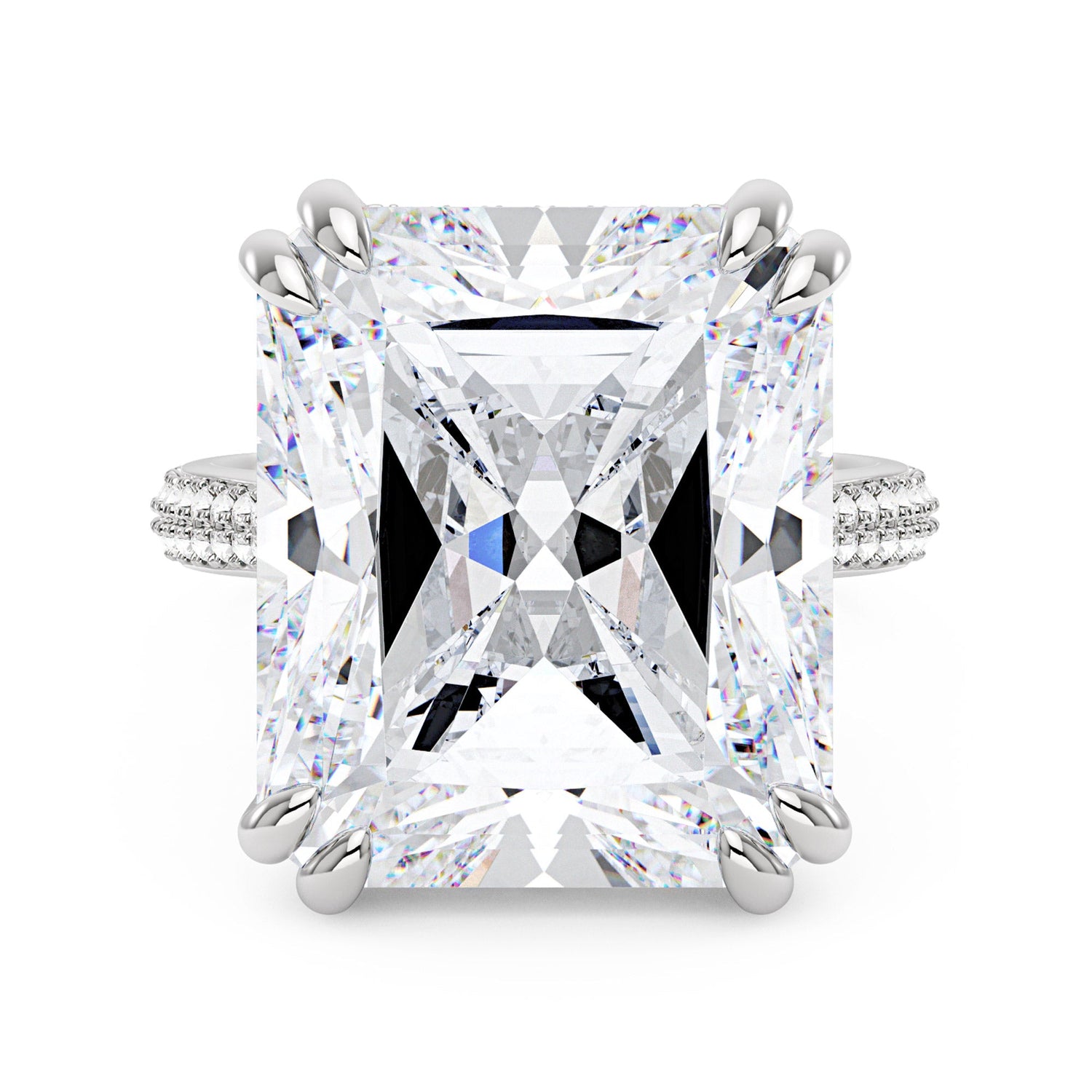 Handcrafted in 14K white gold. Center stone: 35 ct radiant-cut moissanite (17 mm x 20 mm), colorless, VVS1 clarity, E-F grade. Accent stones: 18 round pavé moissanite (1.5 mm), colorless. Band dimensions: 3 mm shank width, 2 mm shank depth, 1.8 mm shank base depth. Sizes 3-15 US.
