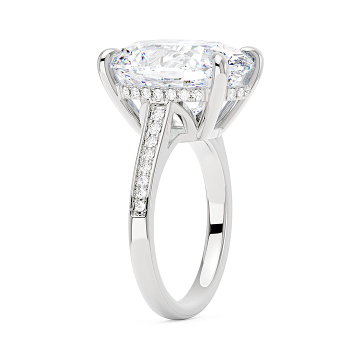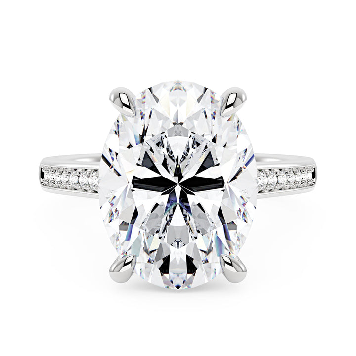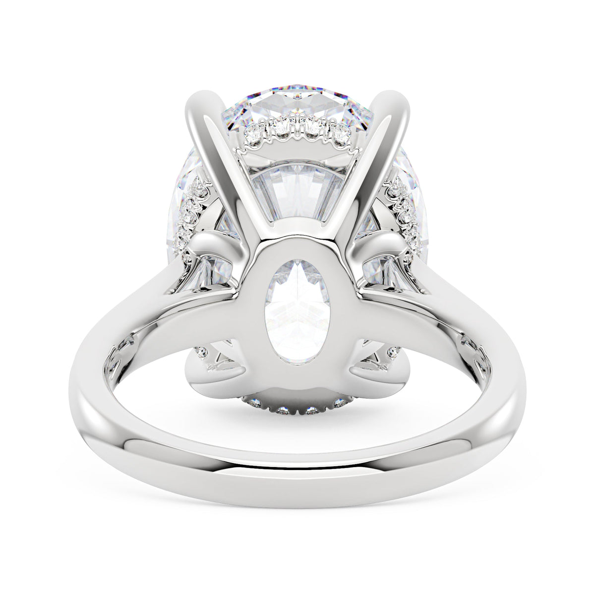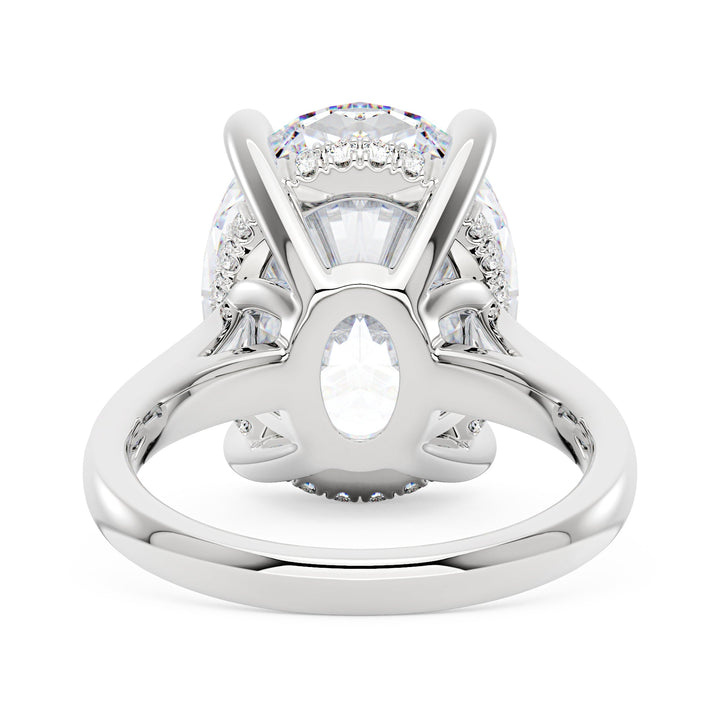 Handcrafted in 14K white gold. Center stone: 14 ct oval moissanite (13 mm x 17 mm), colorless, VVS1 clarity, E-F grade. Accent stones: 18 round pavé moissanite (1.5 mm), colorless. Band dimensions: 2.4 mm shank width, 2.3 mm shank base width, 1.9 mm shank depth, 1.8 mm shank base depth. Sizes 3-15 US.