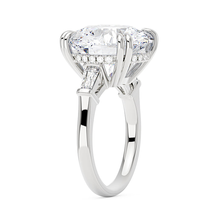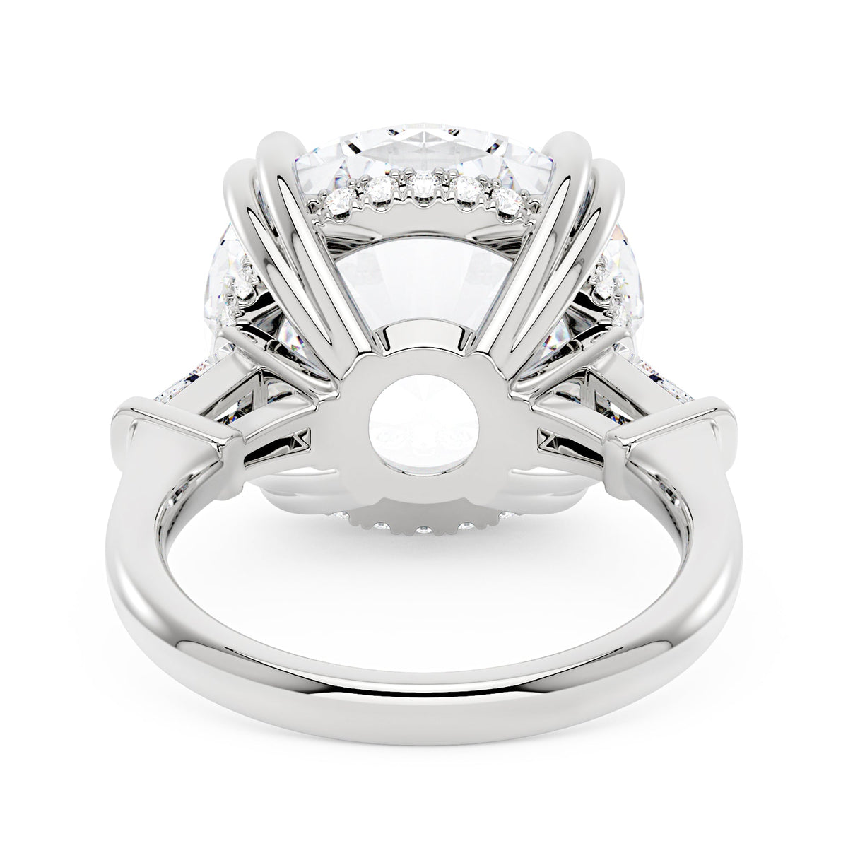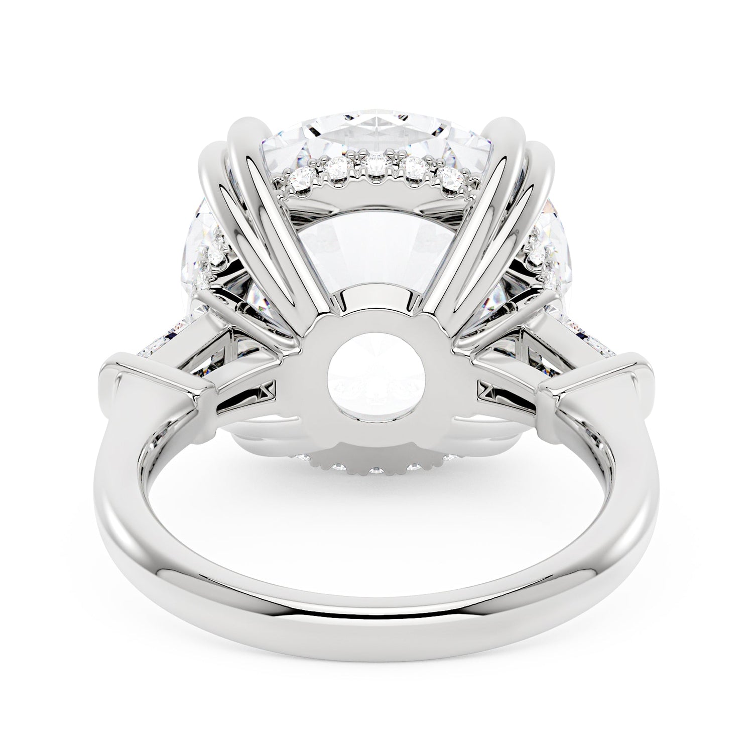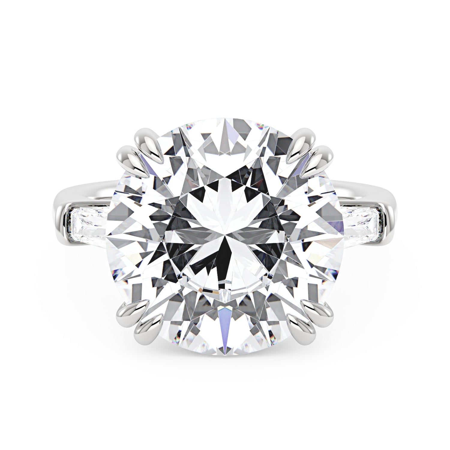 Handcrafted in 14K white gold. Center stone: 15 ct round moissanite (16 mm x 16 mm), colorless, VVS1 clarity, E-F grade. Side stones: Two tapered baguette moissanite, colorless. Hidden halo: 20 round pavé moissanite (1.5 mm), colorless. Band dimensions: 2.4 mm shank width and base width, 2 mm shank depth, 1.7 mm shank base depth. Sizes 3-15 US.