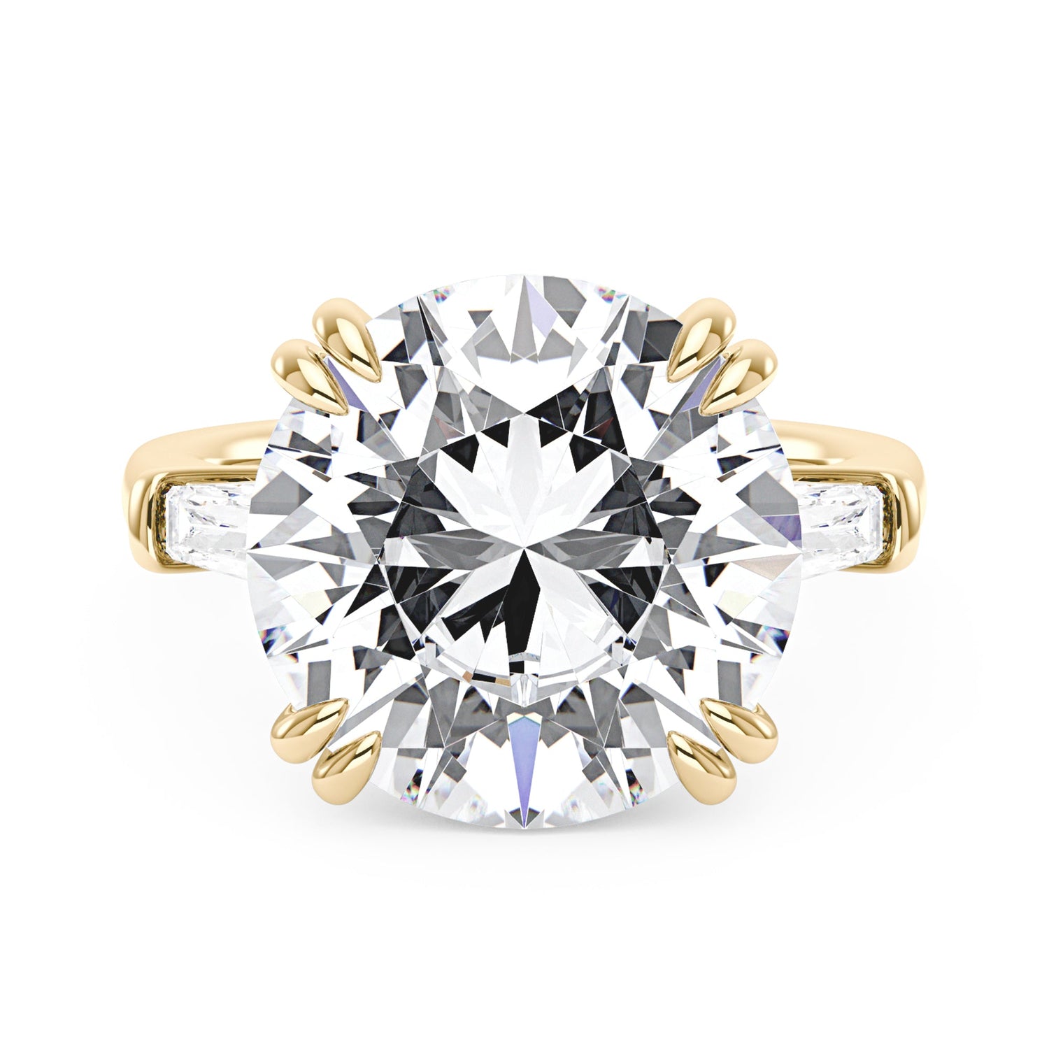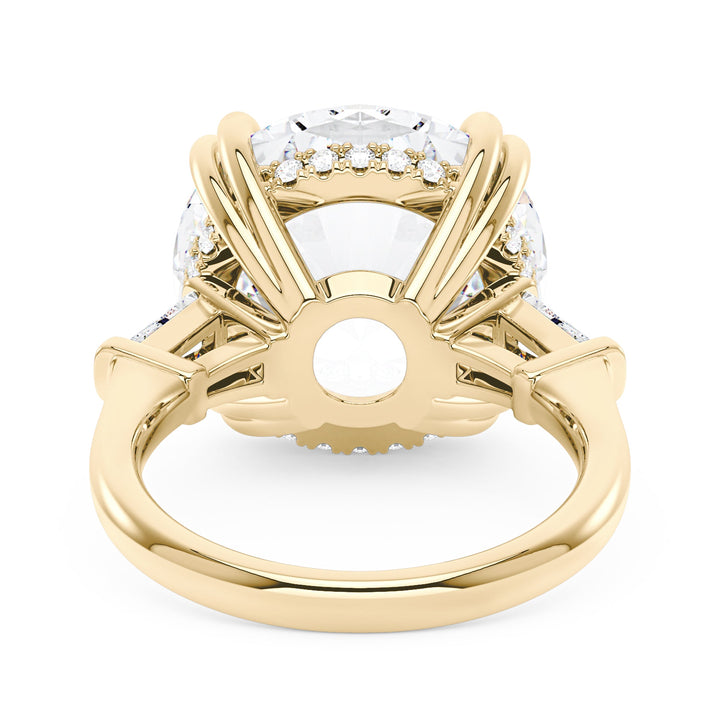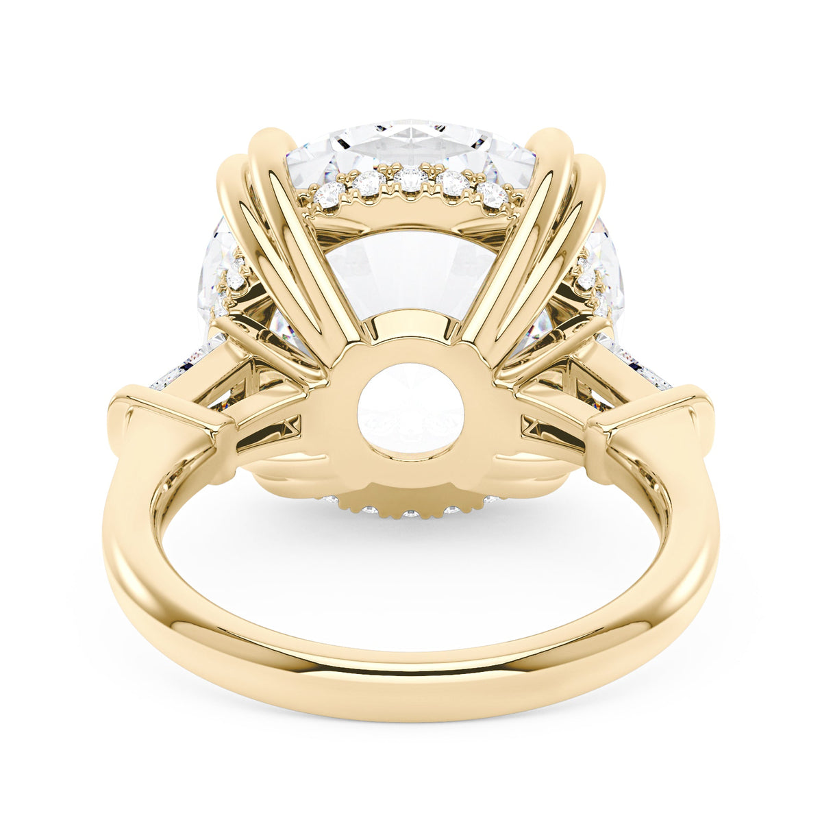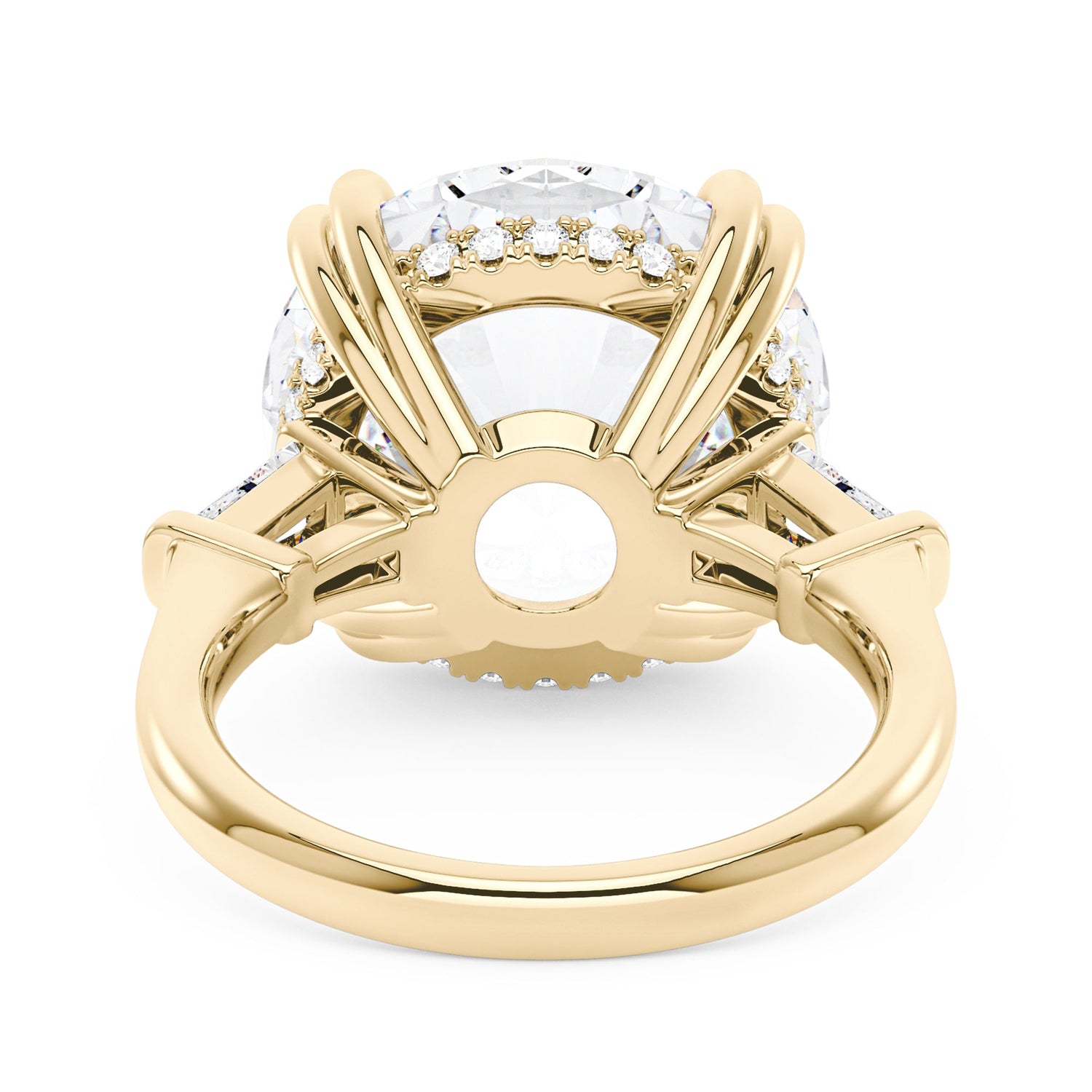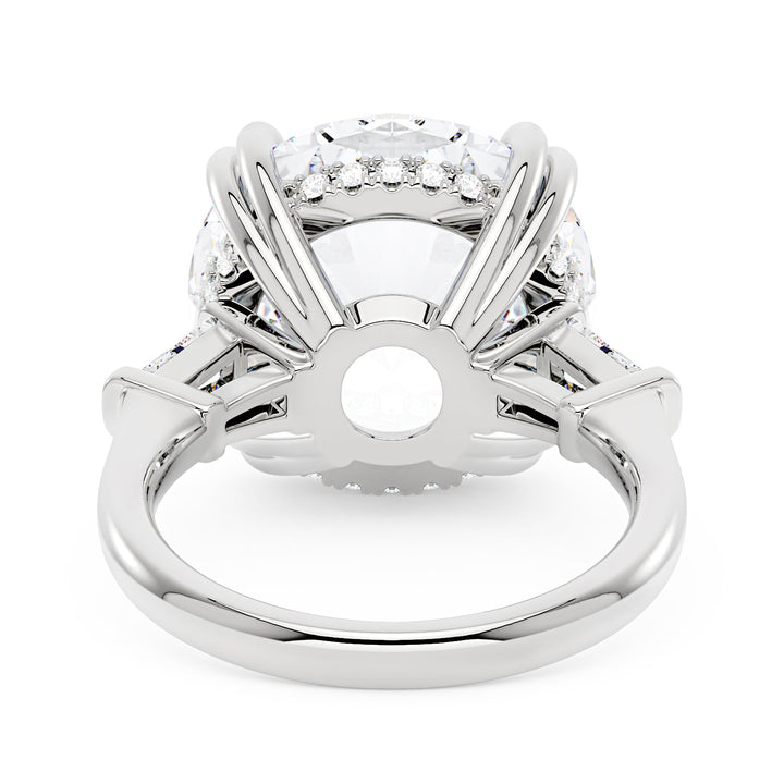 Handcrafted in 14K white gold. Center stone: 15 ct round moissanite (16 mm x 16 mm), colorless, VVS1 clarity, E-F grade. Side stones: Two tapered baguette moissanite, colorless. Hidden halo: 20 round pavé moissanite (1.5 mm), colorless. Band dimensions: 2.4 mm shank width and base width, 2 mm shank depth, 1.7 mm shank base depth. Sizes 3-15 US.