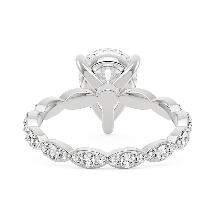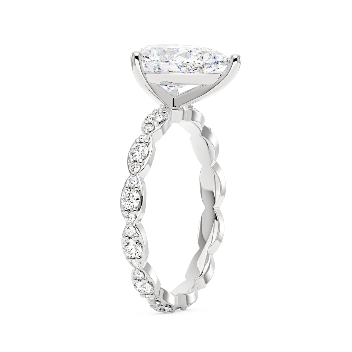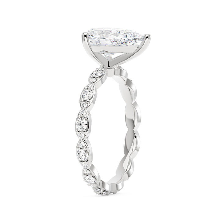 This 2 Carat Elegant Pear Shape Moissanite Engagement Ring by EPI Jewelry showcases a brilliant pear-shaped moissanite center held in a three-prong setting, complemented by 36 smaller round pavé stones on the band. The design radiates romance and sophistication, making it an ideal symbol of enduring love.