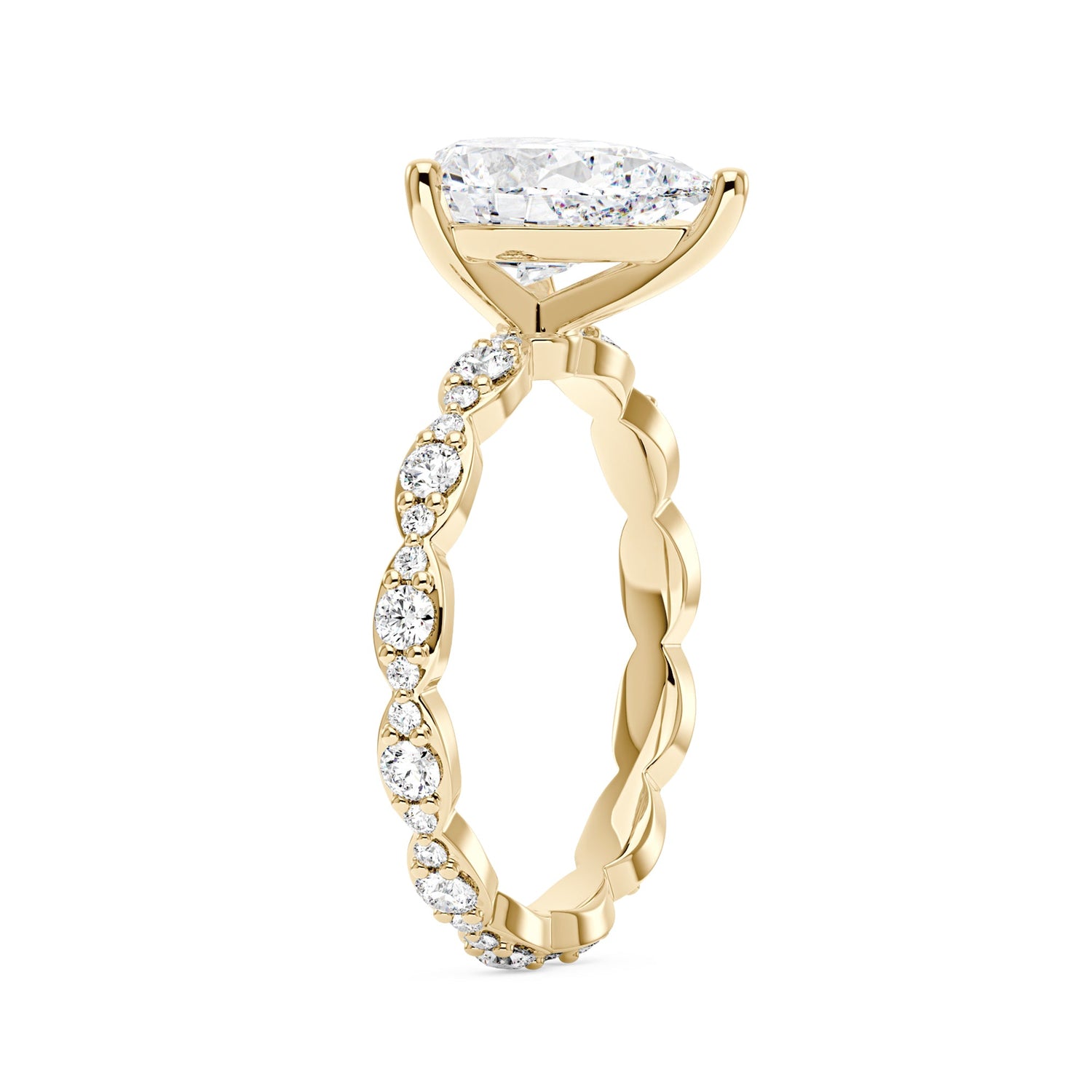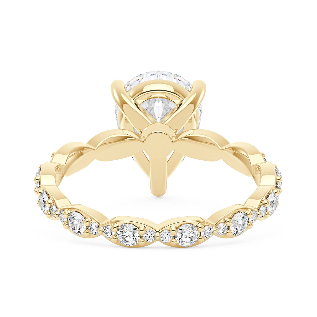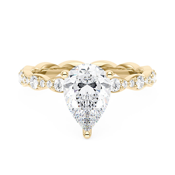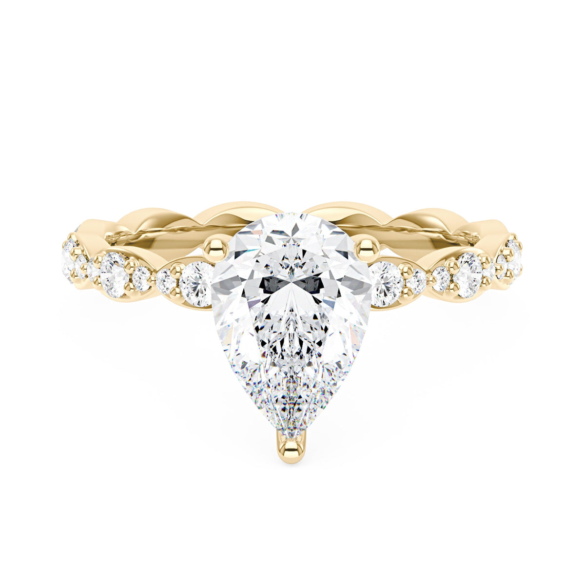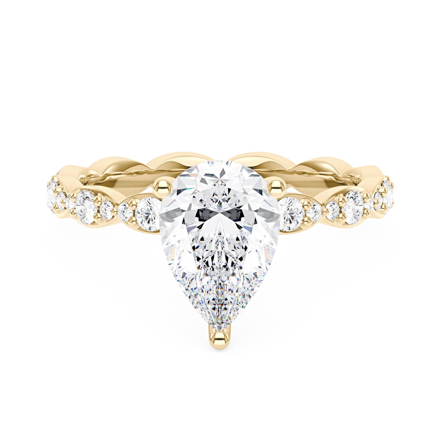 Handcrafted in 18K gold vermeil on S925 sterling silver. Center stone: 2 ct pear moissanite (7 mm x 10 mm), colorless, VVS1 clarity, E-F grade. Accent stones: 36 round moissanites, colorless. Band dimensions: 2.2 mm shank width, 1.5 mm shank depth and base depth. Sizes 3-15 US.