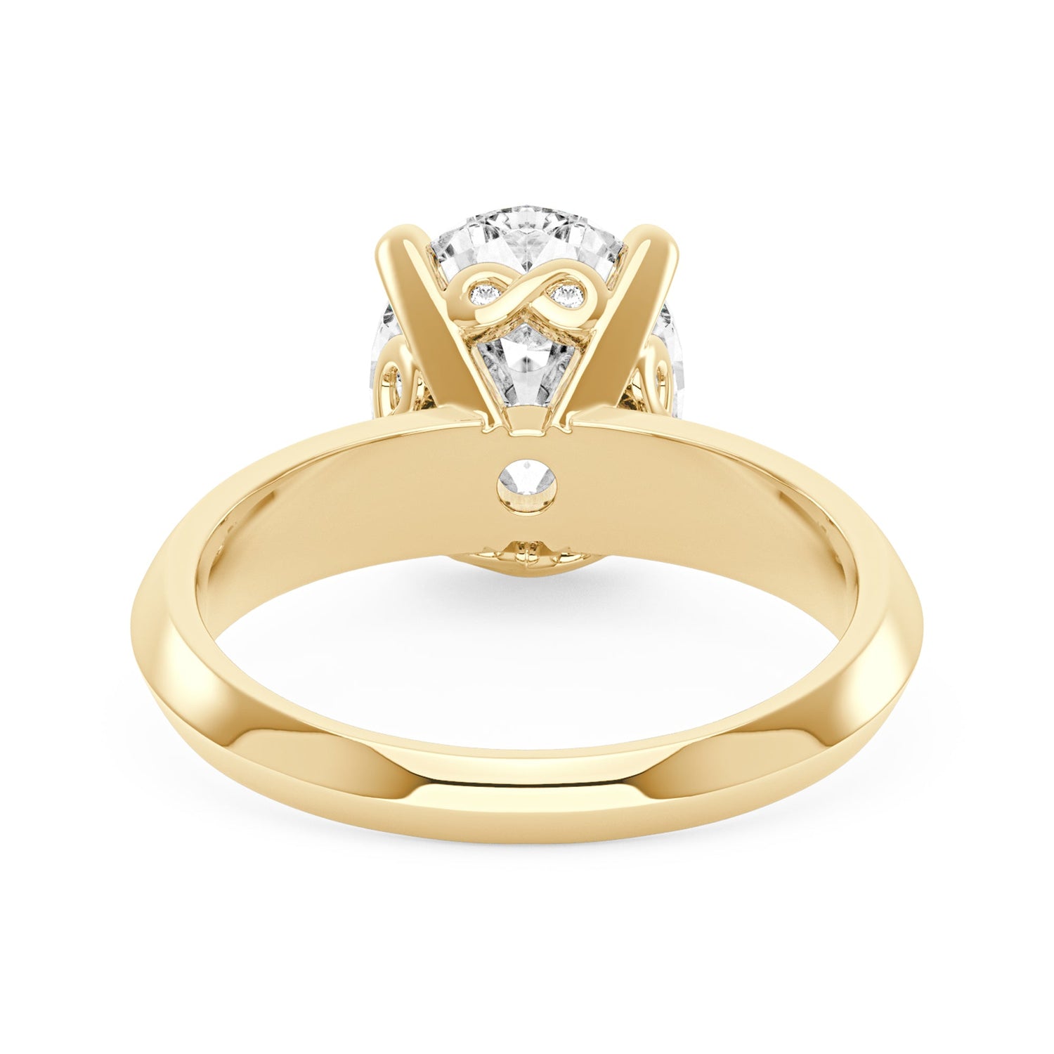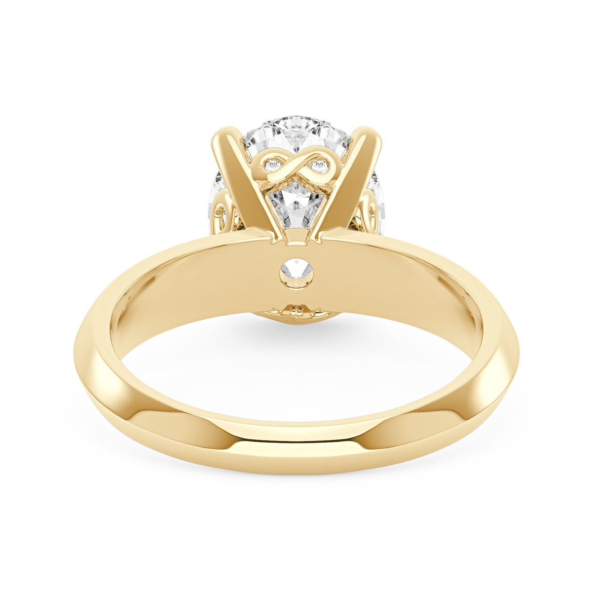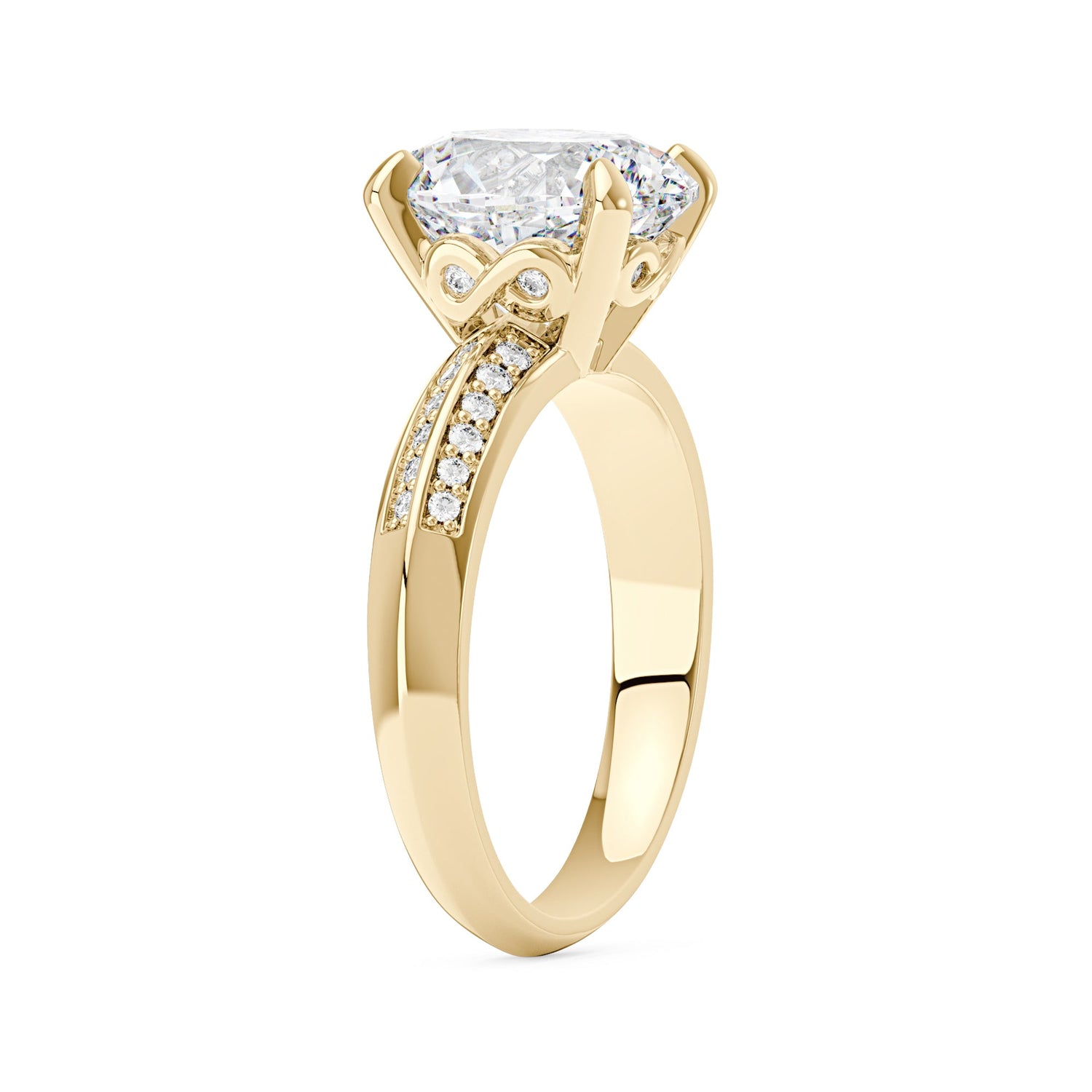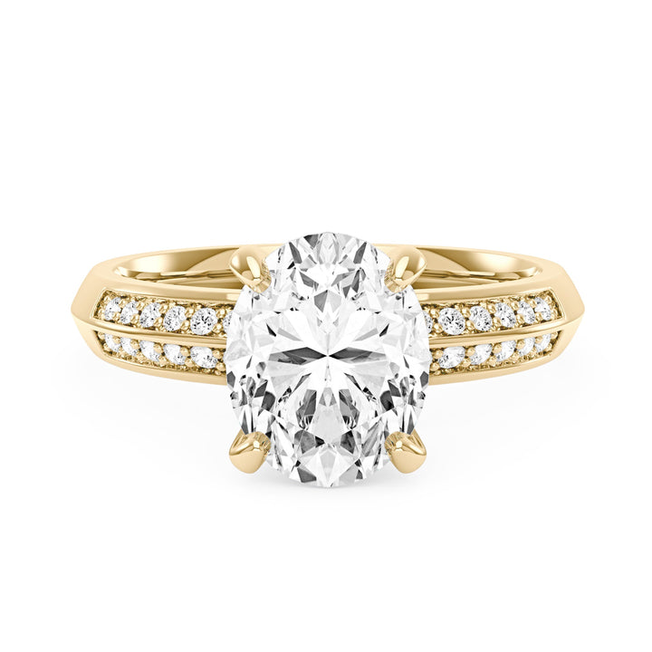 Handcrafted in 18K gold vermeil on S925 sterling silver. Center stone: 3 ct oval moissanite (8 mm x 10 mm), colorless, VVS1 clarity, E-F grade. Accent stones: 32 round pavé moissanites (8 x 1.2 mm, 16 x 1.1 mm, 8 x 1 mm), colorless. Band dimensions: 2.9 mm shank width, 2.2 mm shank base width, 1.6 mm shank depth, 1.3 mm shank base depth. Sizes 3-15 US.