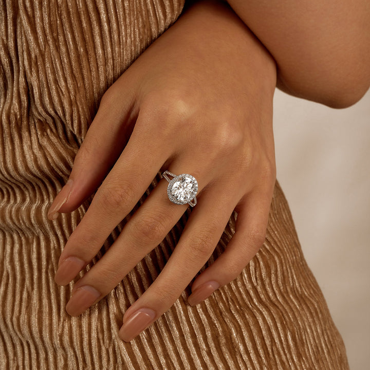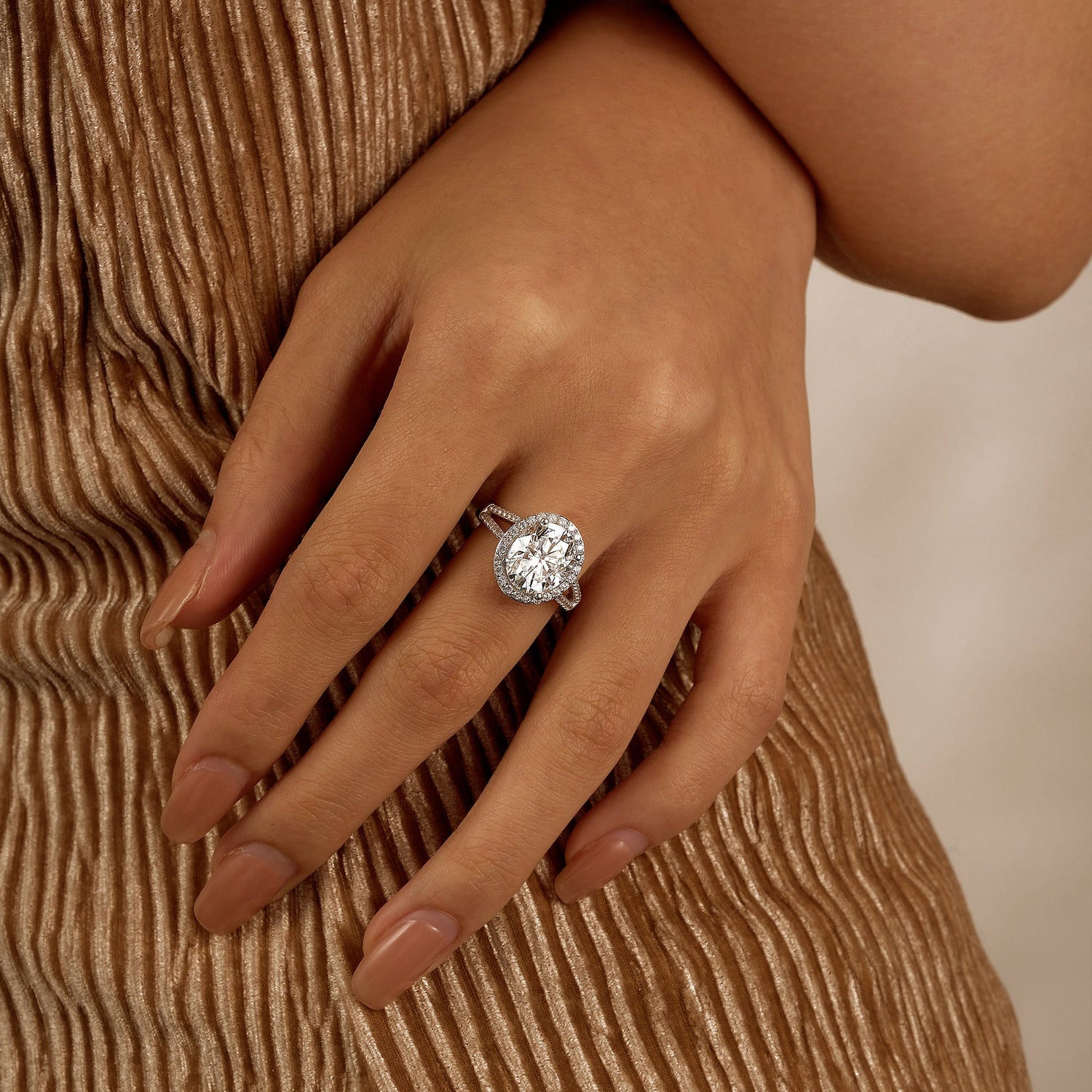 This 5 Carat Halo Moissanite Engagement Ring with Pavé Band by EPI Jewelry is an exquisite marriage of classic elegance and modern luxury. The large oval moissanite center stone commands attention with its brilliance, embraced by a radiant halo and a split shank band adorned with pavé-set stones. This design evokes timeless sophistication and symbolizes a bold declaration of love and commitment. The ring’s harmonious proportions and intricate detailing make it a perfect centerpiece for memorable occasions, embodying glamour and refinement with every angle.