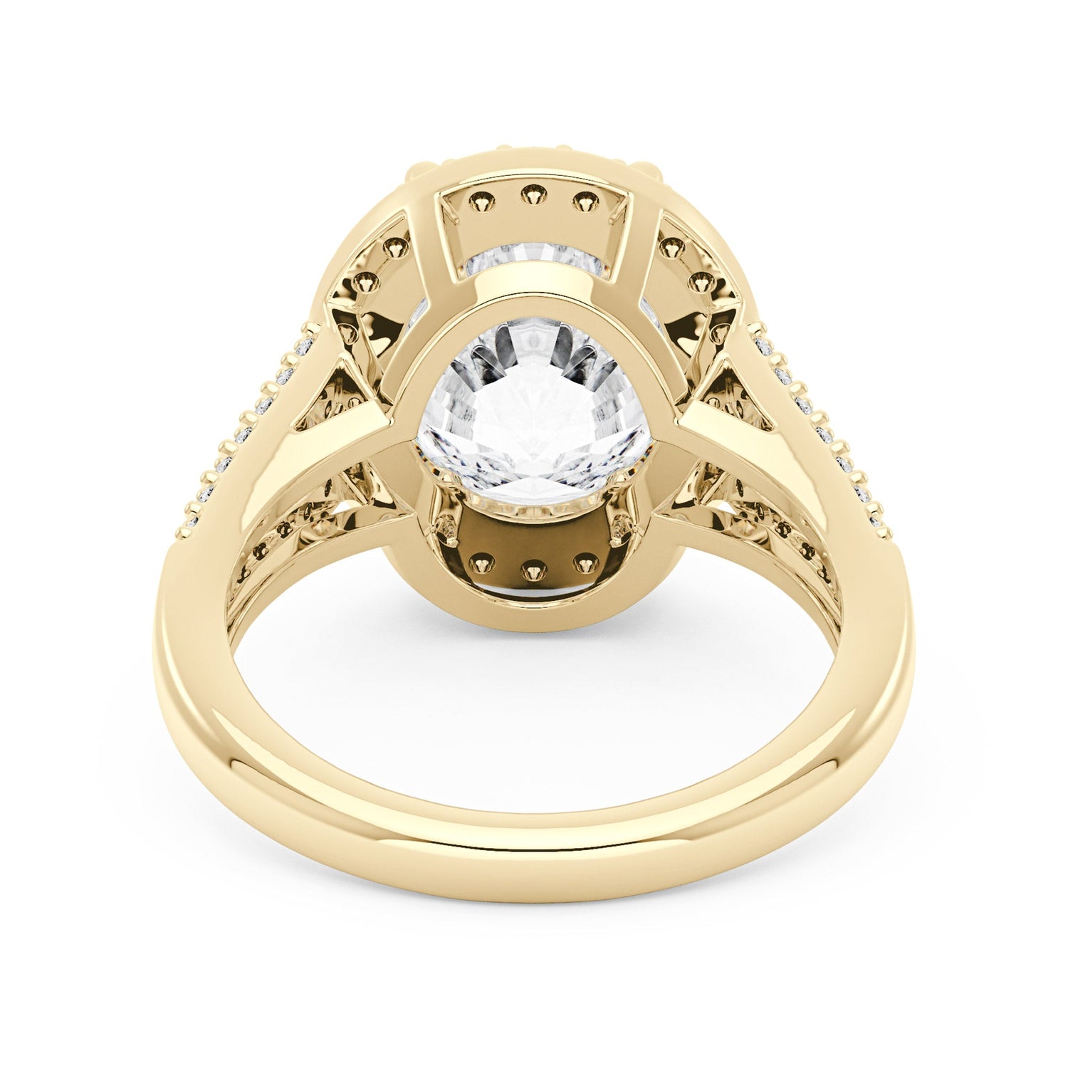 Handcrafted in 18K gold vermeil over S925 sterling silver. Center stone: 5 ct oval moissanite (9 mm x 11 mm), colorless, VVS1 clarity, E-F grade. Accent stones: 48 round pavé moissanites (24 at 1.3 mm, 24 at 1.1 mm), colorless. Ring sizes 3-15 US. Shank width: 2.9 mm; shank base width: 2.1 mm; shank depth: 1.8 mm; shank base depth: 1.4 mm.