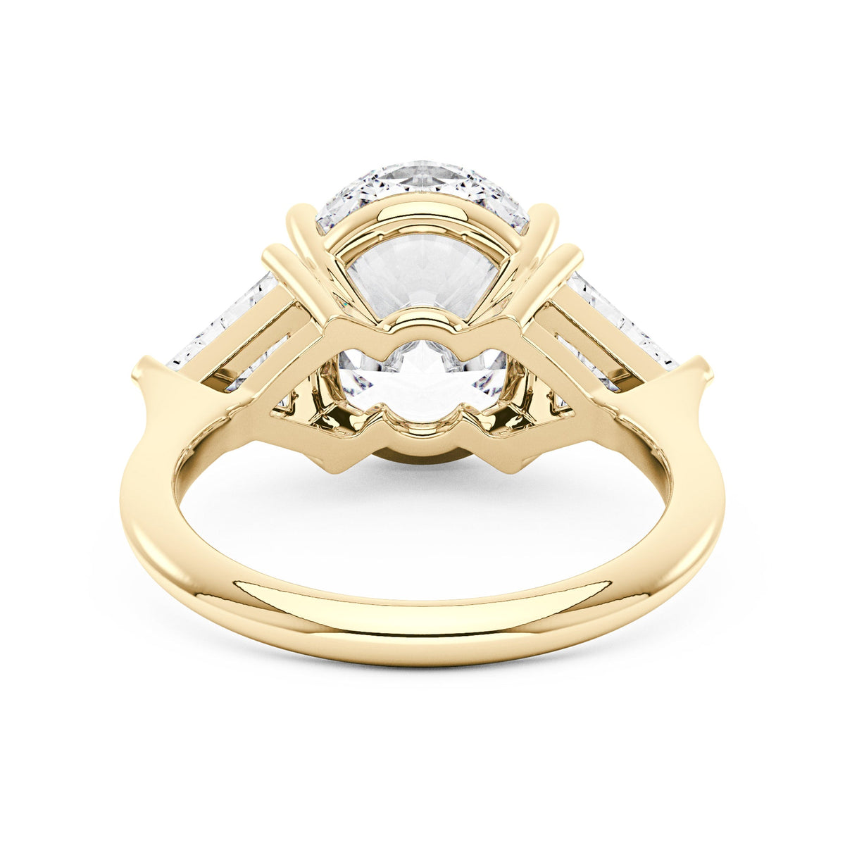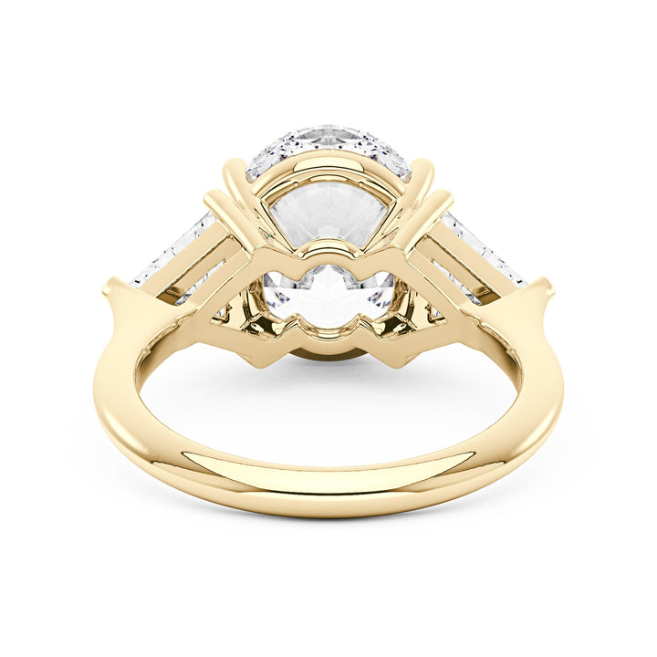 Handcrafted in 18K gold vermeil over S925 sterling silver. Center stone: 5 ct oval moissanite (9 mm x 11 mm), colorless, VVS1 clarity, E-F grade. Side stones: 2 triangle-cut moissanites (5 mm), colorless. Ring sizes 3-15 US. Shank width: 2 mm; shank base width: 2.3 mm; shank depth: 1.8 mm; shank base depth: 1.6 mm.