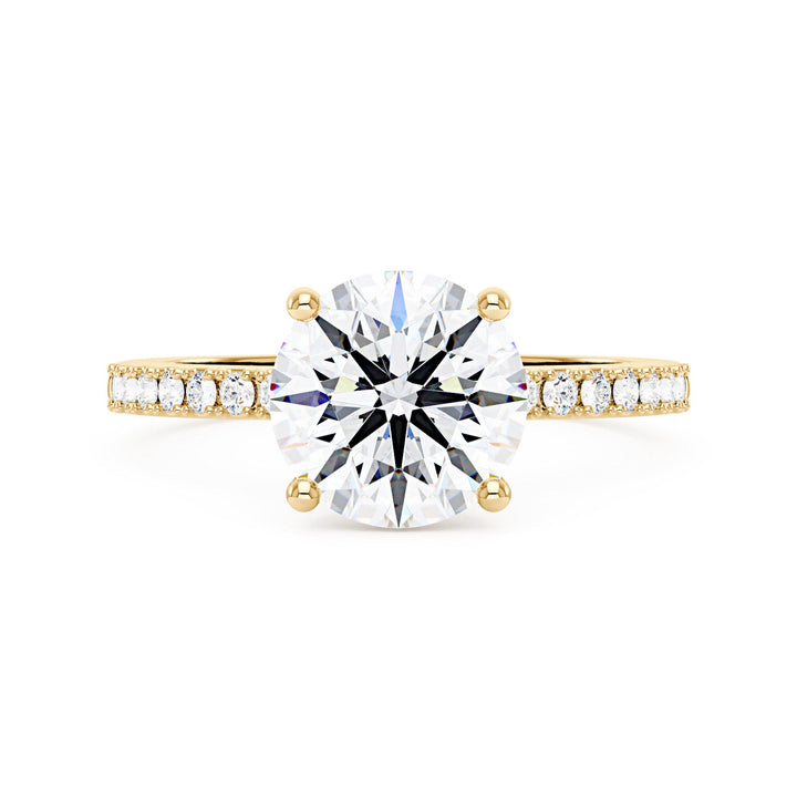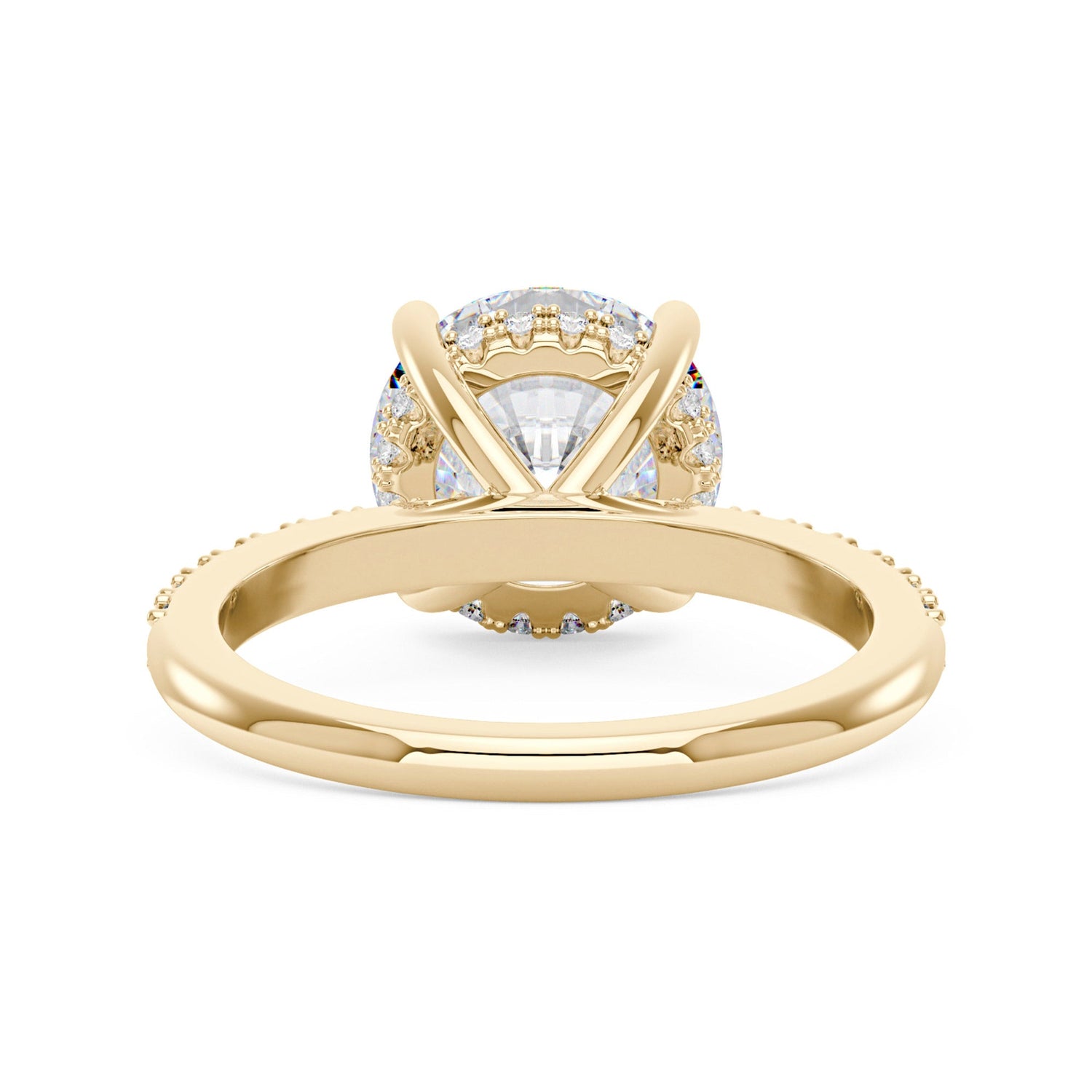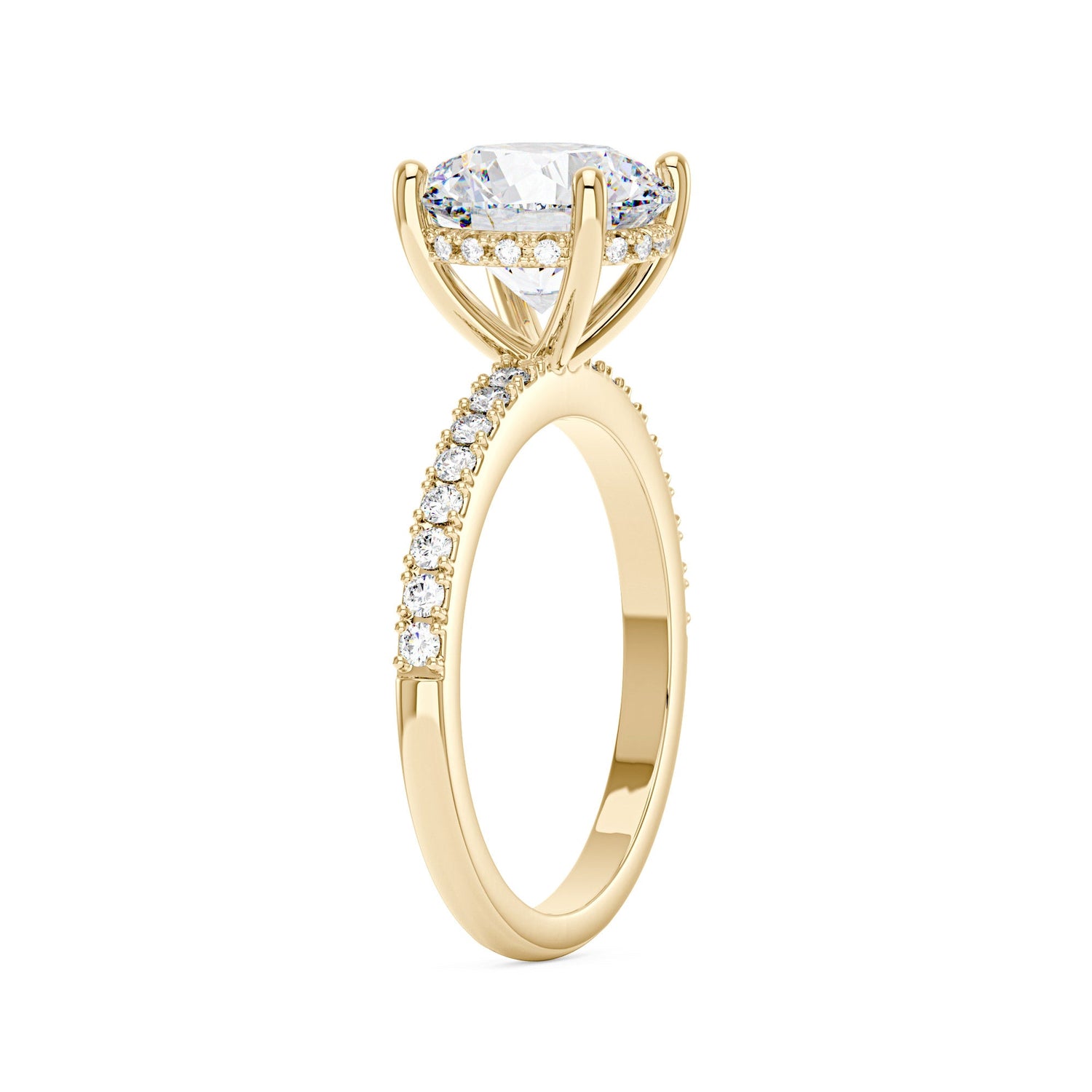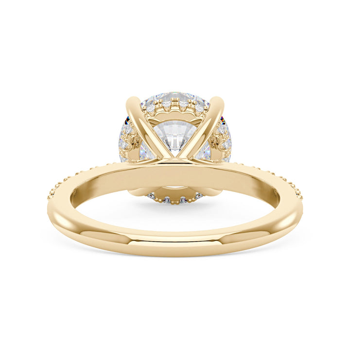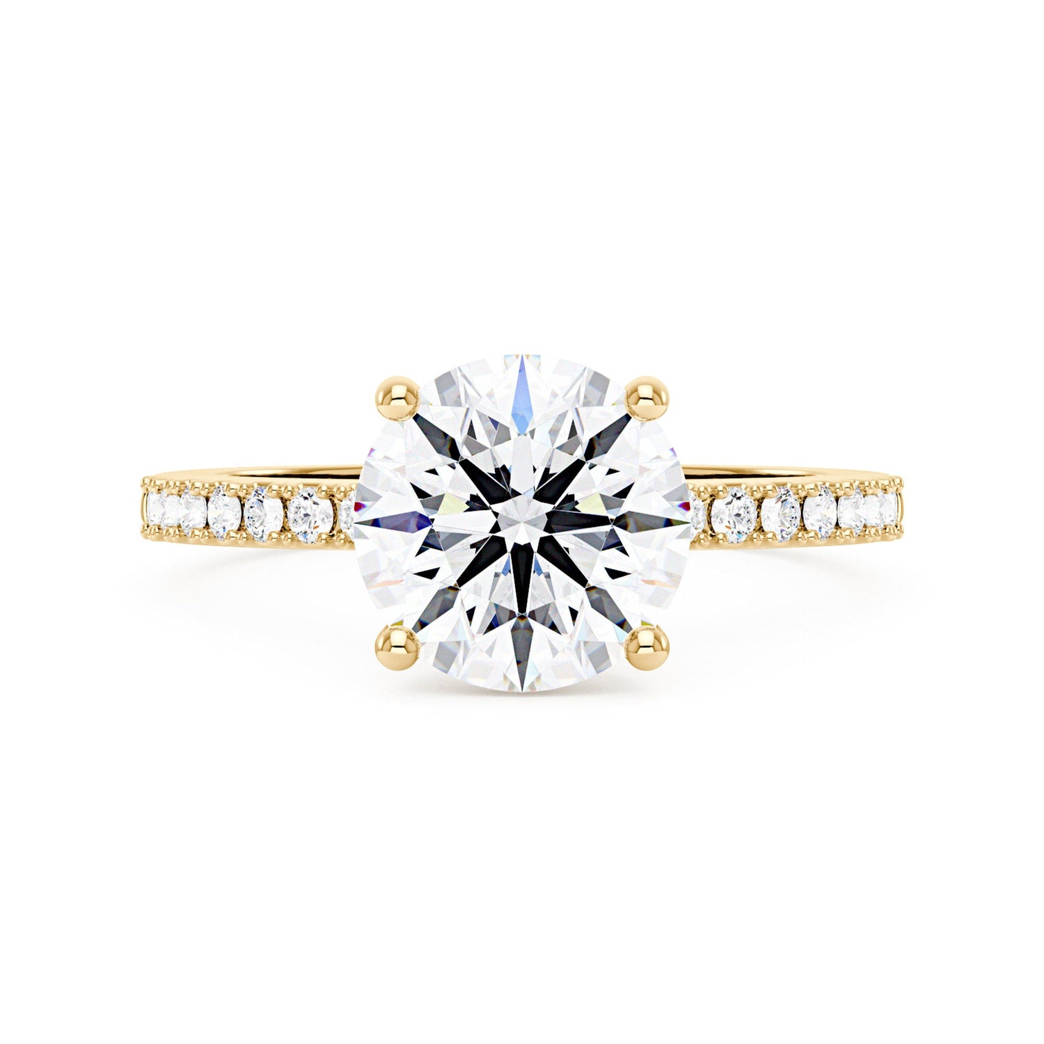 Handcrafted in 18K gold vermeil over S925 sterling silver. Center stone: 3 ct round moissanite (9 mm x 9 mm), colorless, VVS1 clarity, E-F grade. Accent stones: continuous pavé-set round moissanites. Ring sizes 3-15 US. Shank width: 1.9 mm; shank depth: 1.6 mm; shank base depth: 1.4 mm.