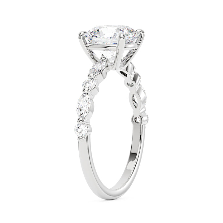 This 2 Carat Cushion Cut Moissanite Accented Band Engagement Ring by EPI Jewelry features a stunning cushion cut center stone surrounded by sparkling marquise and round moissanite accents. The delicate shank adds elegance and sophistication, making it an exquisite choice for celebrating love and special occasions.
