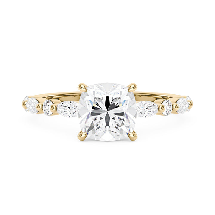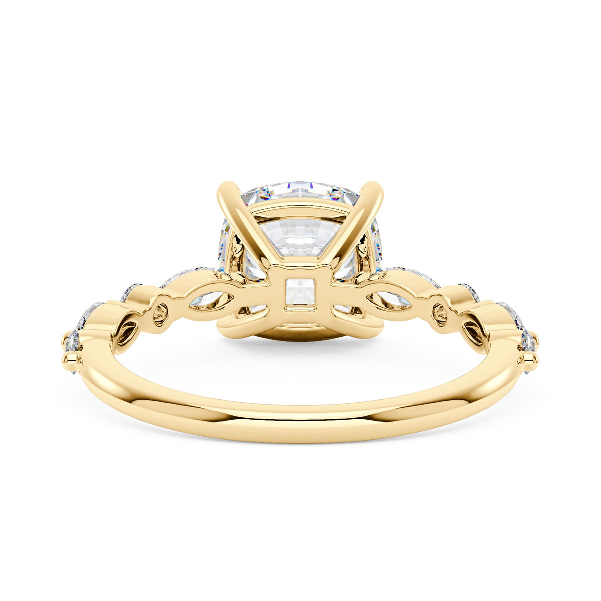 Handcrafted in 18K gold vermeil over S925 sterling silver. Center stone: 2 ct cushion-cut moissanite (7 mm x 7 mm), colorless, VVS1 clarity, E-F grade. Accent stones: 6 marquise (2 mm x 4 mm) and 4 round moissanites (2 mm x 2 mm), colorless. Ring sizes 3-15 US. Shank width: 1.4 mm; shank depth: 1.9 mm; shank base depth: 1.4 mm.
