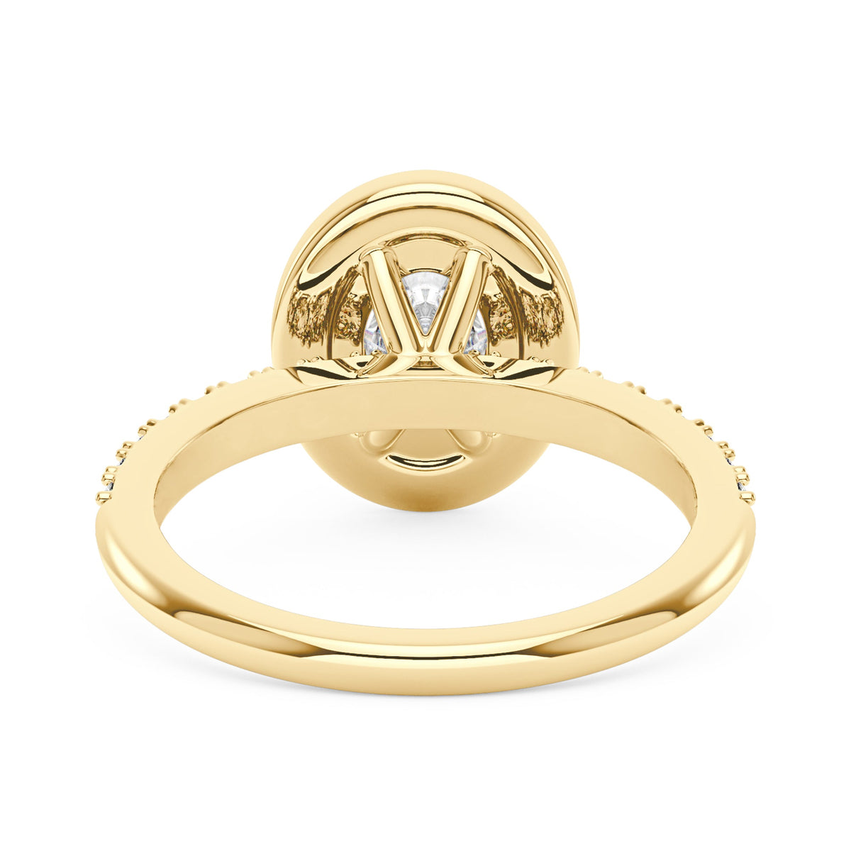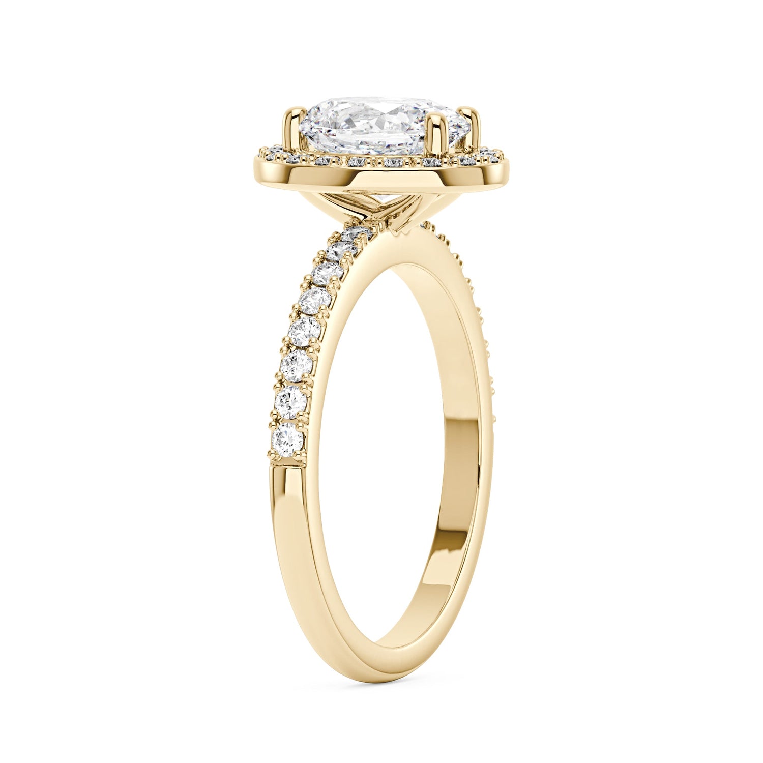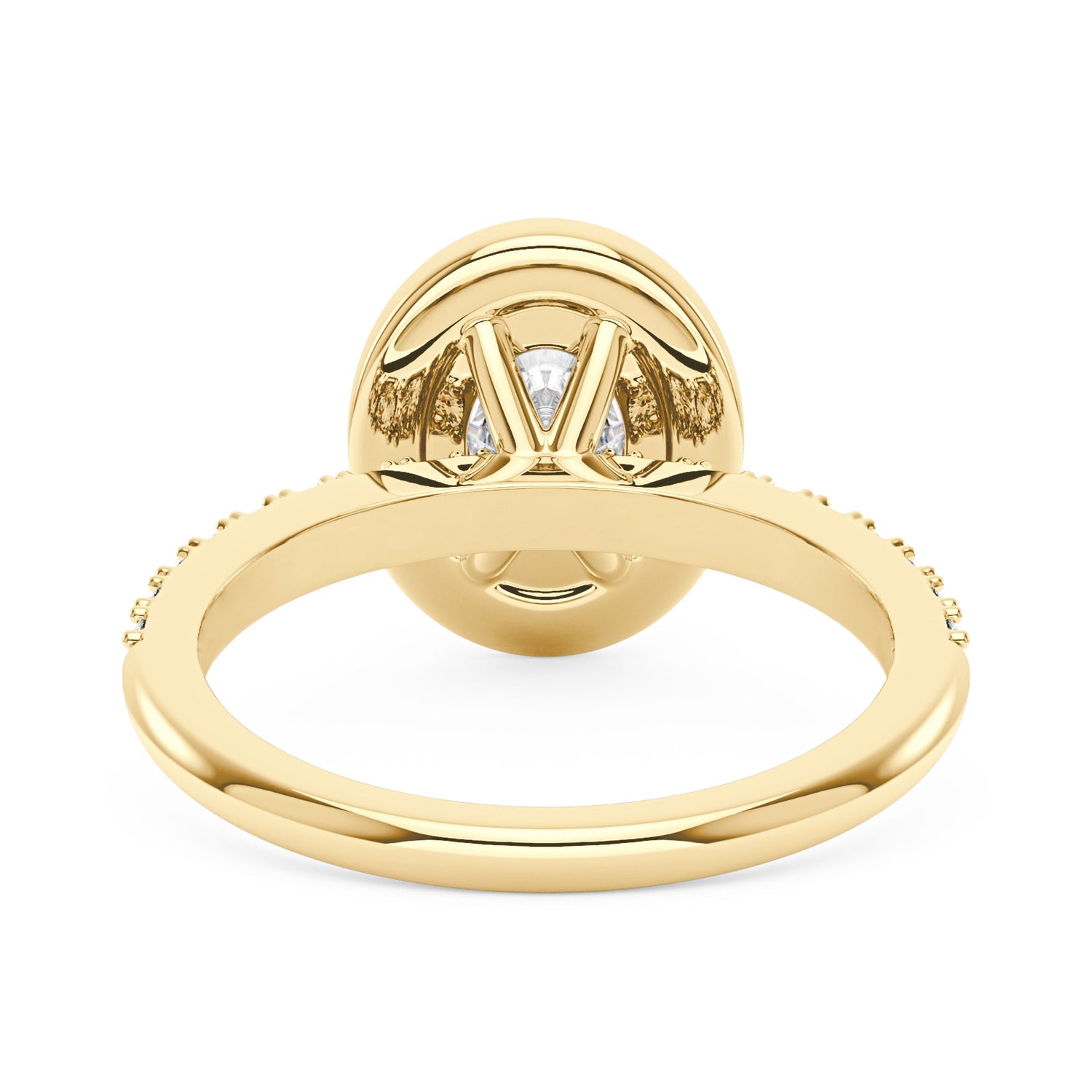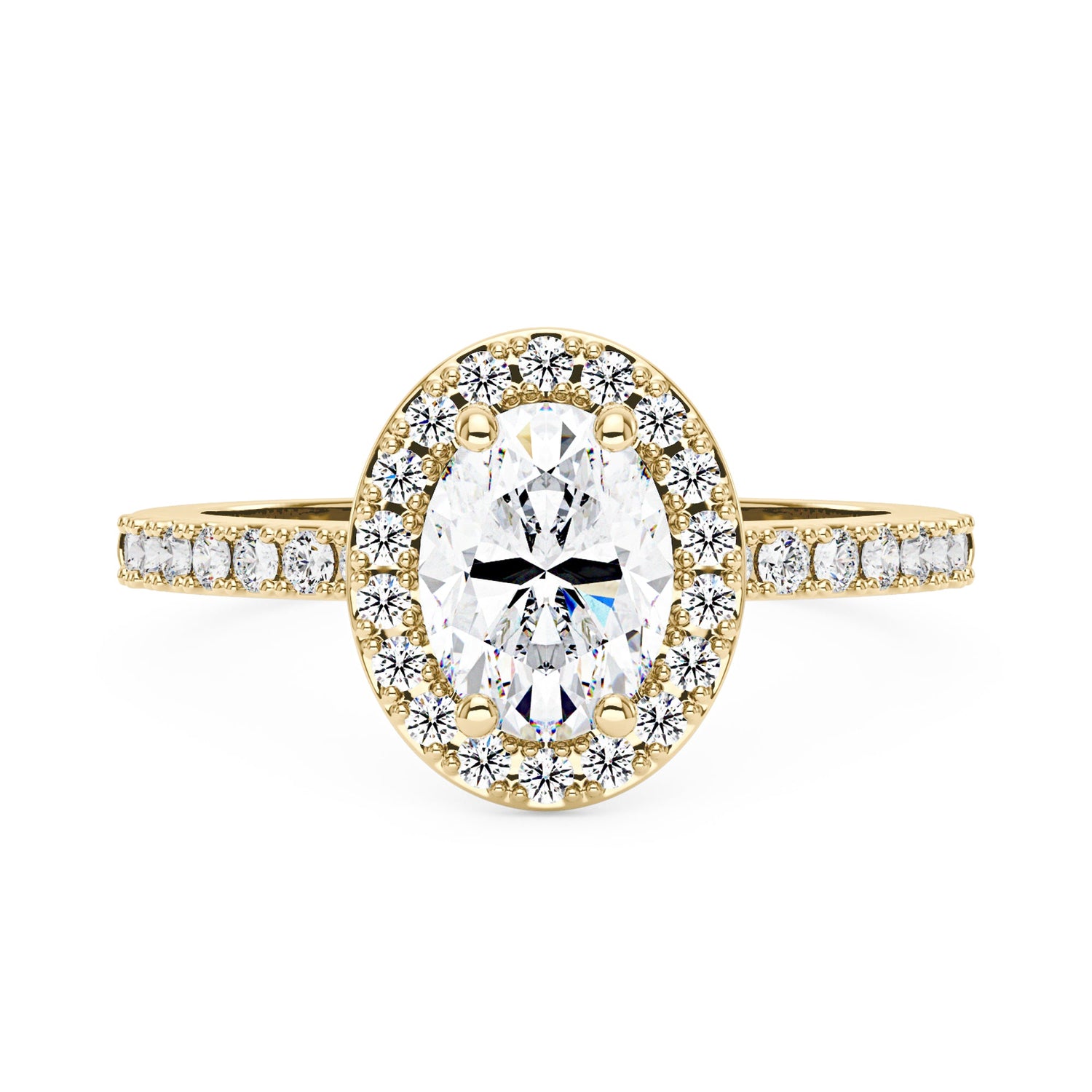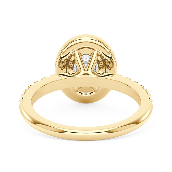 Handcrafted in 18K gold vermeil over S925 sterling silver. Center stone: 1.5 ct oval moissanite (6 mm x 8 mm), colorless, VVS1 clarity, E-F grade. Accent stones: pavé-set round moissanites, colorless. Ring sizes 3-15 US. Shank width: 1.9 mm; shank depth: 1.6 mm; shank base depth: 1.4 mm.