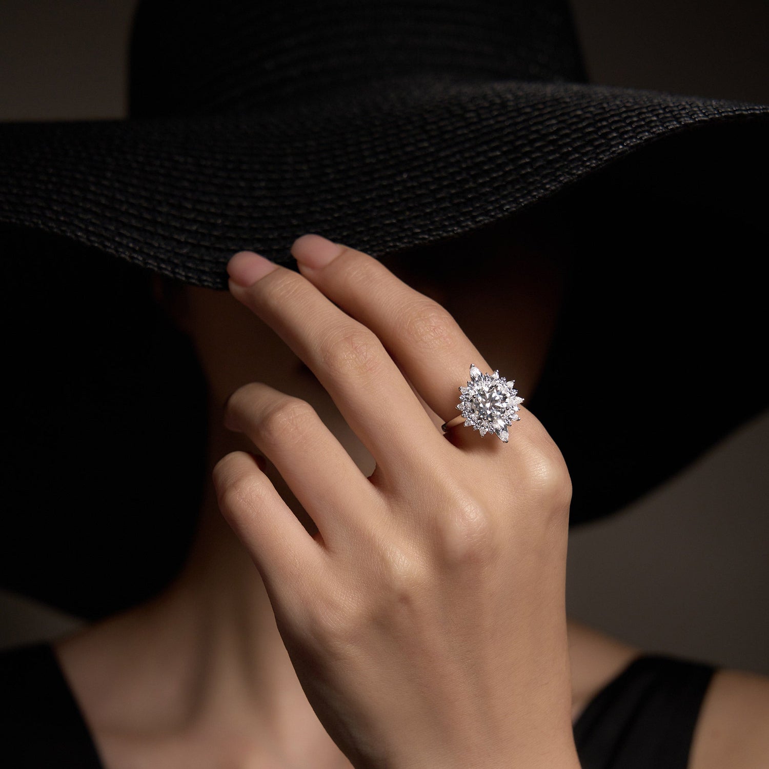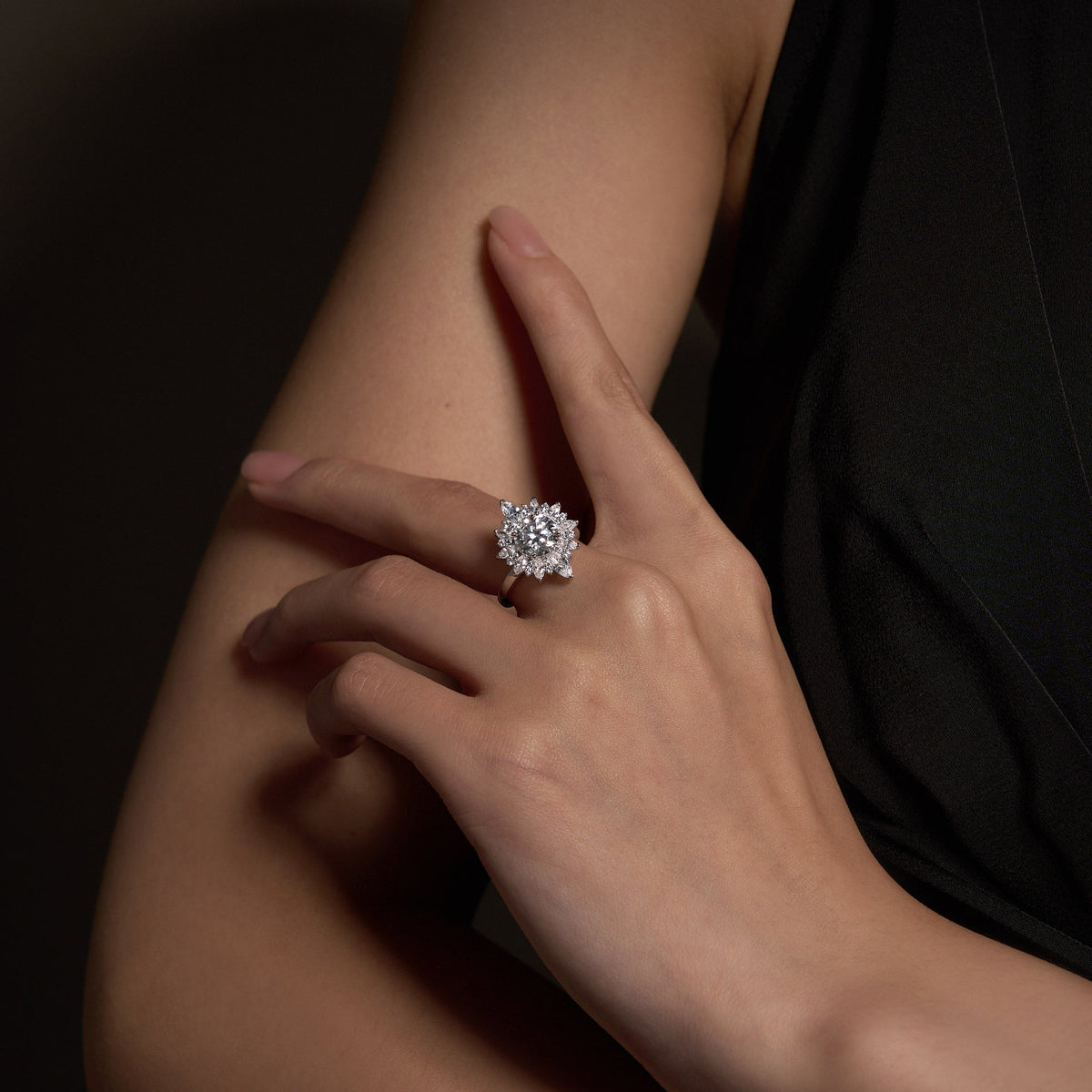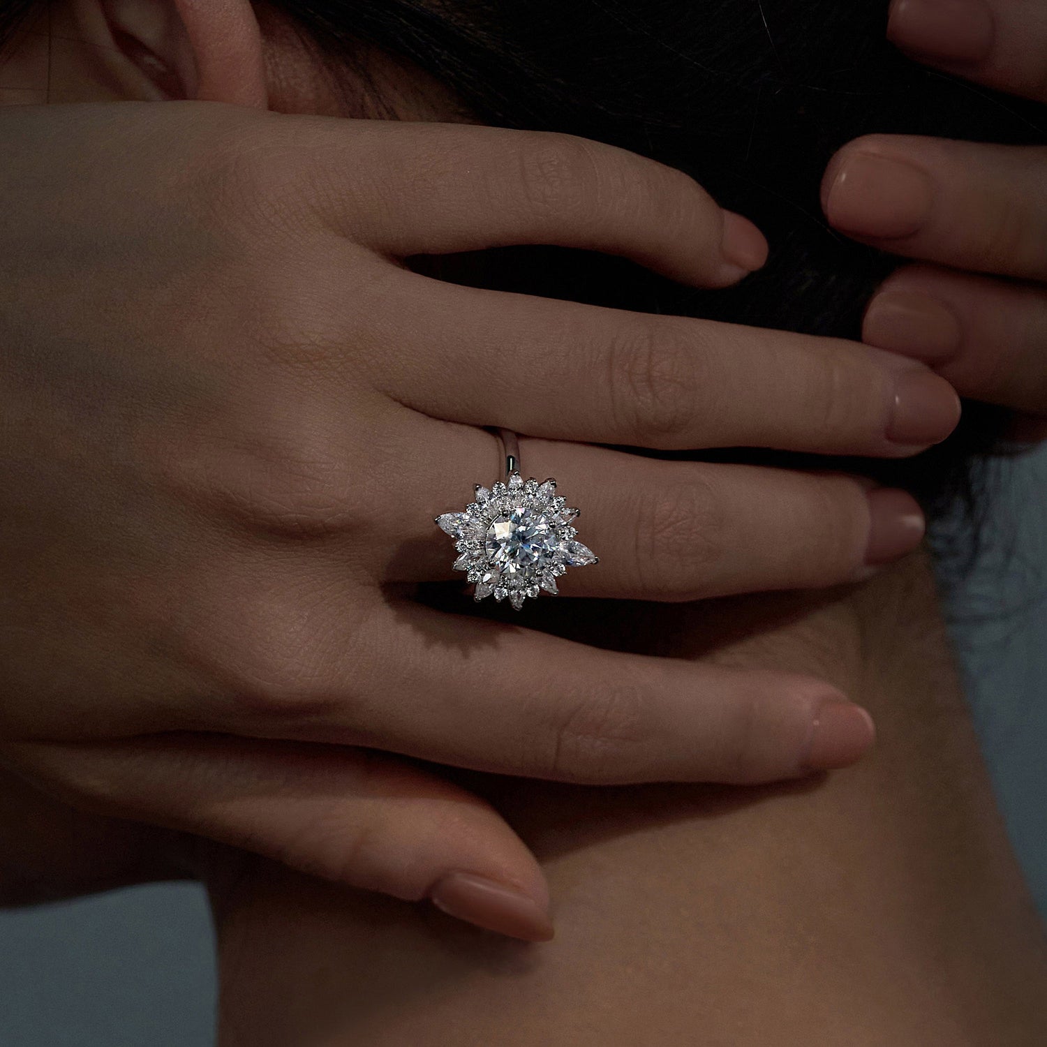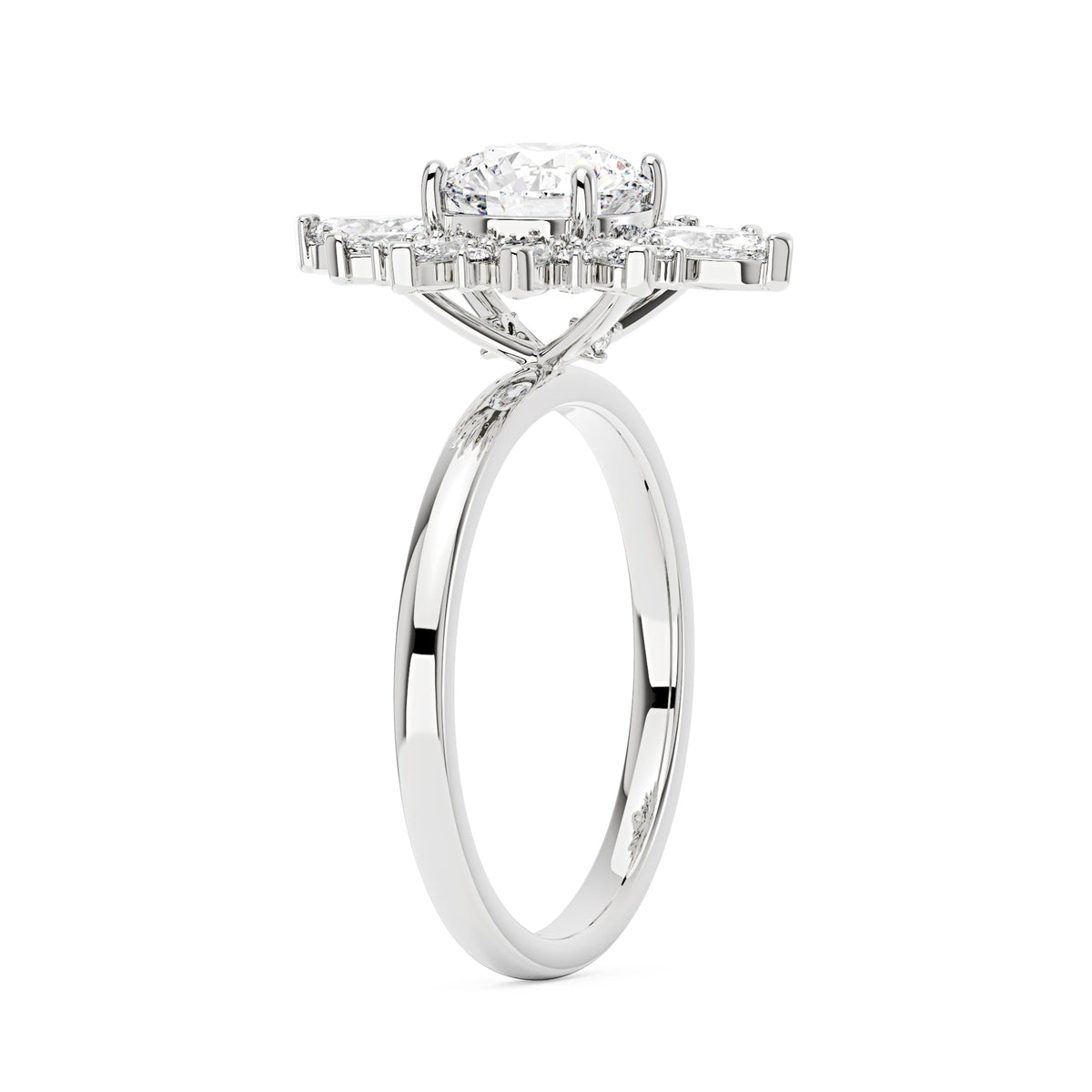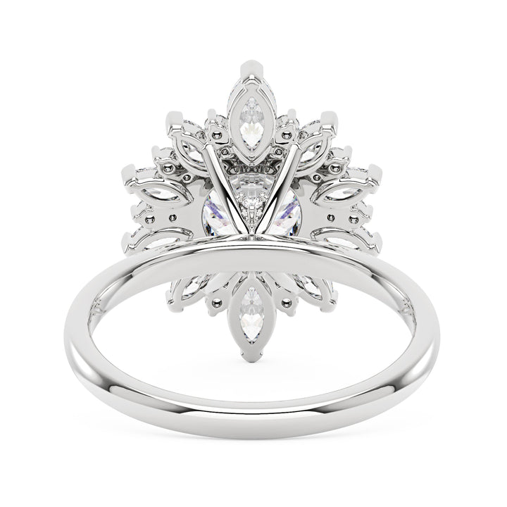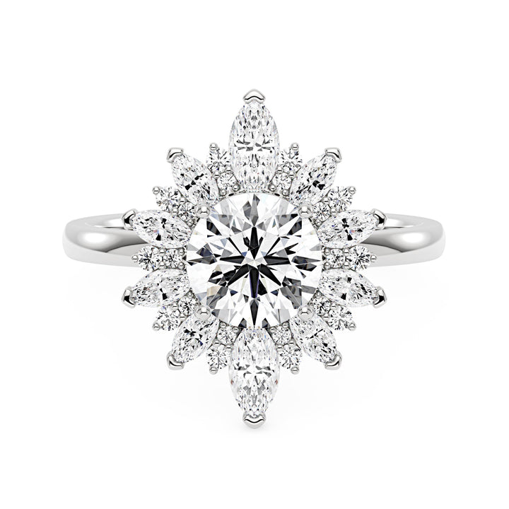 This 2 Carat Nature Inspired Floral Moissanite Ring by EPI Jewelry features a dazzling round-cut moissanite center stone surrounded by a halo of smaller round and marquise cut stones arranged in a stunning floral pattern. The design captures timeless charm and elegance, perfect for expressing love and grace with a nature-inspired touch.