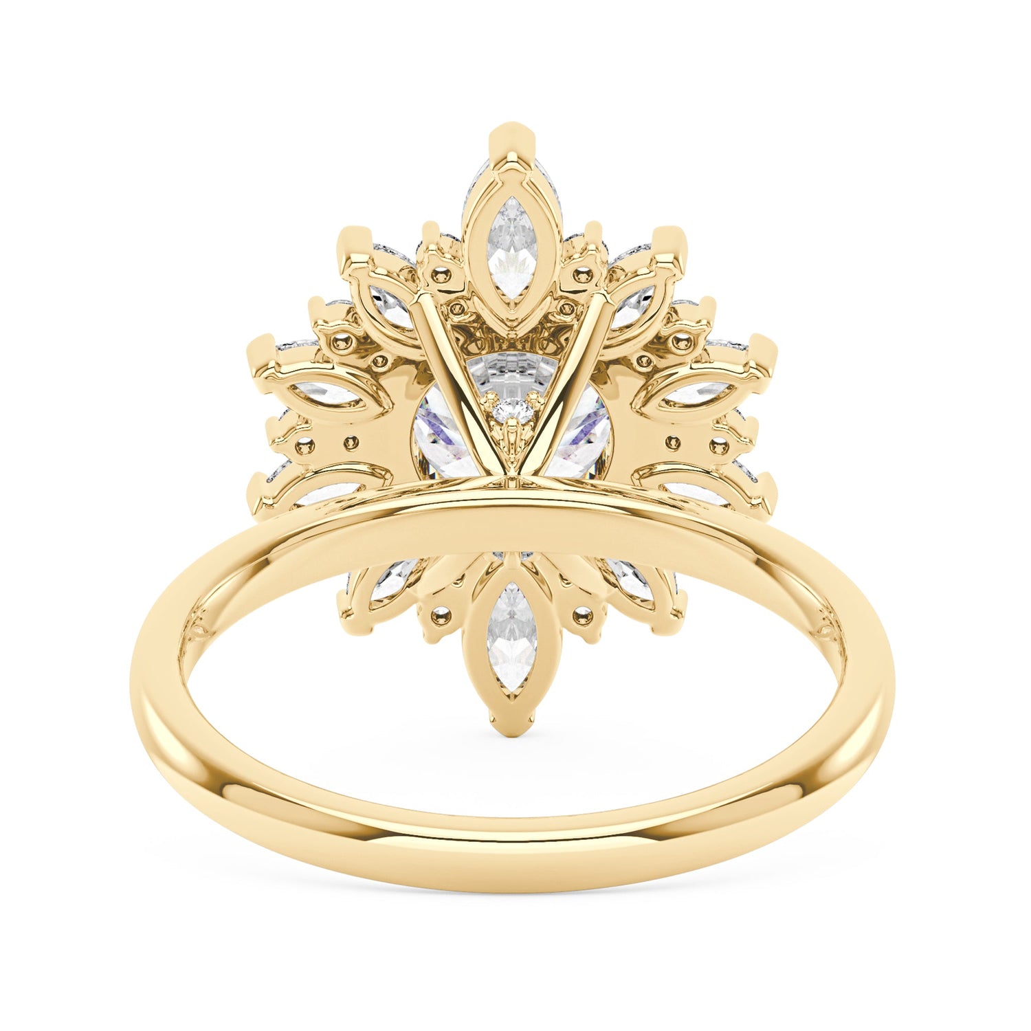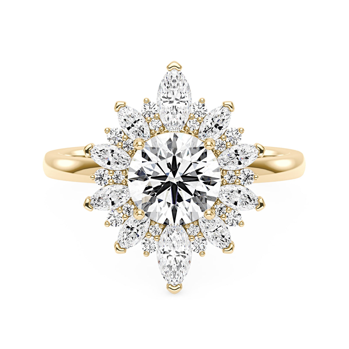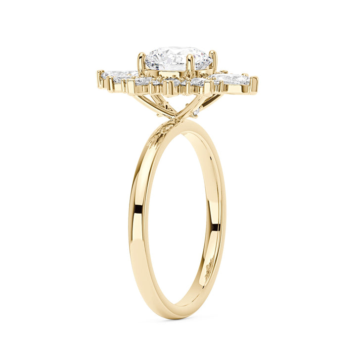 Handcrafted in 18K gold vermeil over S925 sterling silver. Center stone: 2 ct round moissanite (8 mm), colorless, VVS1 clarity, E-F grade. Accent stones: 26 moissanites (round and marquise cuts), colorless; marquise total 0.5 ct, round total 0.2 ct. Ring sizes 3-15 US. Shank width: 1.9 mm; shank depth: 1.5 mm; shank base depth: 1.5 mm.