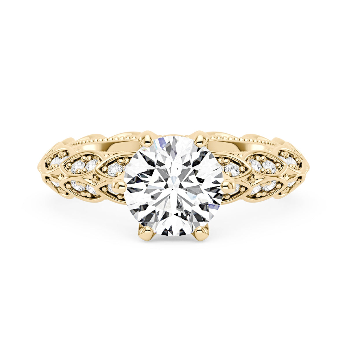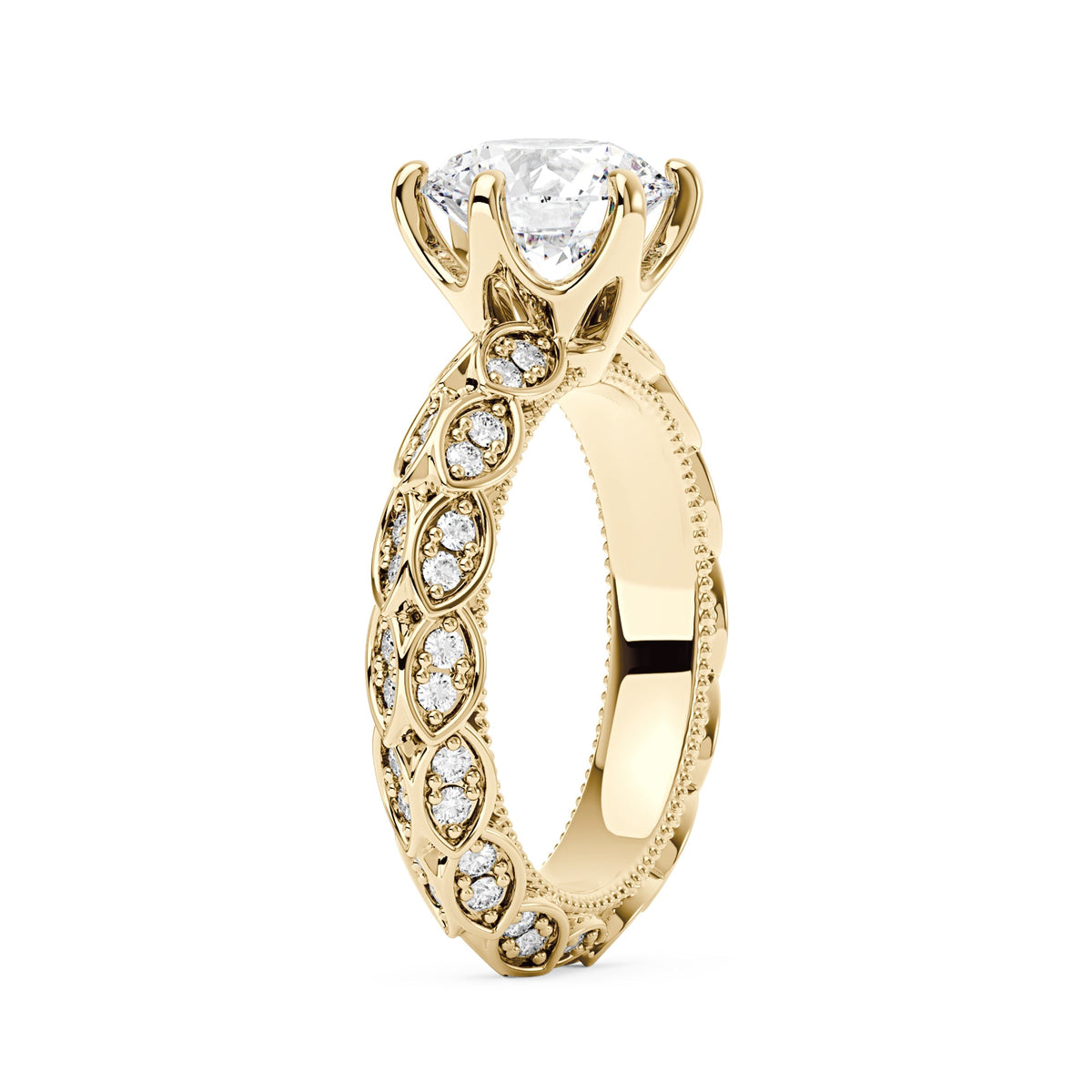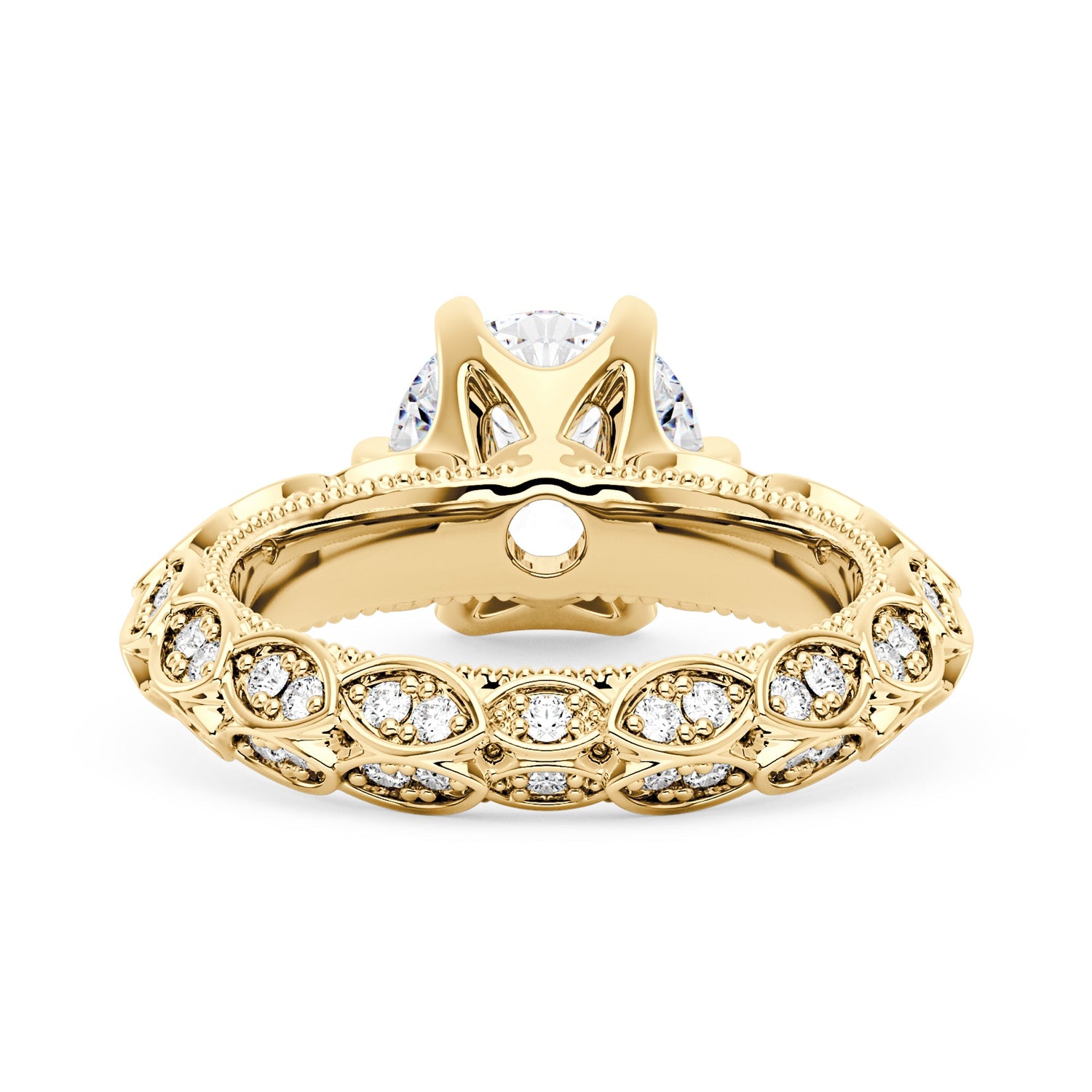 Handcrafted in 18K gold vermeil over S925 sterling silver. Center stone: 1.5 ct round moissanite (7.5 mm x 7.5 mm), colorless, VVS1 clarity, E-F grade. Accent stones: 74 round moissanites, colorless. Ring sizes 3-15 US. Shank width: 3.7 mm; shank depth: 2.5 mm; shank base depth: 2.3 mm.
