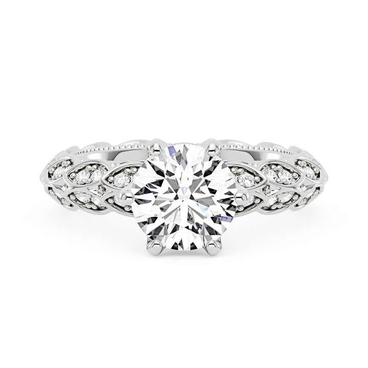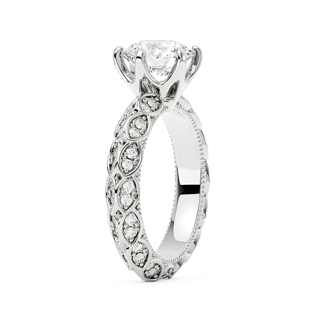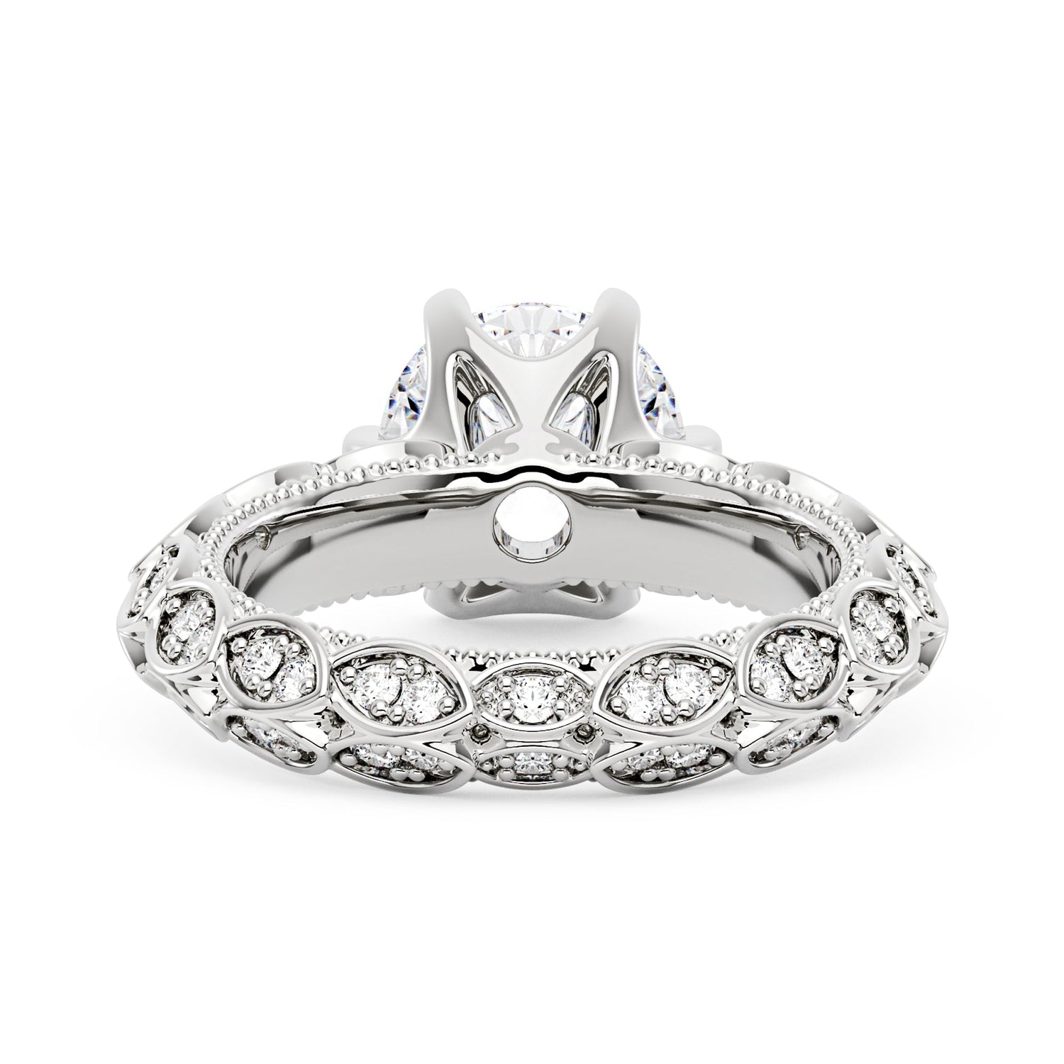 Handcrafted in 18K gold vermeil over S925 sterling silver. Center stone: 1.5 ct round moissanite (7.5 mm x 7.5 mm), colorless, VVS1 clarity, E-F grade. Accent stones: 74 round moissanites, colorless. Ring sizes 3-15 US. Shank width: 3.7 mm; shank depth: 2.5 mm; shank base depth: 2.3 mm.