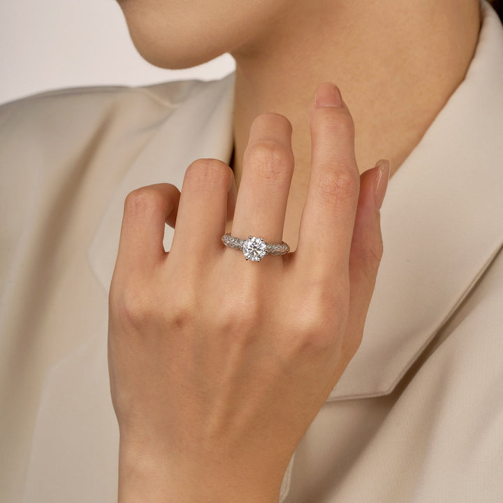 This 1.5 Carat Luxury Band Solitaire Moissanite Engagement Ring by EPI Jewelry elevates classic solitaire style with a prominent round-cut center stone set atop a twisted pavé band shimmering with 74 smaller moissanites. This intricate design combines timeless elegance with a modern sparkle for a truly luxurious statement.