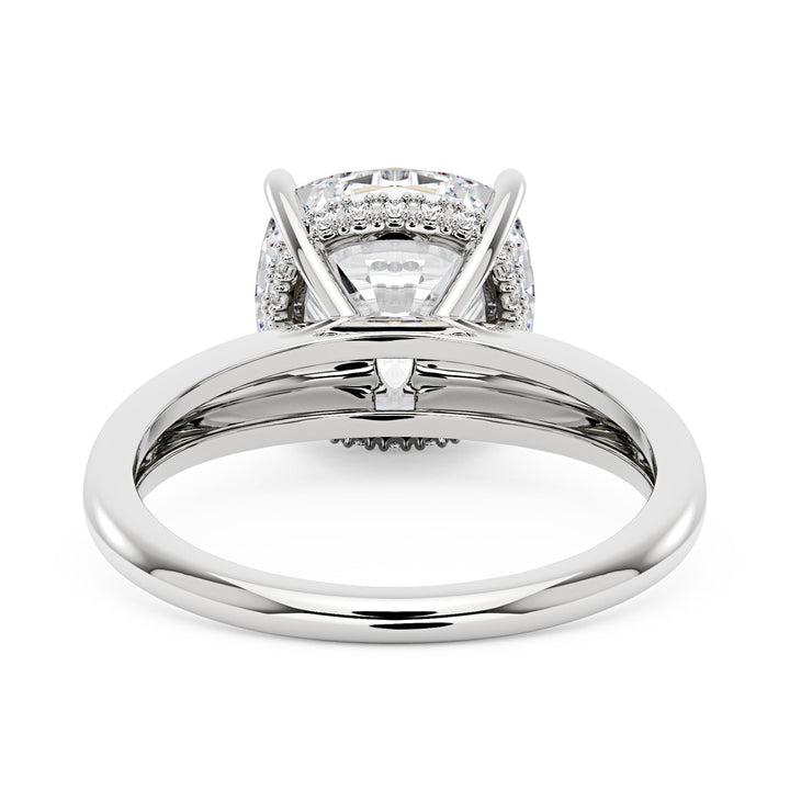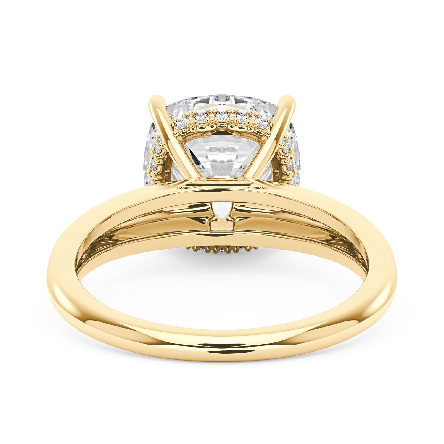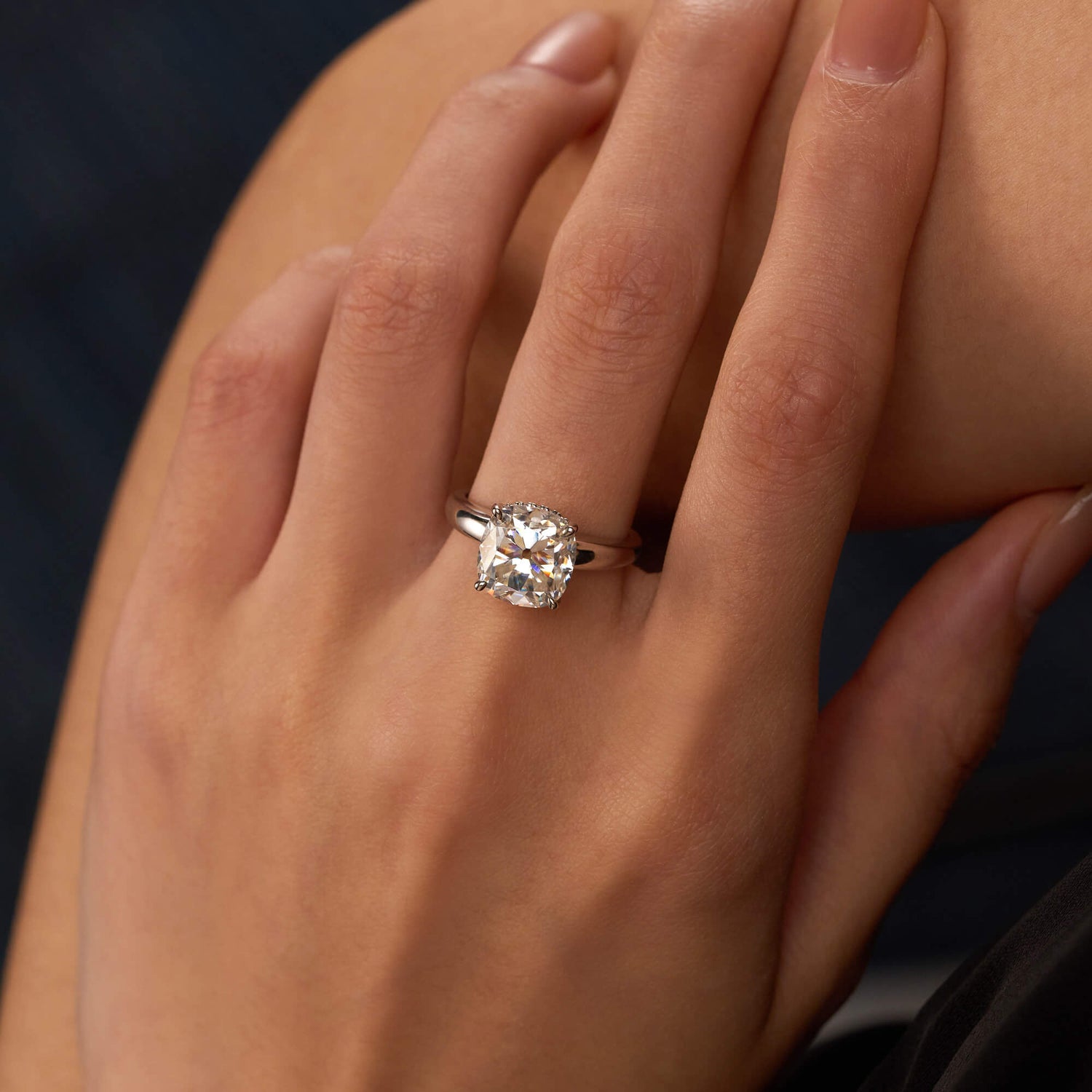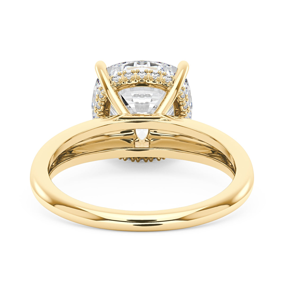 Handcrafted in 18K gold vermeil over S925 sterling silver. Center stone: 5 ct elongated cushion moissanite (9 mm x 11 mm), colorless, VVS1 clarity, E-F grade. Ring sizes 3-15 US. Shank width: 2.3 mm; shank base width: 1.8 mm; shank depth: 1.7 mm; shank base depth: 1.4 mm.