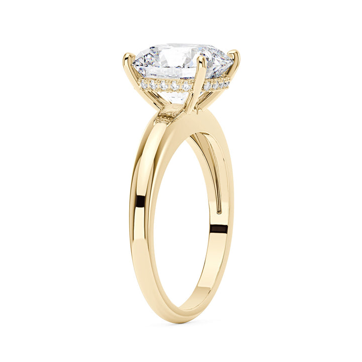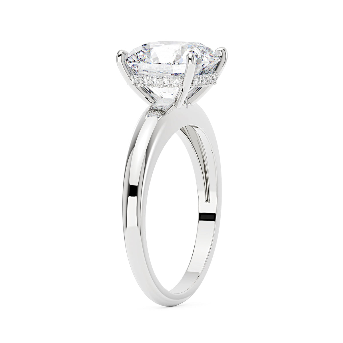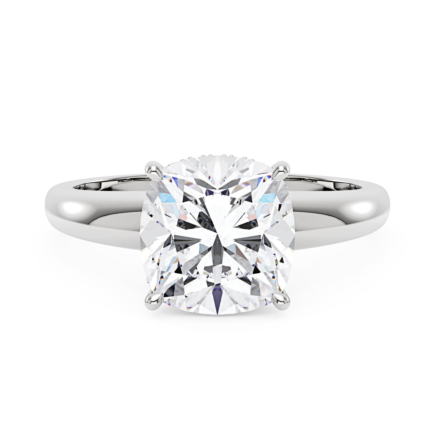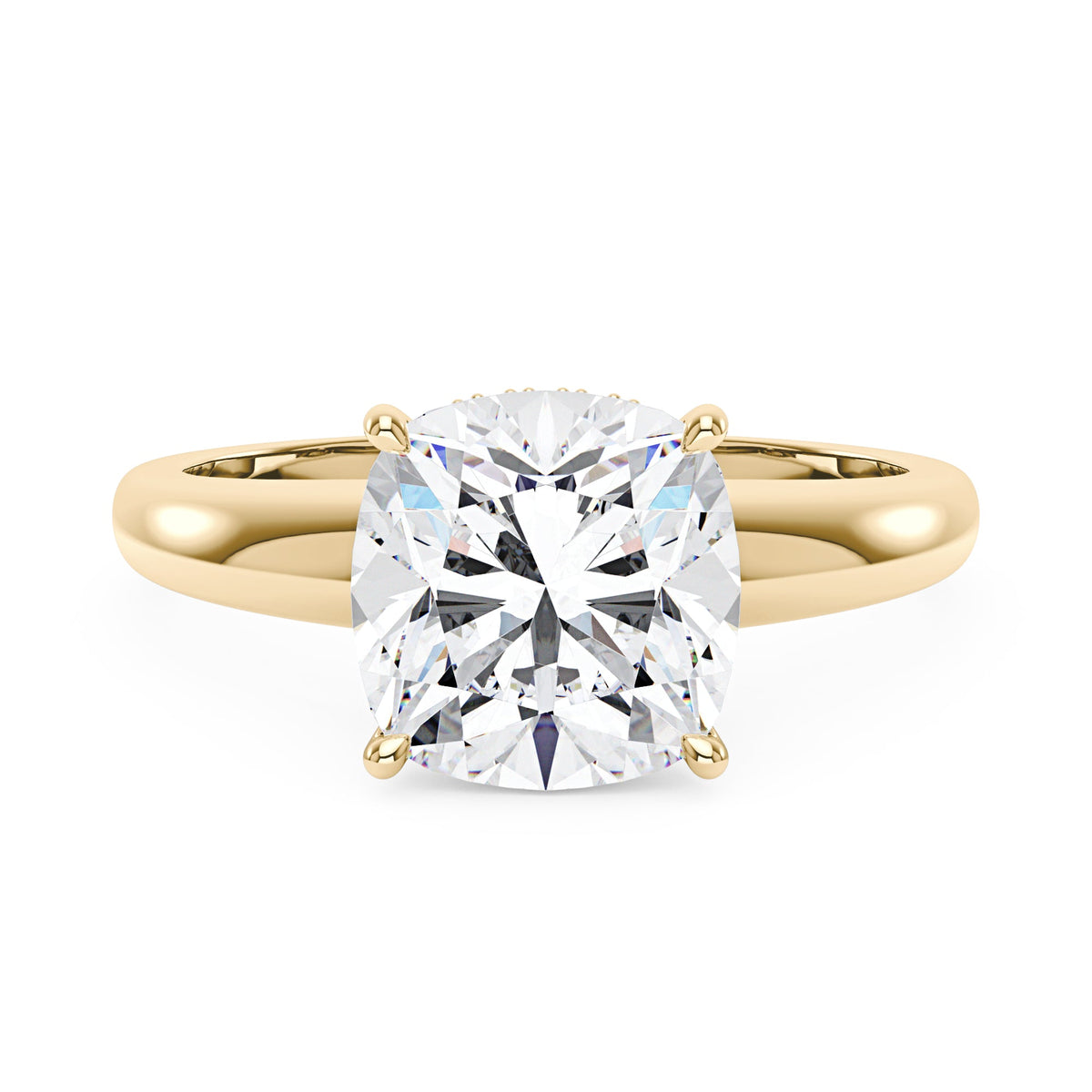 Handcrafted in 18K gold vermeil over S925 sterling silver. Center stone: 5 ct elongated cushion moissanite (9 mm x 11 mm), colorless, VVS1 clarity, E-F grade. Ring sizes 3-15 US. Shank width: 2.3 mm; shank base width: 1.8 mm; shank depth: 1.7 mm; shank base depth: 1.4 mm.