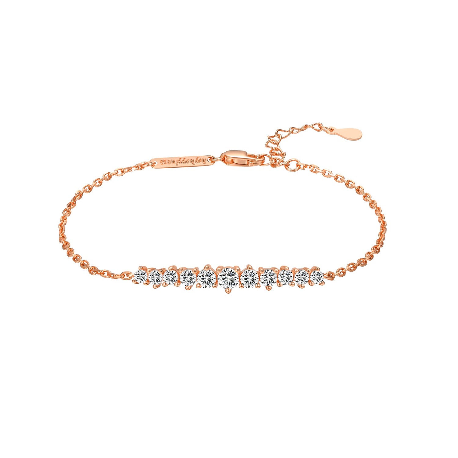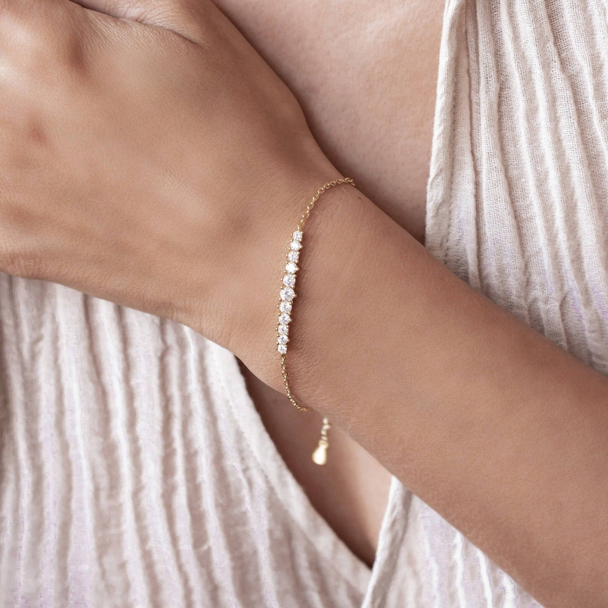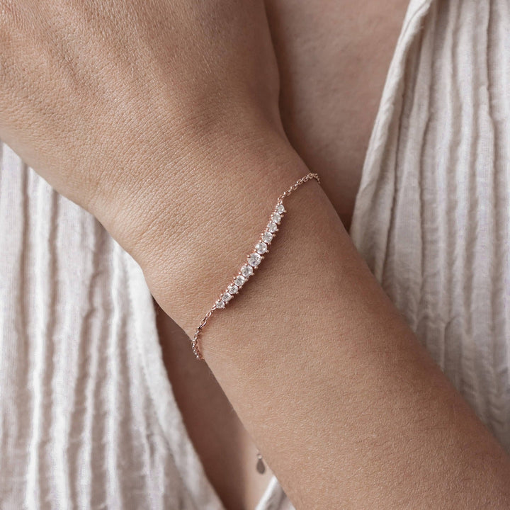 This Tennis Glow Bracelet Sterling Silver by Hey Happiness is a classic and delicate tennis-style bracelet adorned with a row of shimmering stones that catch light beautifully. Its timeless design is perfect for daily wear or layering for added sparkle, available in gold, rose gold, and silver.