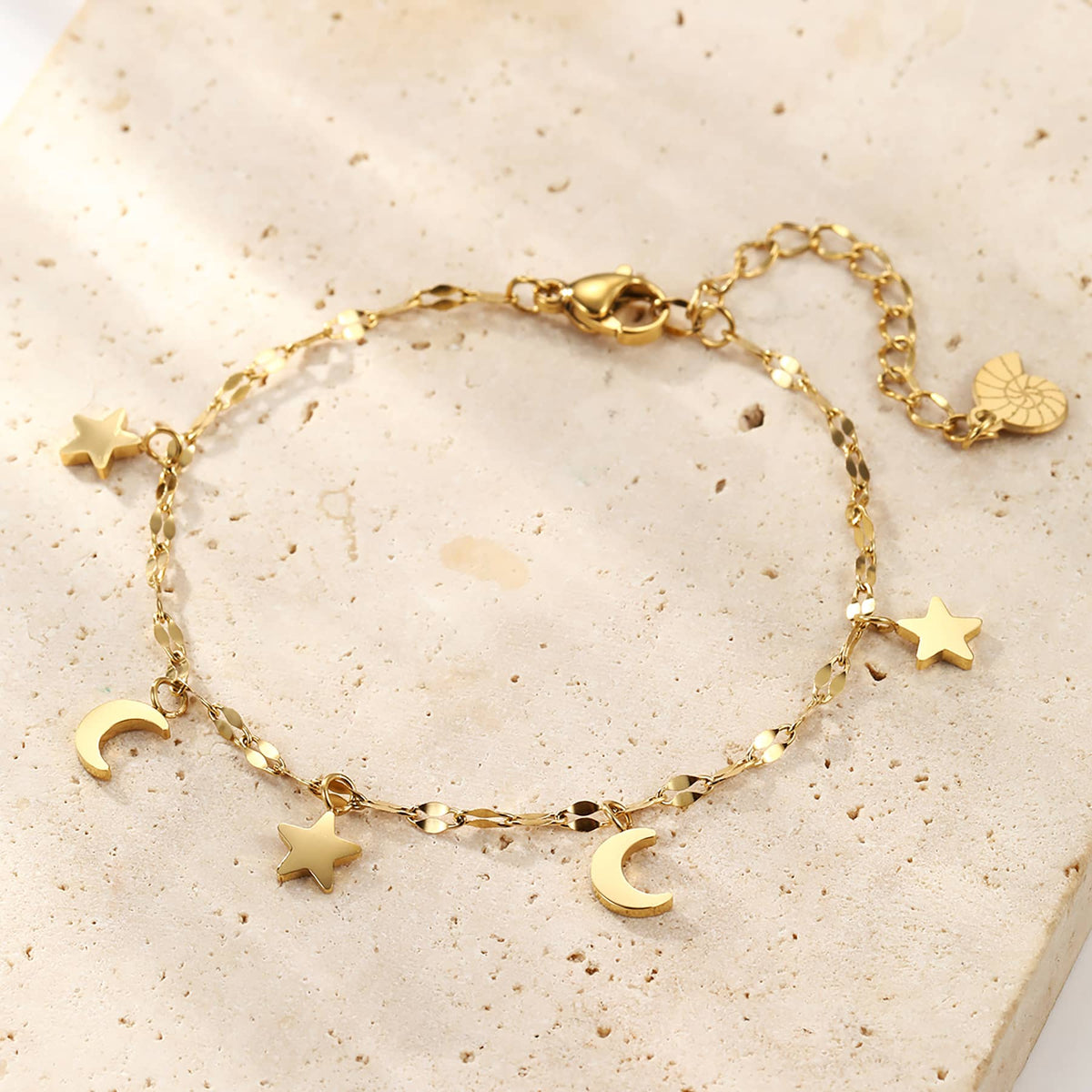 Made from waterproof stainless steel with polished gold finish; features star and moon charms; lobster claw clasp.