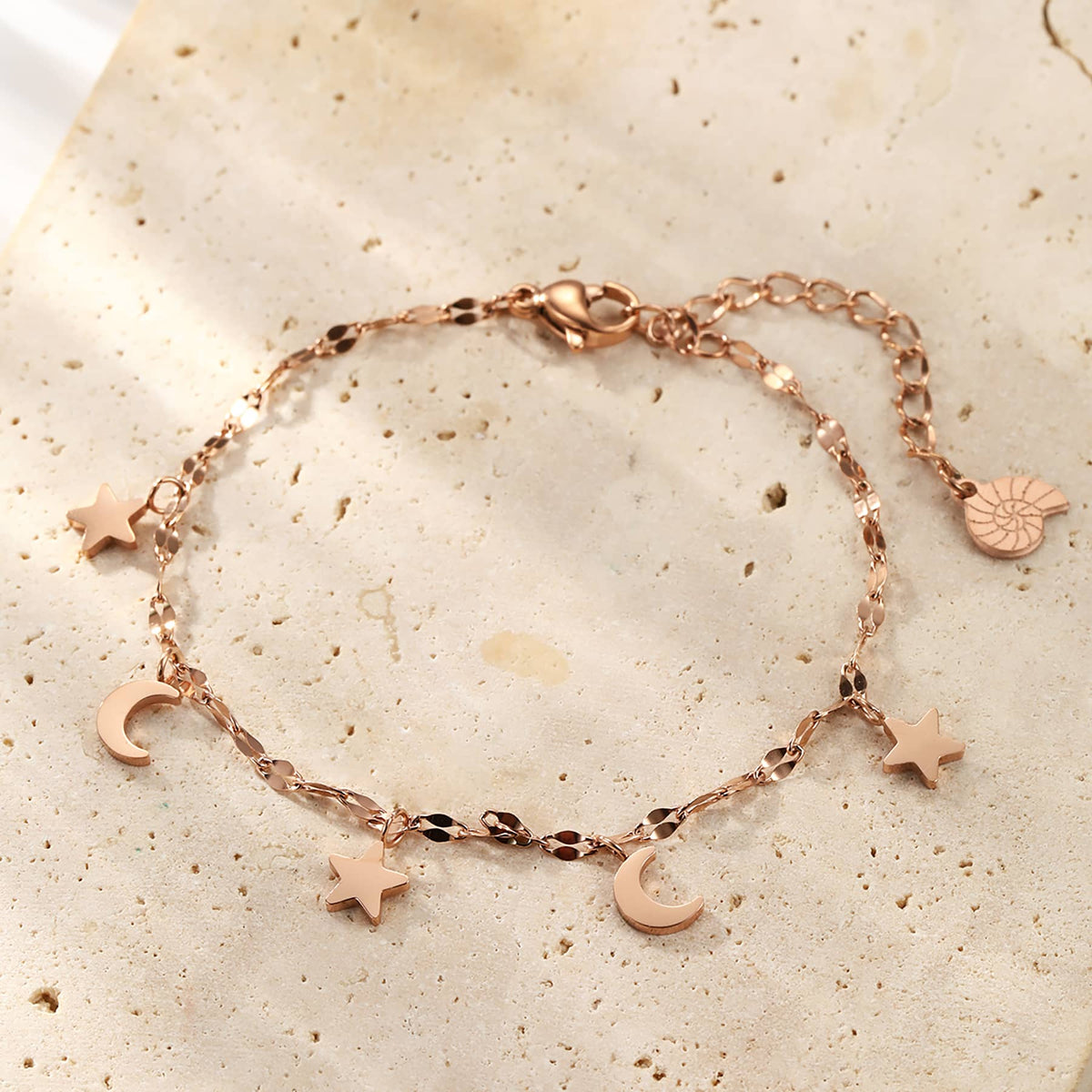 This Star and Moon Bracelet by Hey Happiness adds celestial charm with delicate star and moon charms adorning a fine chain. Waterproof and durable, it offers versatility with finishes in gold, rose gold, and silver, secured by a reliable claw lobster clasp for everyday wear.
