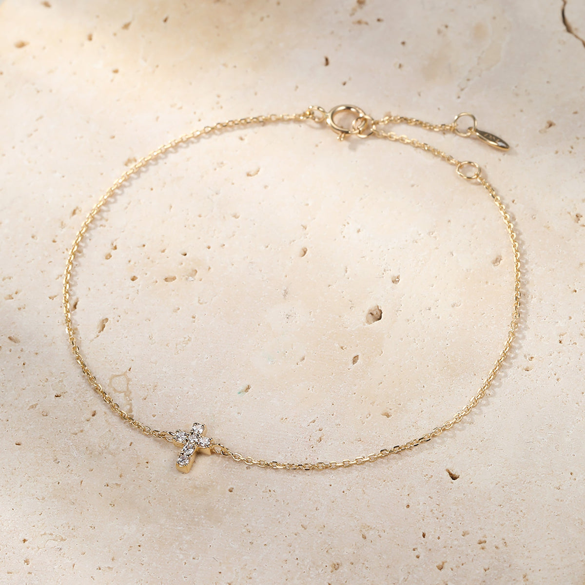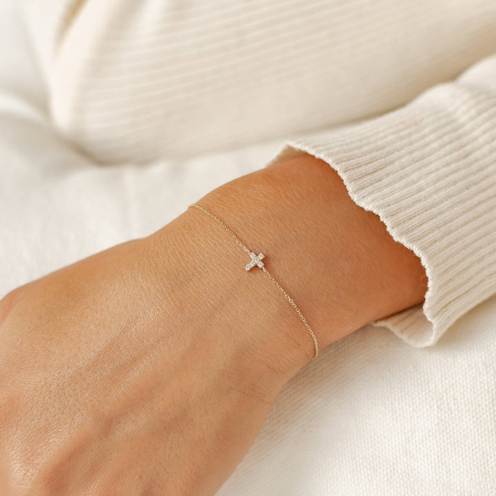This Hope Bracelet by Hey Happiness is a delicate and meaningful piece crafted from high-quality 14K gold. Featuring a fine chain centered with a powerful cross charm, it symbolizes hope, strength, and resilience. This elegant bracelet serves as a beautiful reminder of personal fortitude and optimism.