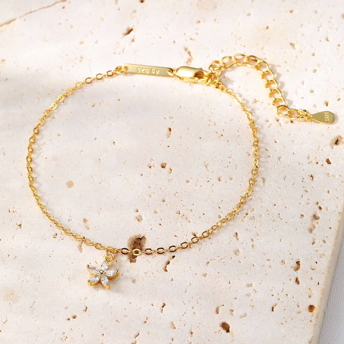 This Gemstone Daisy Chain Bracelet Sterling Silver by Hey Happiness adds floral charm to your wrist with a delicate sterling silver chain and a central zirconia daisy charm. The design embodies youthful spirit and elegance, perfect for layering or as a standalone statement. Available in silver and gold finishes.