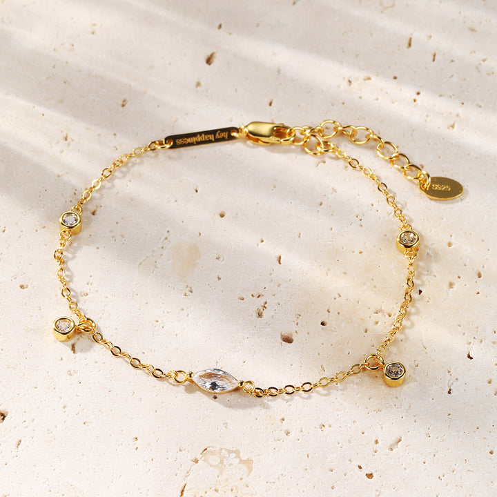 This Dazzle Chain Bracelet by Hey Happiness is an elegant 18 karat gold-plated sterling silver piece featuring five zirconia stones—two round stones set in gold, two round stones hanging from the chain, and one oval-shaped stone. The lobster clasp secures this modern yet vintage-inspired bracelet, designed to infuse everyday wear with a touch of refined opulence.