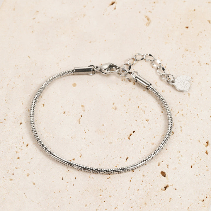 This Round Snake Chain Bracelet by Hey Happiness is a sleek and versatile stainless steel accessory featuring a rounded snake chain design. The bracelet is finished with crimp ends, a lobster claw spring clasp, and a short extension chain that carries a signature flat shell pendant—a subtle nod to the brand’s identity. Effortlessly elegant, this bracelet pairs beautifully with heirloom pendants or stands out on its own for everyday sophistication.