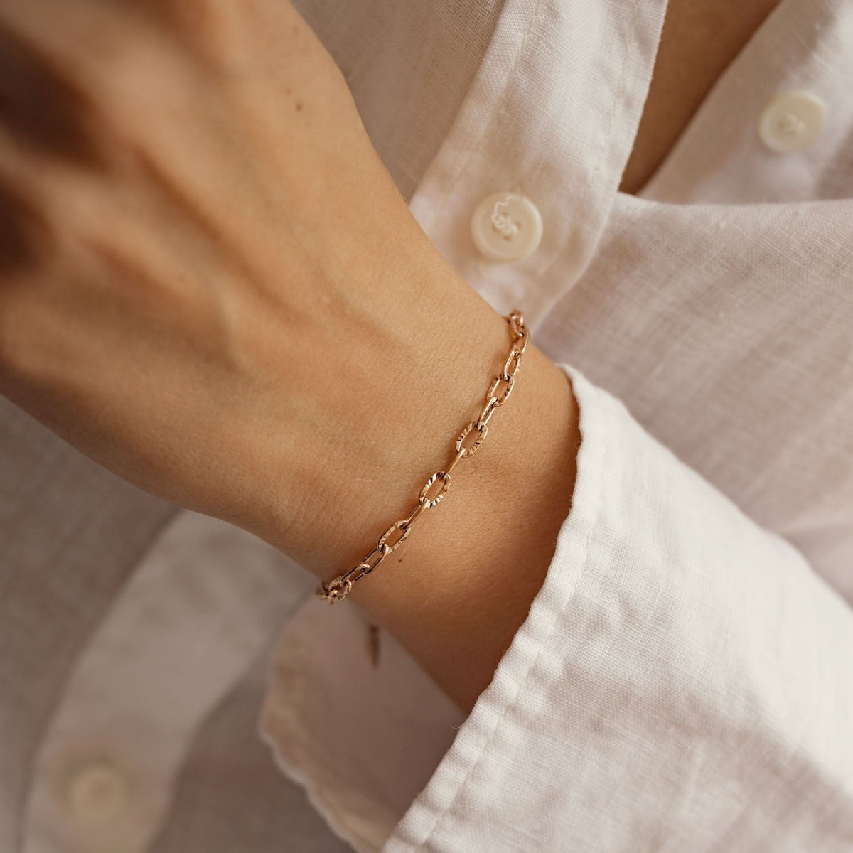 This Textured Link Chain Bracelet Rose Gold by Hey Happiness features oval-shaped rose gold-plated stainless steel links with an engraved texture. It closes with a lobster claw clasp and has an extension chain with a shell charm, offering a stylish and adjustable daily-wear bracelet.