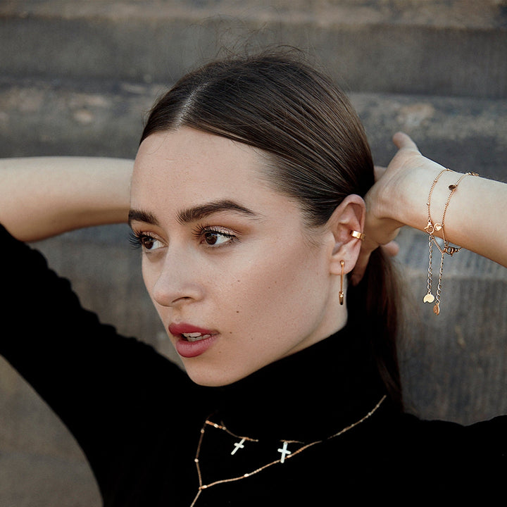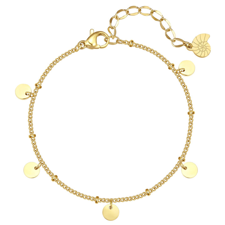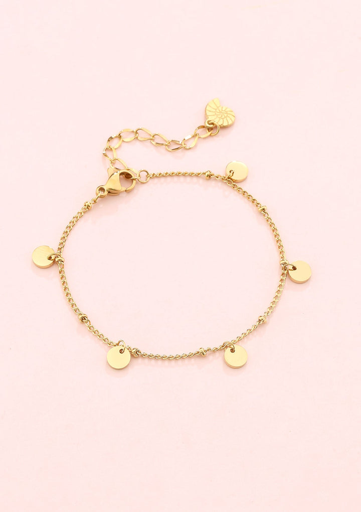 These Circles Bobble Chain Bracelets by Hey Happiness showcase a delicate interplay of minimalist design and tactile texture. The thin chain is elegantly punctuated by small metallic beads alternating with smooth round disc pendants that encircle the wrist, creating a rhythmic visual and textural appeal. Symbolizing continuity and unity through its circular motifs, this bracelet conveys a subtle message of harmony and balance. Designed for versatility, it is perfect for wearing alone as a refined statement or stacked alongside other bracelets for a layered, personalized look. The adjustable length with a charming flat shell detail adds a touch of coastal inspiration and adaptability to any wrist size.