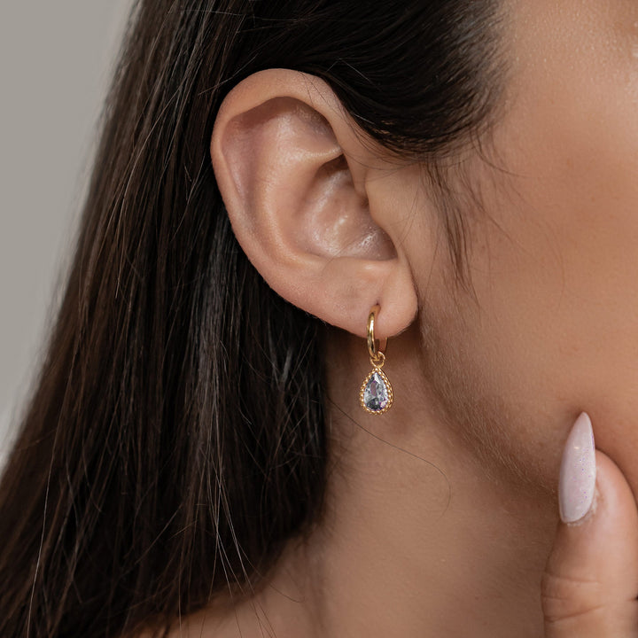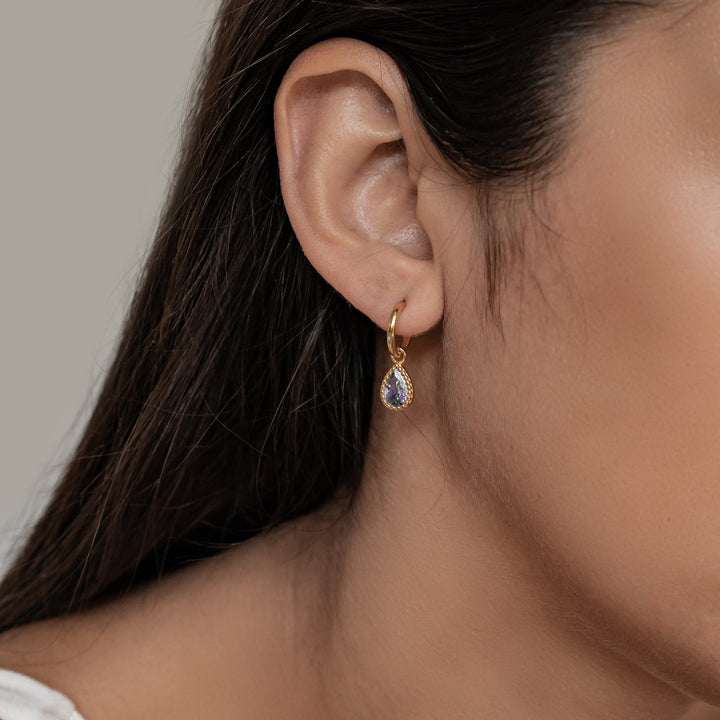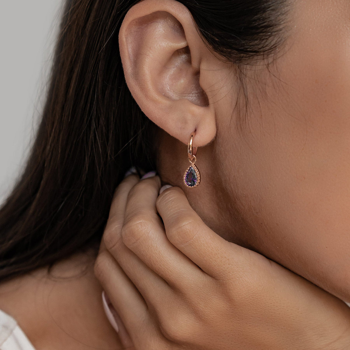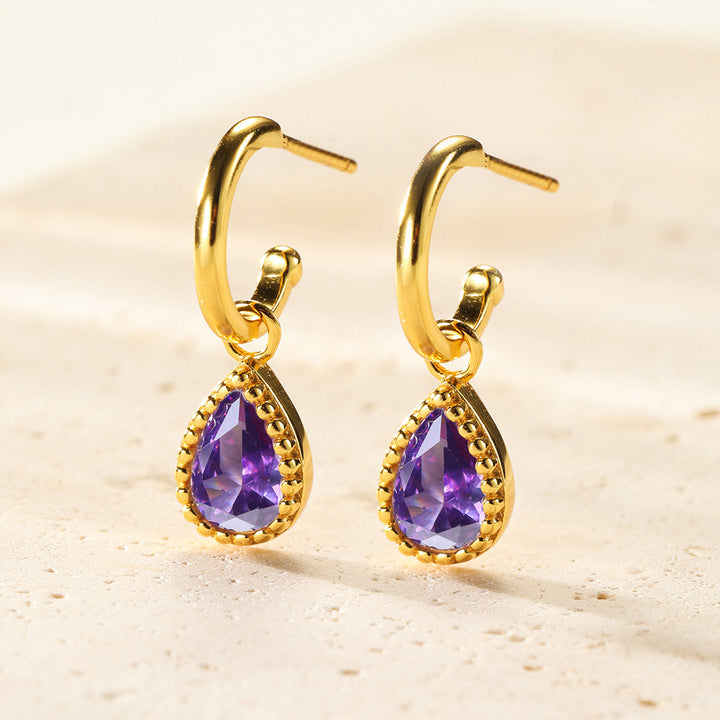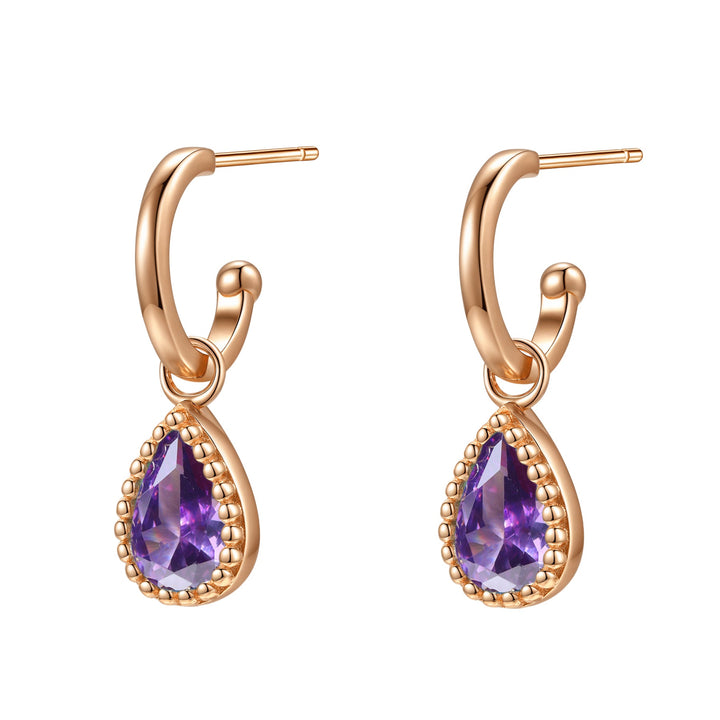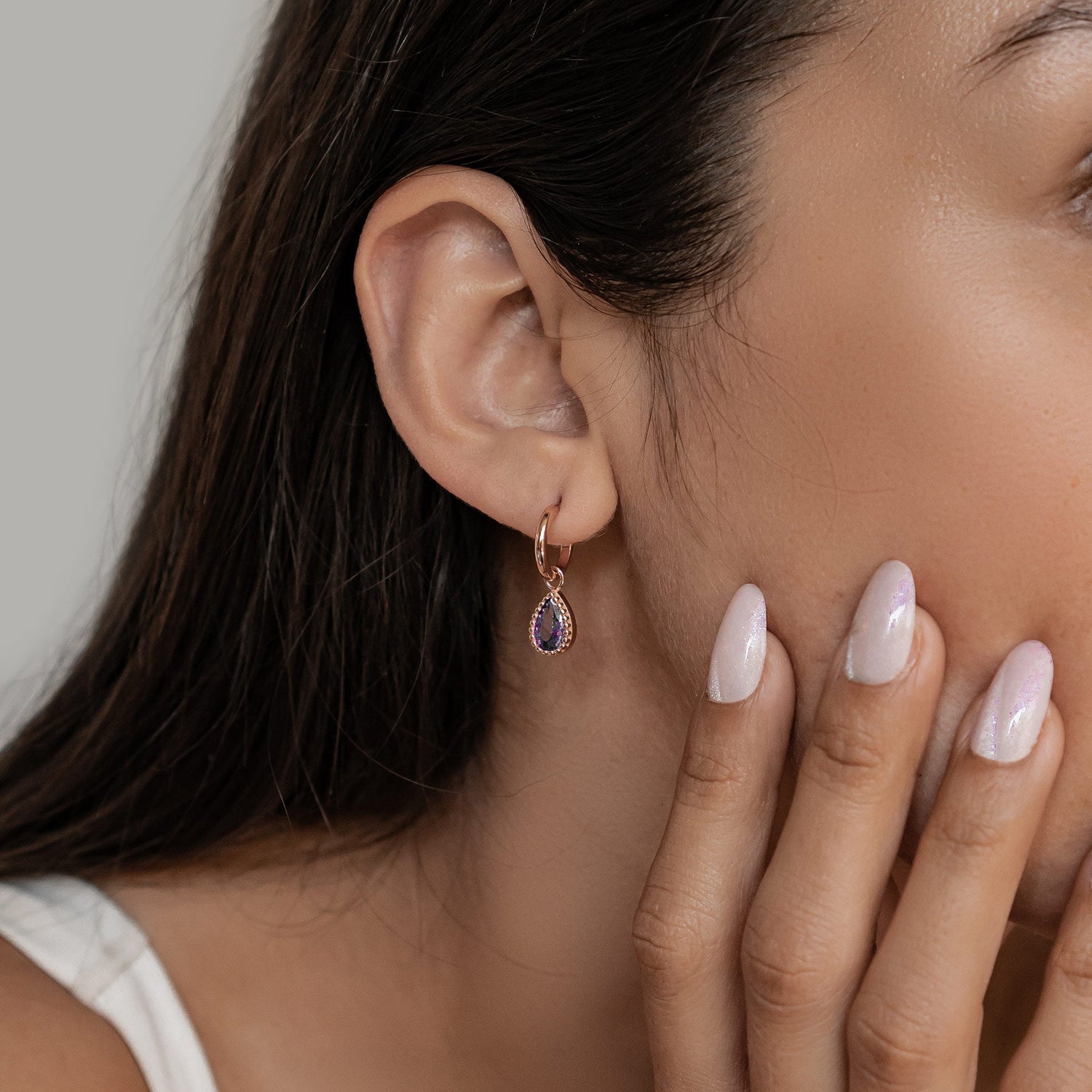 Handcrafted in 925 sterling silver with a teardrop-shaped Amethyst gemstone approximately 6 mm in size. Hoop diameter approx. 25 mm. Available in sterling silver, 18 karat gold-plated sterling silver, and rose gold-plated sterling silver.