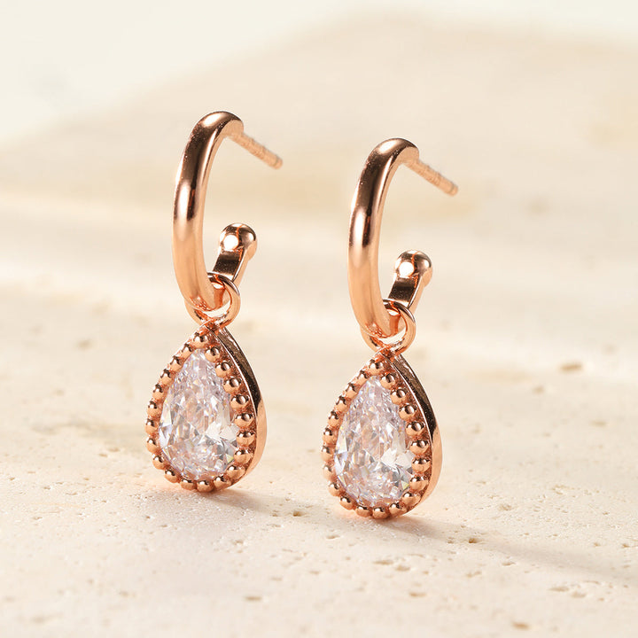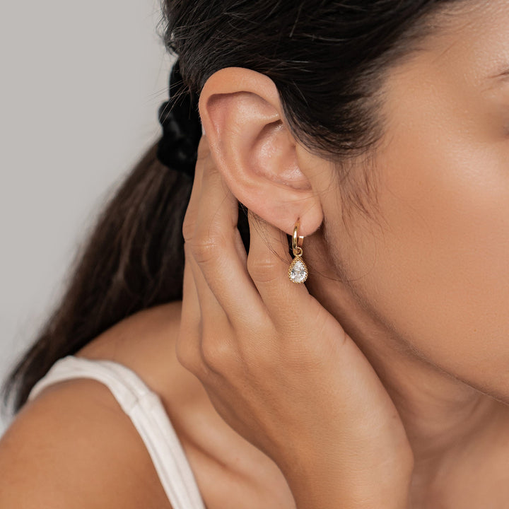 Sterling silver hoops with teardrop pendant. Available with 18K gold plating and rose gold plating.