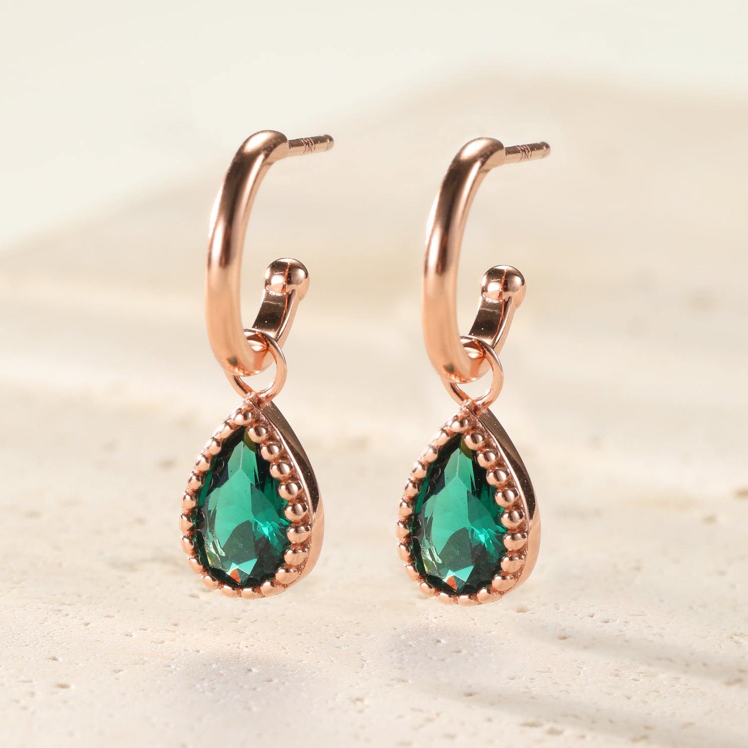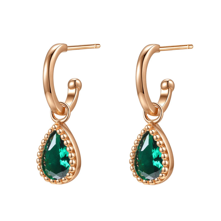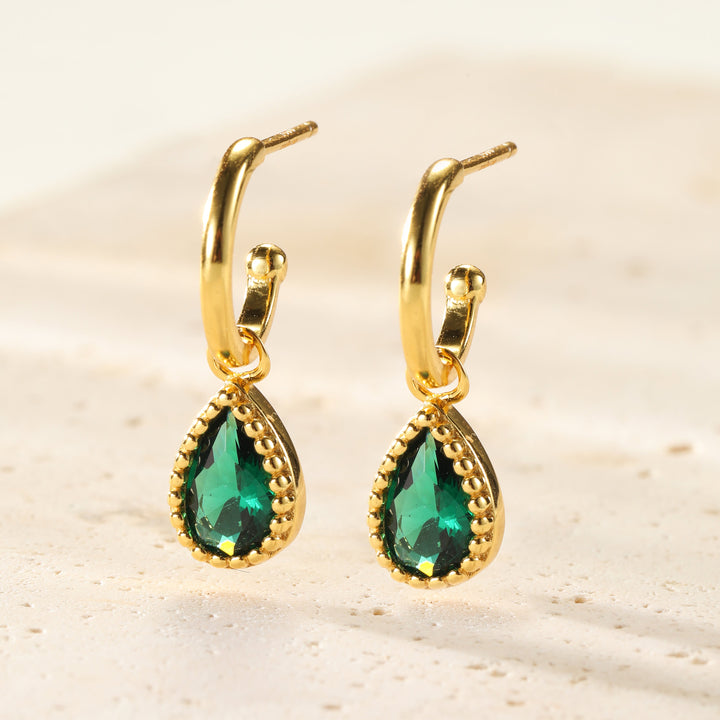 Sterling silver hoops with emerald teardrop pendant. Available with 18K gold plating and rose gold plating.