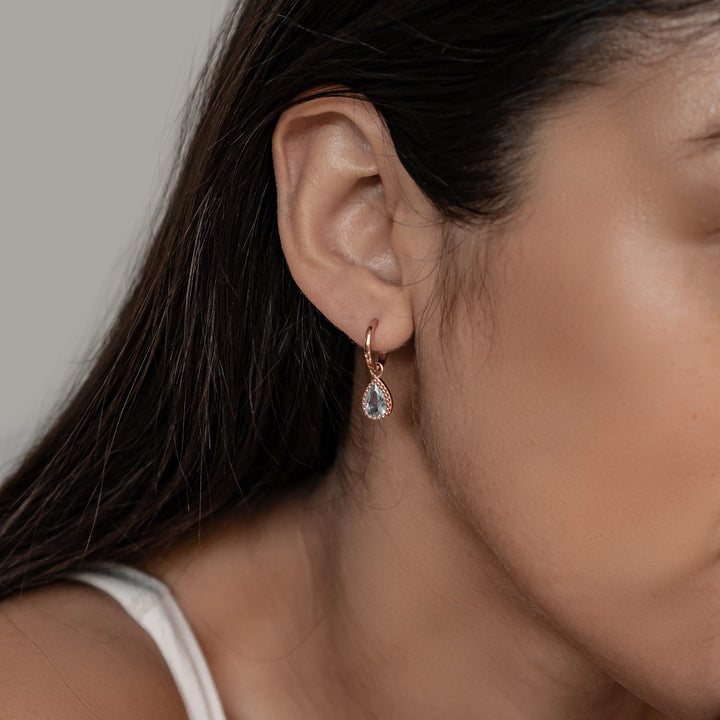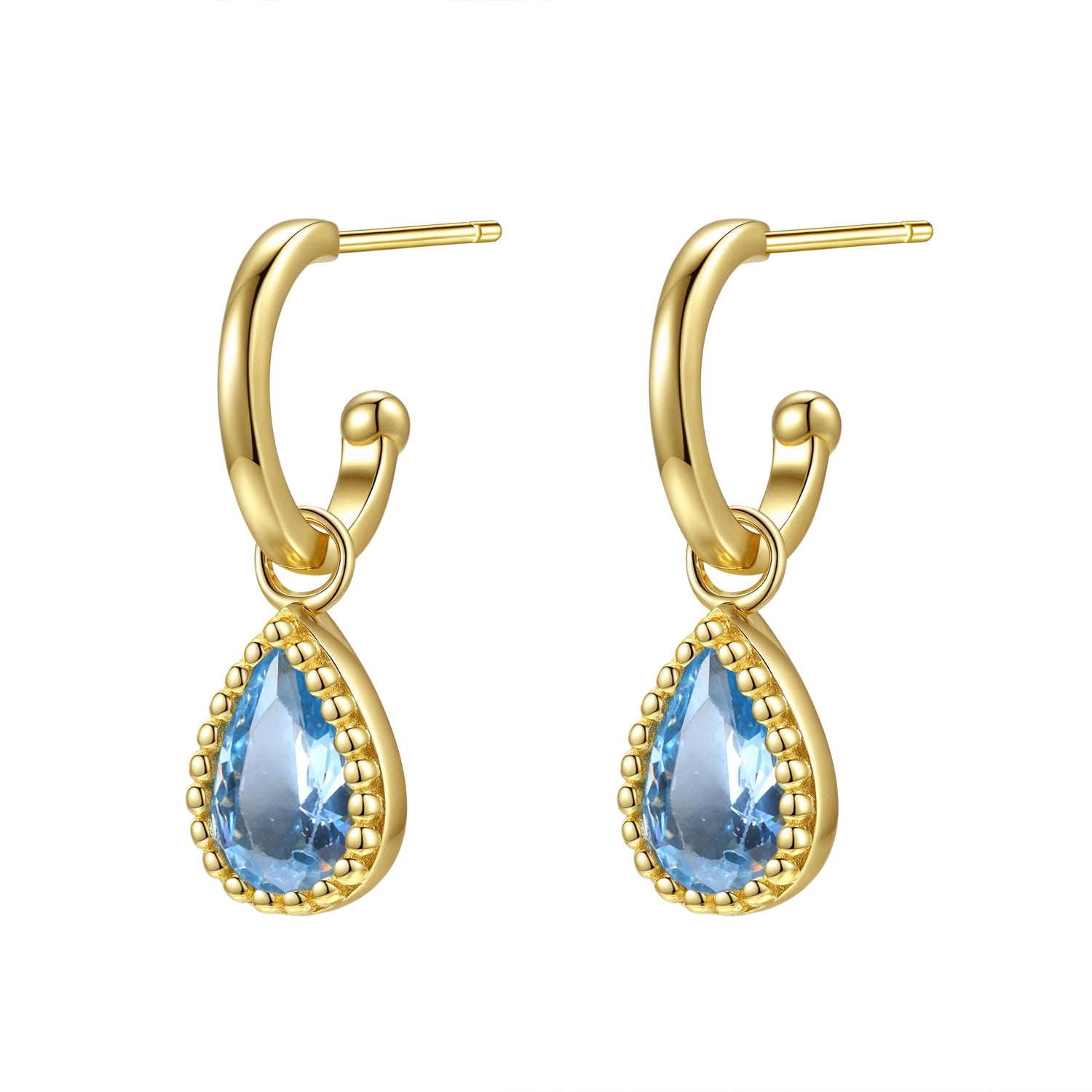 Sterling silver with blue topaz gemstones. Available in 18K gold plating, rose gold plating, and silver. Hoop earrings.