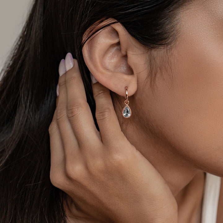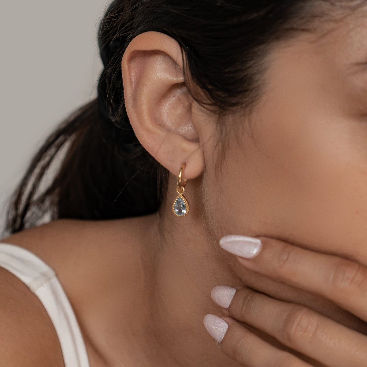 These December Blue Topaz Birthstone Hoop Earrings by Hey Happiness celebrate creativity, joy, and abundance with their stunning blue topaz stones. Crafted in sterling silver, they are an ideal gift for those born in December or anyone drawn to the calming and joyful energy of blue topaz. Available in gold, rose gold, and silver finishes, these hoops blend birthstone symbolism with versatile elegance.